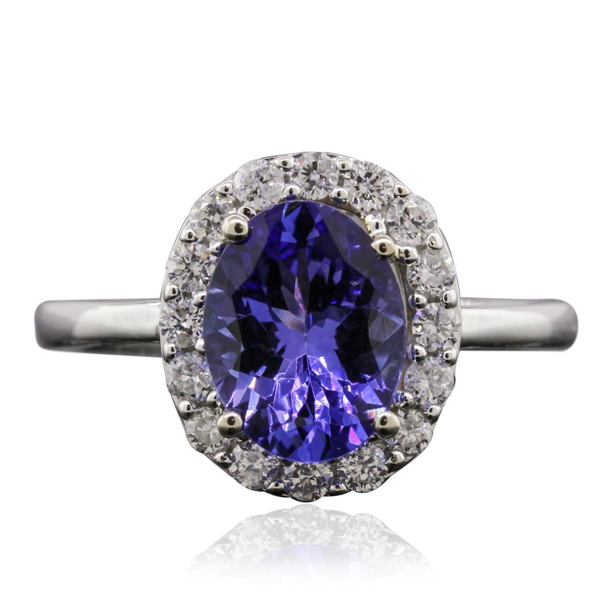One electronically tested 14KT white gold Ladies combination cast & assembled ring with a bright polish finish. Condition is new. Identified with markings of "14K". Containing: Sixteen prong set round brilliant cut diamonds, measuring 1.80 - 1.80 x 1.08mm (depth est.) approximate total weight of 16 Stones = 0.34ct. Clarity: I-1. Color: H - I, Cut is Good. One prong set oval modified brilliant cut natural tanzanite, measuring 9.30 x 7.40 x 4.81mm, approximate weight of 2.25ct., clarity is eye clean, type I, medium, moderately strong, bluish violet color, (GIA bV 5/4), cut is good. Colored gemstones are presumed to have been subjected to commonly used enhancement processes. All diamonds and colored gemstones are graded in the mounting, unless otherwise stated. Total Weight of Colored Stones 2.25ct. Total Weight of Diamonds 0.34ct. Total Weight of Ring 3.60 grams. GGL Appraised at $5,105.00.