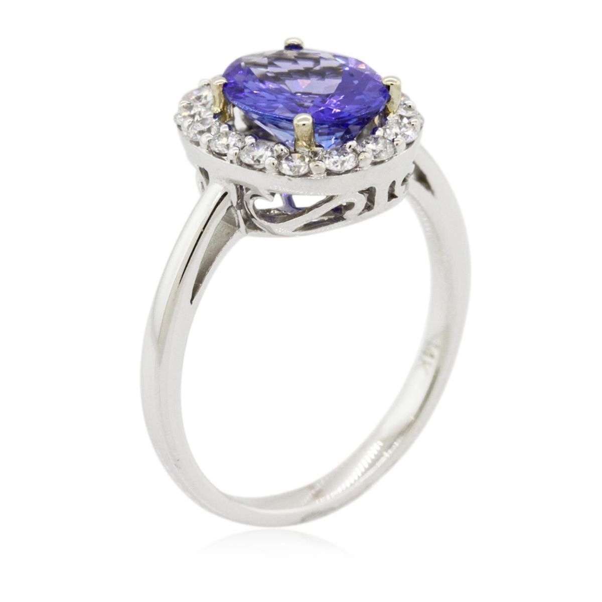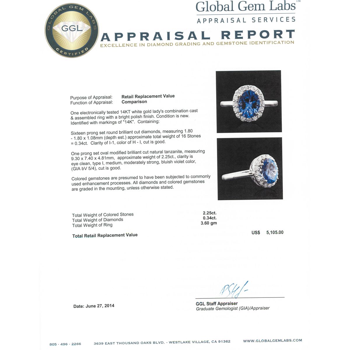 One electronically tested 14KT white gold Ladies combination cast & assembled ring with a bright polish finish. Condition is new. Identified with markings of "14K". Containing: Sixteen prong set round brilliant cut diamonds, measuring 1.80 - 1.80 x 1.08mm (depth est.) approximate total weight of 16 Stones = 0.34ct. Clarity: I-1. Color: H - I, Cut is Good. One prong set oval modified brilliant cut natural tanzanite, measuring 9.30 x 7.40 x 4.81mm, approximate weight of 2.25ct., clarity is eye clean, type I, medium, moderately strong, bluish violet color, (GIA bV 5/4), cut is good. Colored gemstones are presumed to have been subjected to commonly used enhancement processes. All diamonds and colored gemstones are graded in the mounting, unless otherwise stated. Total Weight of Colored Stones 2.25ct. Total Weight of Diamonds 0.34ct. Total Weight of Ring 3.60 grams. GGL Appraised at $5,105.00.
