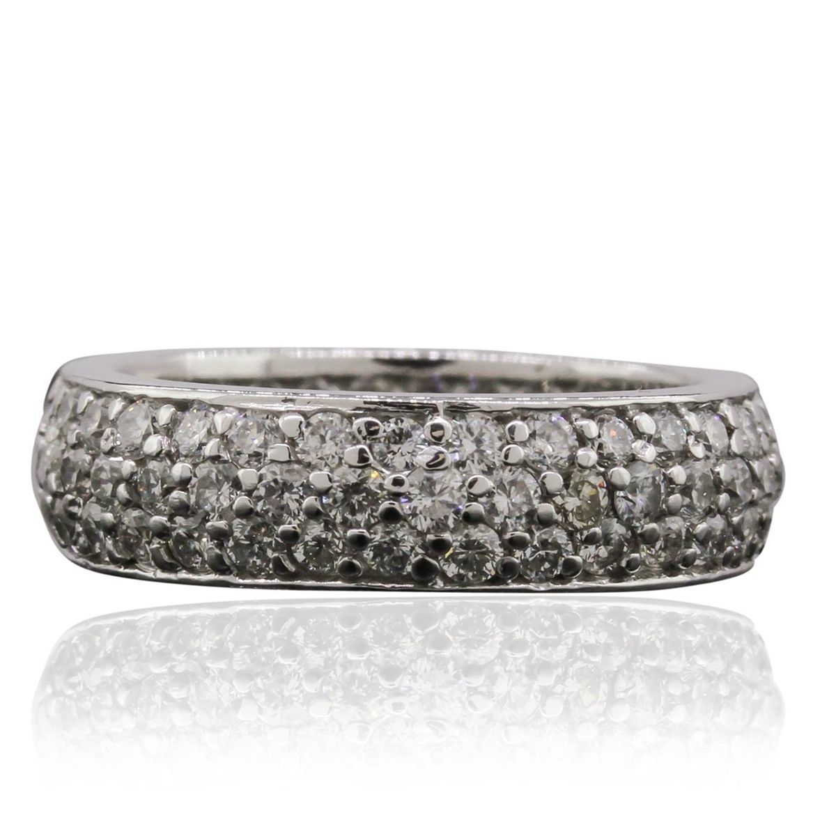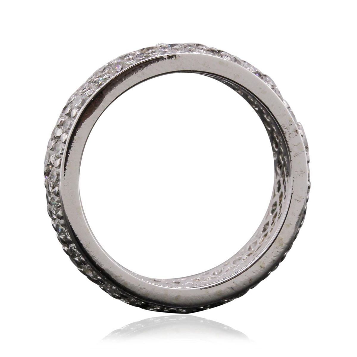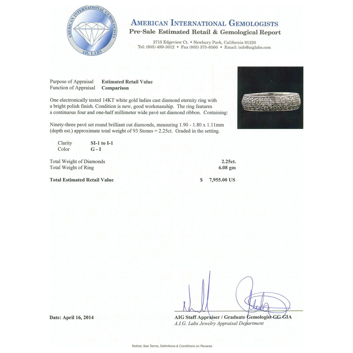 One electronically tested 14KT white gold ladies cast diamond eternity ring with a bright polish finish. Condition is new, good workmanship. The ring features a continuous four and one-half millimeter wide pave‚ set diamond ribbon. Containing: Ninety-Three pave‚ set round brilliant cut diamonds, measuring 1.90 - 1.80 x 1.11mm (depth est.) approximate. Total Weight of 93 Stones = 2.25ct. Graded in the setting. Clarity: SI-1 to I-1. Color: G - I. Total Weight of Diamonds 2.25ct. Total Weight of Ring 6.08 grams. AIG Appraised at $7,955.00.