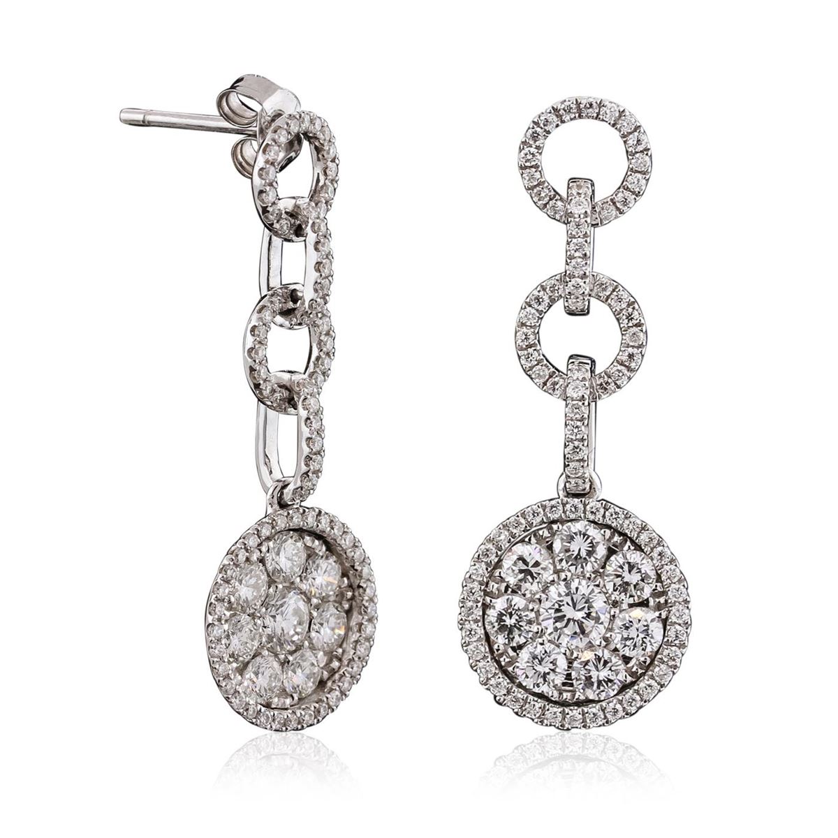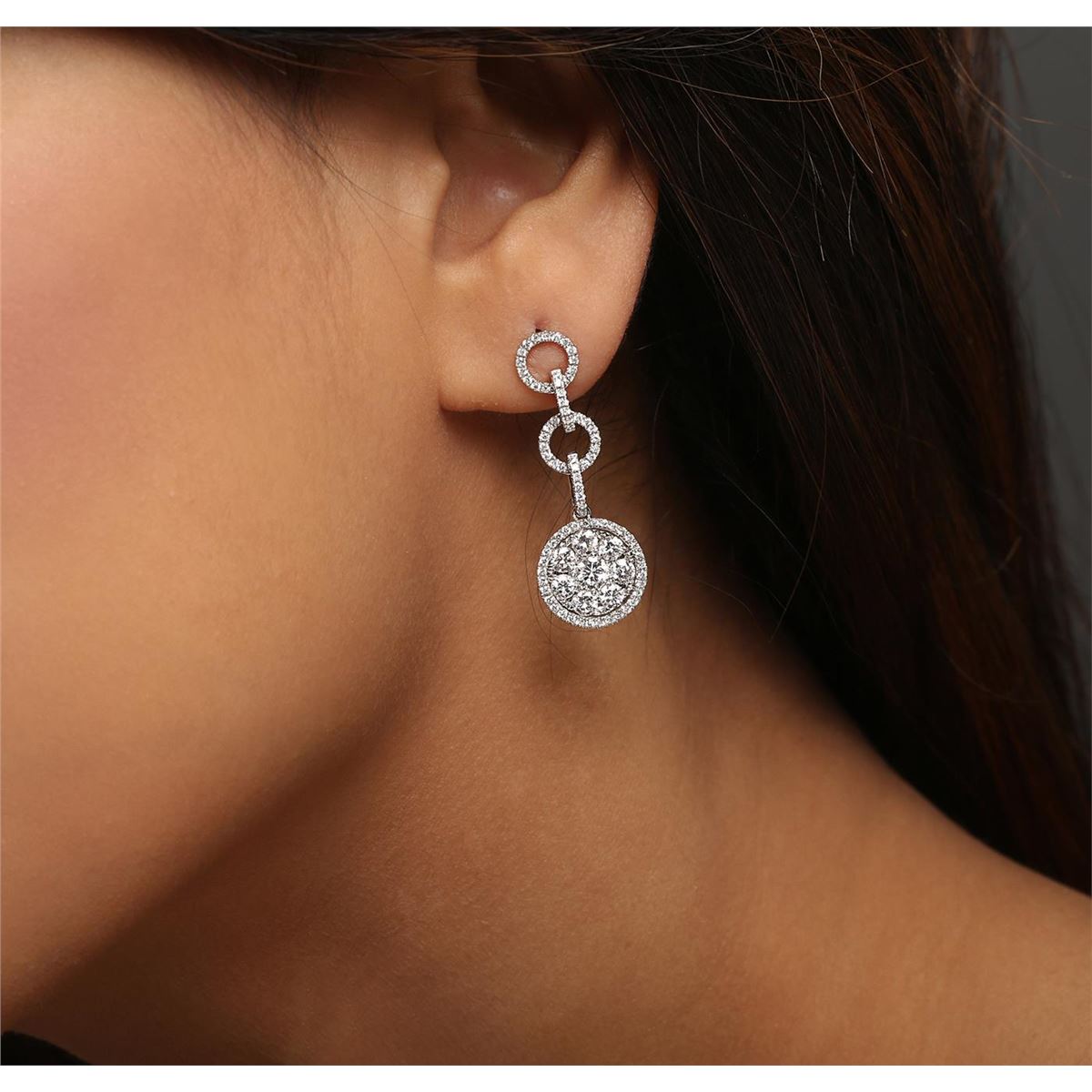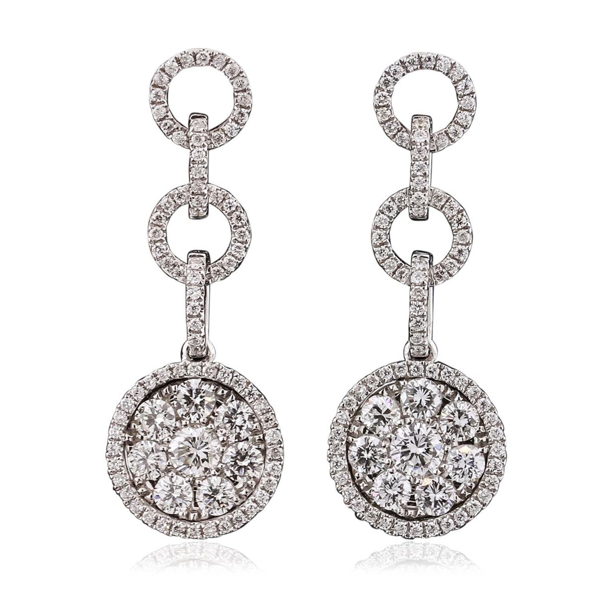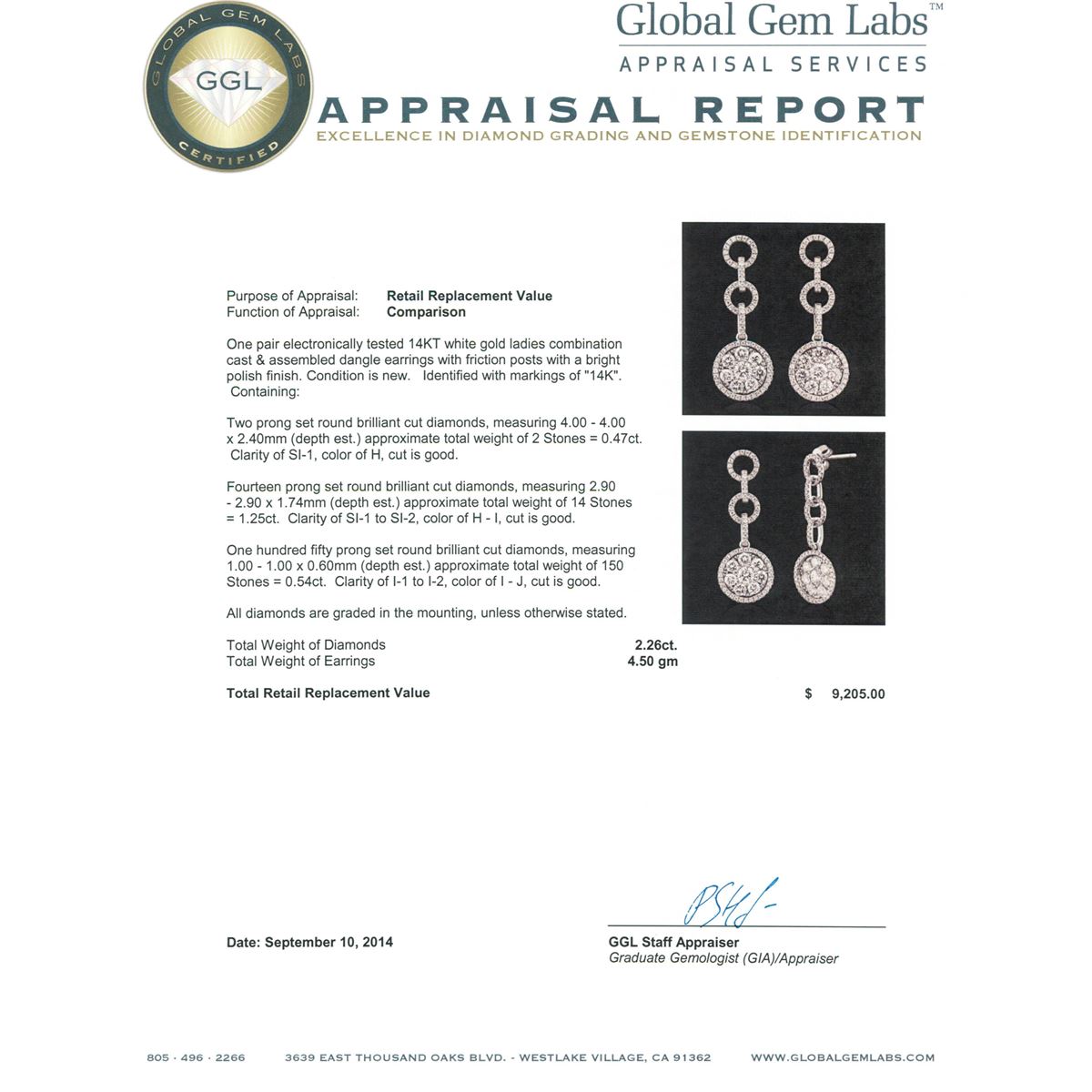 One pair electronically tested 14KT white gold ladies combination cast & assembled dangle earrings with friction posts with a bright polish finish. Identified with markings of "14K". Condition is new. Containing: Two prong set round brilliant cut diamonds, measuring 4.00 - 4.00 x 2.40mm (depth est.) approximate total weight of 2 Stones = 0.47ct. Clarity: SI-1. Color: H, Cut is Good. Fourteen prong set round brilliant cut diamonds, measuring 2.90 - 2.90 x 1.74mm (depth est.) approximate total weight of 14 Stones = 1.25ct. Clarity: SI-1 to SI-2. Color: H - I, Cut is Good. One Hundred Fifty prong set round brilliant cut diamonds, measuring 1.00 - 1.00 x 0.60mm (depth est.) approximate total weight of 150 Stones = 0.54ct. Clarity: I-1 to I-2. Color: I - J, Cut is Good. All diamonds are graded in the mounting, unless otherwise stated. Total Weight of Diamonds 2.26ct. Total Weight of Earrings 4.50 grams. GGL Appraised at $9,205.00.