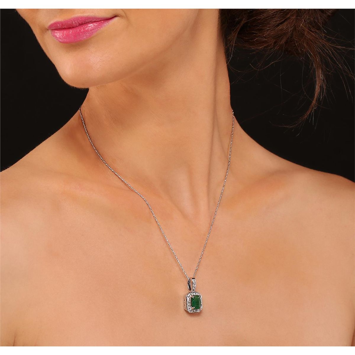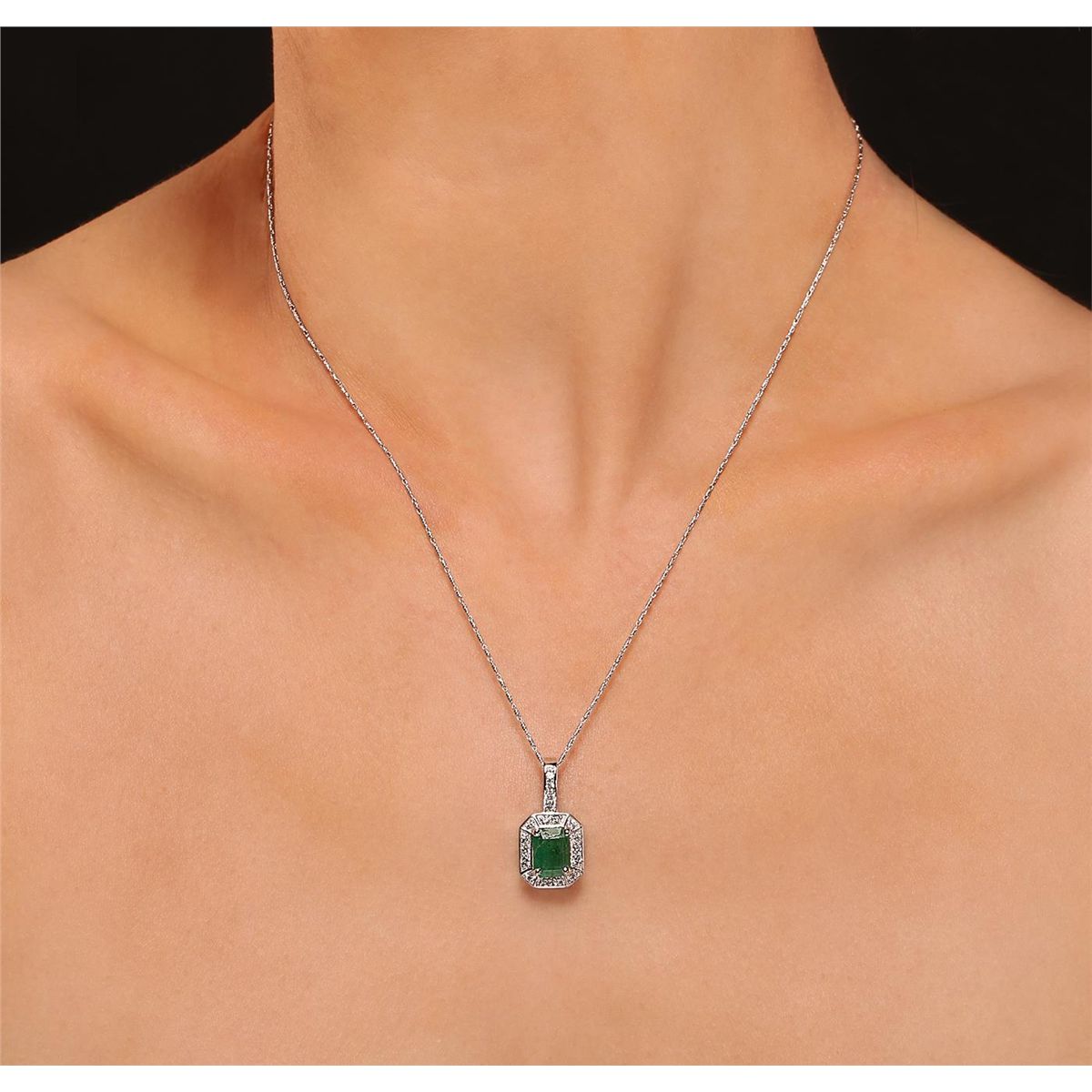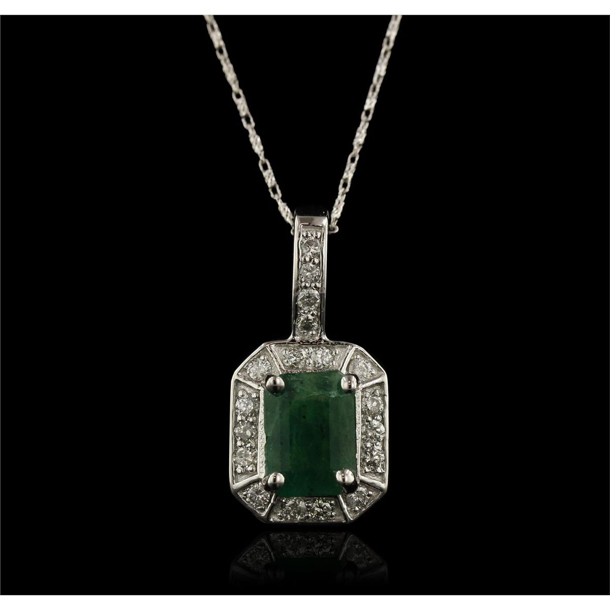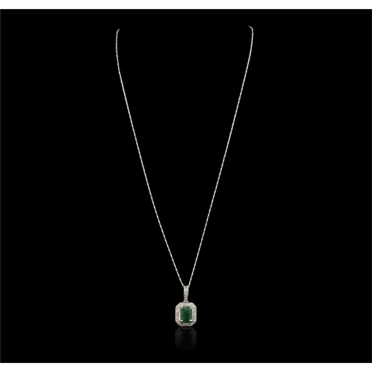 One electronically tested 14KT white gold ladies cast & assembled emerald and diamond pendant with chain. Condition is new, good workmanship. The pendant features an emerald set within a diamond bezel, completed by a diamond set bail. The pendant is supported by an eighteen inch length 14KT white gold designer style chain terminating in a lobster claw clasp. Bright polish finish. Containing: One prong set rectangular step cut natural emerald, measuring 9.40 x 7.00 x 3.90mm, 8%. bulge factor, approximate weight of 2.26ct., clarity is severely included, type III, medium dark, moderately strong, very slightly bluish green color, (GIA vslbG 6/4), cut is good. Transmitting light very diffusely, opaque. Naturally occurring internal & external characteristics are present. Indications of oil residue. Graded in the setting. Eighteen bead set round brilliant cut diamonds, measuring 1.90 - 1.80 x 1.11mm (depth est.) approximate. Total Weight of 18 Stones = 0.51ct. Graded in the setting. Clarity: SI-2 to I-2. Color: G - I. Total Weight of Colored Stones 2.26ct. Total Weight of Diamonds 0.51ct. Total Weight of Pendant With Chain 7.20 grams. AIG Appraised at $3,270.00.