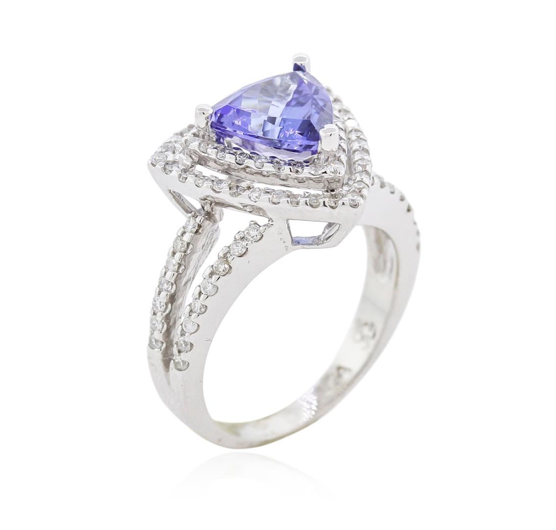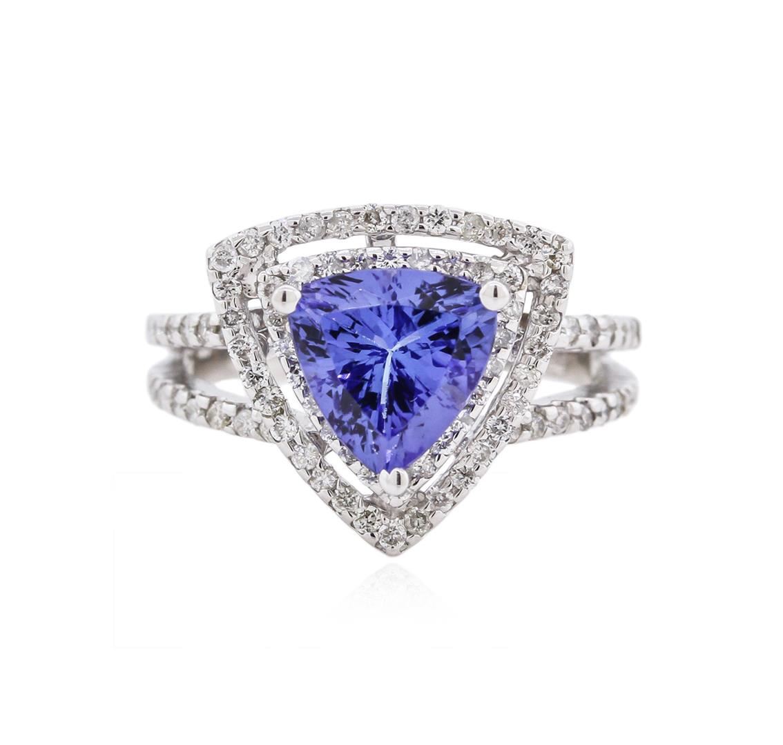 One polished, stamped, and tested 14K white gold ring mounted with: 1 genuine tanzanite center stone weighing 2.27 carat, and 87 genuine round diamonds weighing 0.63 carats. This item weighs 5.8 grams, condition is new, excellent workmanship. MAIN GEMSTONE: Species: Natural Zoisite. Variety: Tanzanite. Shape: Triangular. Cutting Style: Modified Brilliant Cut. Measurements: 8.5 x 8.5 x 5.3 mm. Weight: 2.27 carat. Color: Violetish Blue. Cut Grade: Very Good. Refractive Index: 1.691 - 1.700 DR. Birefringence: 0.008 - 0.013. Hardness: 6.5 - 7. ADJACENT GEMSTONES ON RING: Identity: Natural Diamond. Shape: Round. Cutting Style: Brilliant Cut. Quantity: 87 Diamonds. Measurements: 1.0 mm. Total Weight: 0.63 carats. Clarity Grade: SI2 - SI3. Color Grade: H - I. Refractive Index: 2.418. Hardness: 10. Tanzanite Weight: 2.27 ct. Total Diamond Weight: 0.63 cts. Weight of Item: 5.8 grams. Gold Content: 14K White Gold. AIGL Appraised at $8,600.00.
