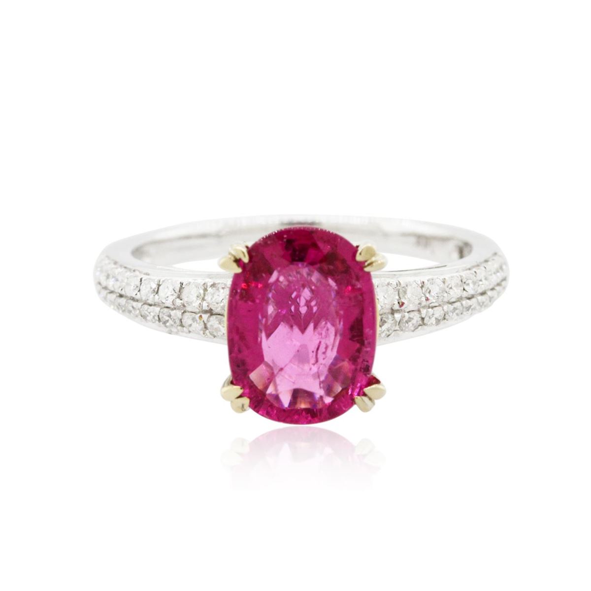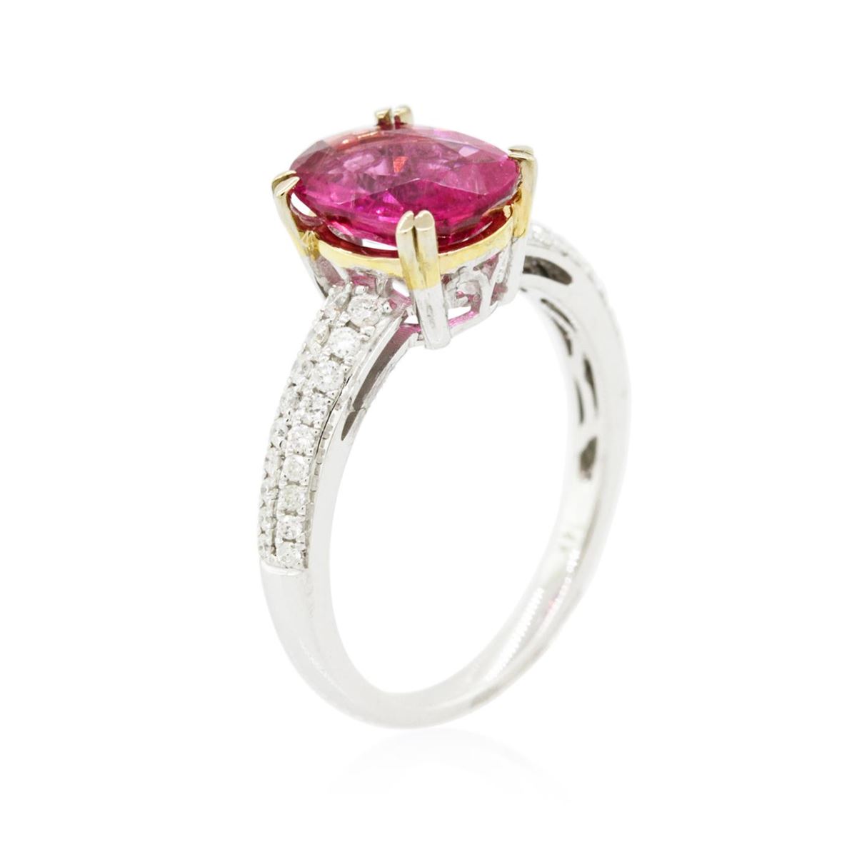 One electronically tested 14KT white gold ladies cast tourmaline and diamond ring with a bright polish finish. Condition is new, good workmanship. The featured tourmaline is supported by diamond set shoulders, completed by a one and one-half millimeter wide band. Identified with markings of "14K". Containing: One prong set oval mixed cut natural pink tourmaline, measuring 9.75 x 7.15 x 4.80mm, 8%. bulge factor, approximate weight of 2.27ct., type II Clarity is moderately included, medium dark, very slightly brownish, purplish pink color, (GIA pPi 6/3), cut is good. Naturally occurring internal & external characteristics are present. Graded in the setting. Thirty-Six pav‚ set round brilliant cut diamonds, measuring 1.40 - 1.10 x 0.75mm (depth est.) approximate. Total Weight of 36 Stones = 0.35ct. Graded in the setting. Clarity: SI-1 to I-1. Color: G - I. Total Weight of Colored Stones 2.27ct. Total Weight of Diamonds 0.35ct. Total Weight of Ring 3.46grams. AIG Appraised at $1,855.00.