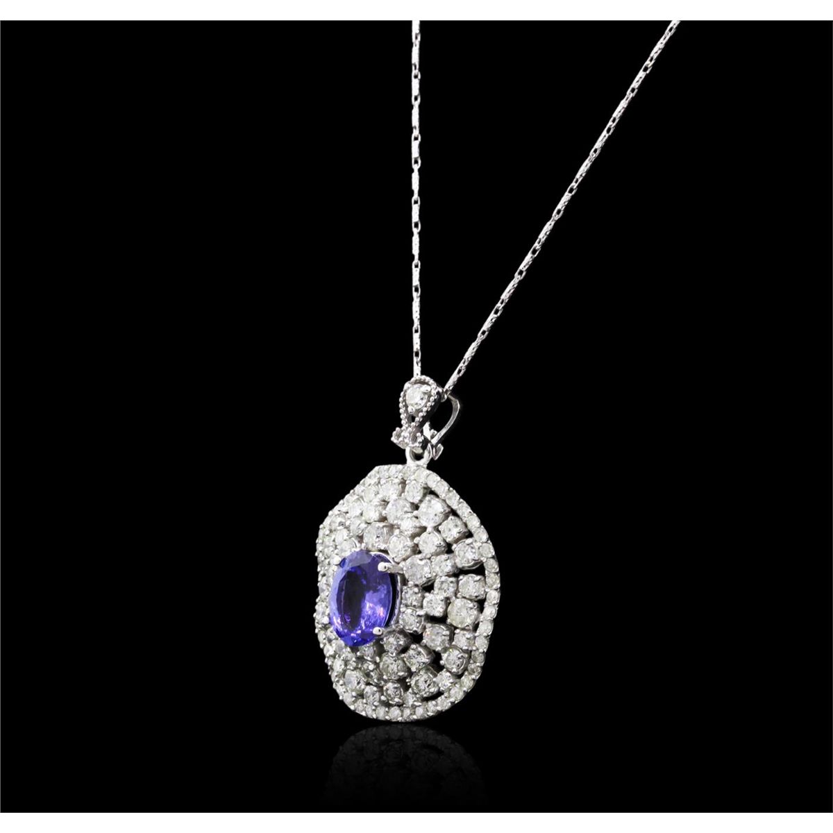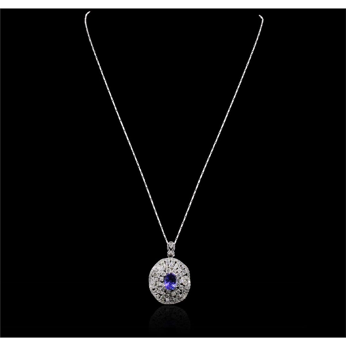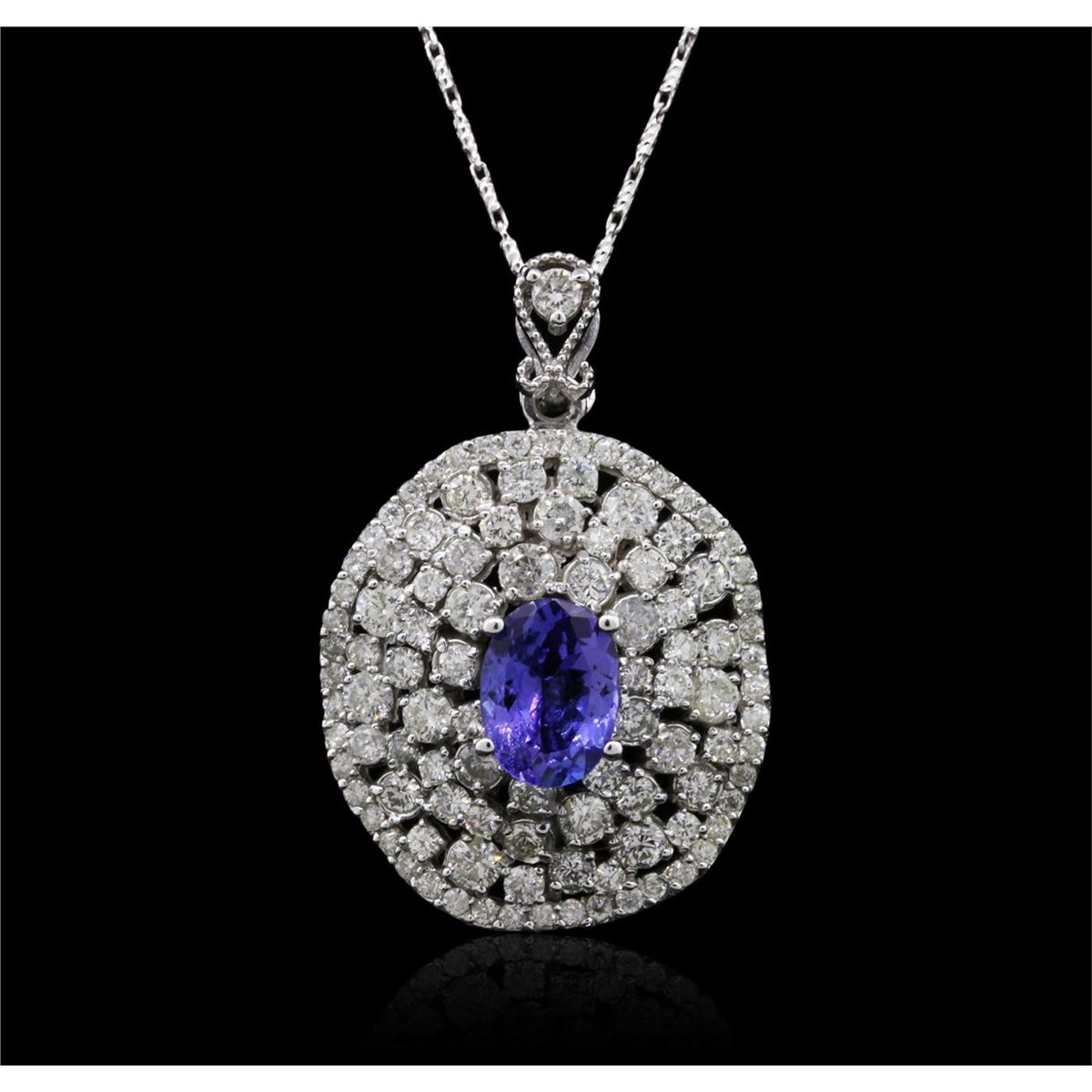 One prong set oval mixed cut natural tanzanite, measuring 9.90 x 7.25 x 4.35mm, 6% bulge factor, approximate weight of 2.27ct., clarity is eye clean, type I, medium dark, very slightly grayish, violetish blue color, (GIA vB 6/3), cut is good. Transmitting light with no distortion, transparent. Graded in the setting. Tanzanite is a very rare gemstone that is only found in the country of Tanzania. Originally discovered in 1967. Tiffany & Company, named the stone Tanzanite. The gem is interesting because of its exceptional pleochroism. Rotated in different directions a tanzanite will exhibit multiple changes of color. Tanzanite has a low tolerance to ultrasonic cleaning, and should not be cleaned using this method. Forty-One prong set round brilliant cut diamonds, measuring 2.70 - 2.20 x 1.47mm (depth est.) approximate total weight of 41 Stones = 2.30ct. Graded in the setting. Clarity: SI-1 to I-1. Color: G - I Seventeen prong set round brilliant cut diamonds, measuring 1.90 - 1.70 x 1.08mm (depth est.) approximate total weight of 17 Stones = 0.46ct. Graded in the setting. Clarity: SI-1 to I-1. Color: G - I Forty-Eight prong set round brilliant cut diamonds, measuring 1.50 - 1.40 x 0.87mm (depth est.) approximate total weight of 48 Stones = 0.63ct. Graded in the setting. Clarity: SI-1 to I-1. Color: G - I. Total Weight of Colored Stones 2.27ct. Total Weight of Diamonds 3.39ct. Total Weight of Pendant With Chain 12.52 grams. AIG Appraised at $17,110.00.