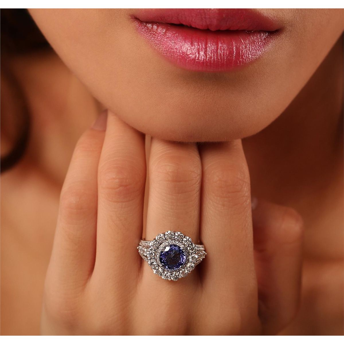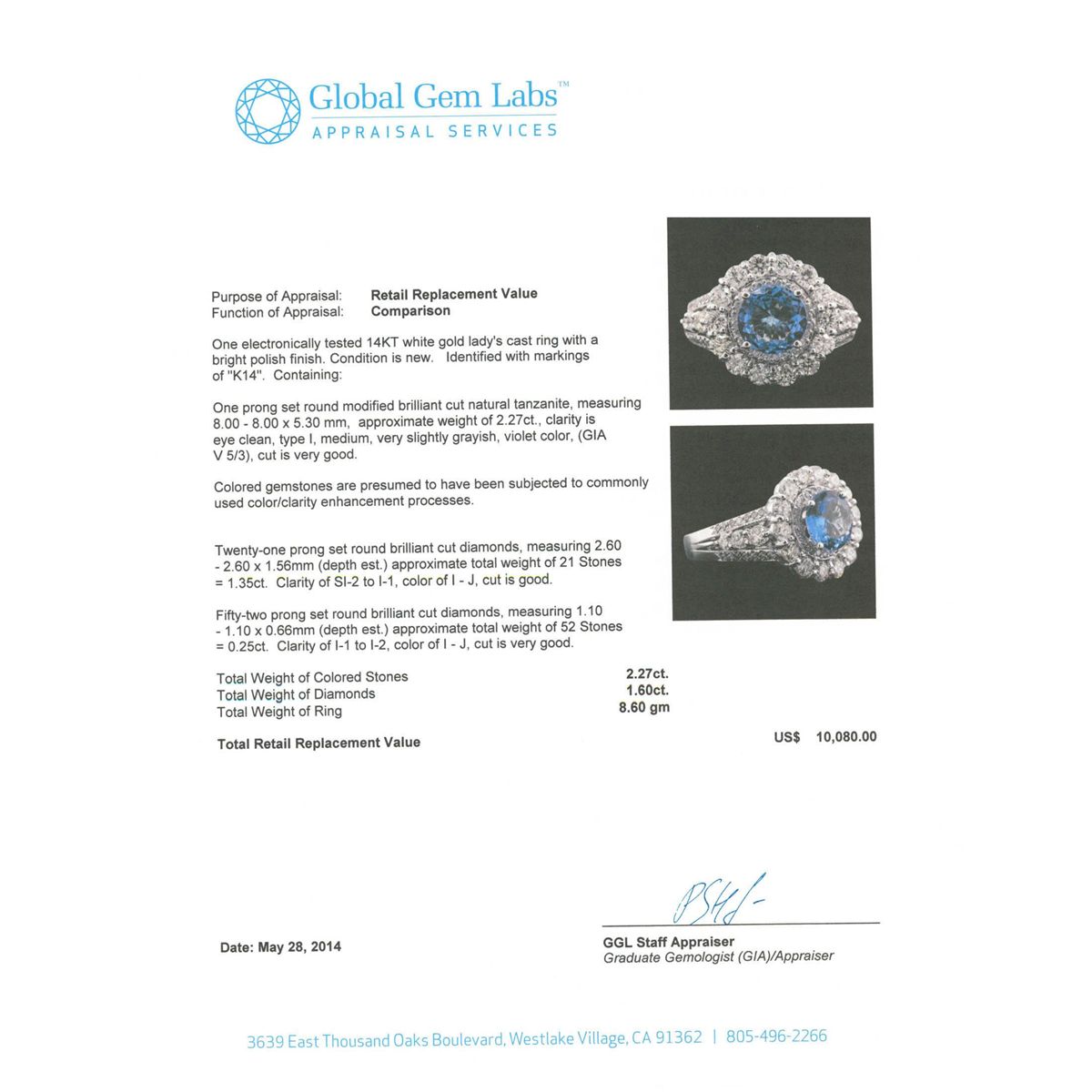 One electronically tested 14KT white gold Ladies cast ring with a bright polish finish. Condition is new. Identified with markings of "K14". Containing: One prong set round modified brilliant cut natural tanzanite, measuring 8.00 - 8.00 x 5.30 mm, approximate weight of 2.27ct., clarity is eye clean, type I, medium, very slightly grayish, violet color, (GIA V 5/3), cut is very good. Colored gemstones are presumed to have been subjected to commonly used color/clarity enhancement processes. Twenty-One prong set round brilliant cut diamonds, measuring 2.60 - 2.60 x 1.56mm (depth est.) approximate. Total Weight of 21 Stones = 1.35ct. Clarity: SI-2 to I-1. Color: I - J, Cut is Good. Fifty-Two prong set round brilliant cut diamonds, measuring 1.10 - 1.10 x 0.66mm (depth est.) approximate. Total Weight of 52 Stones = 0.25ct. Clarity: I-1 to I-2. Color: I - J, Cut is Very Good. Total Weight of Colored Stones 2.27ct. Total Weight of Diamonds 1.60ct. Total Weight of Ring 8.60 Grams. GGL Appraised at $10,080.00.