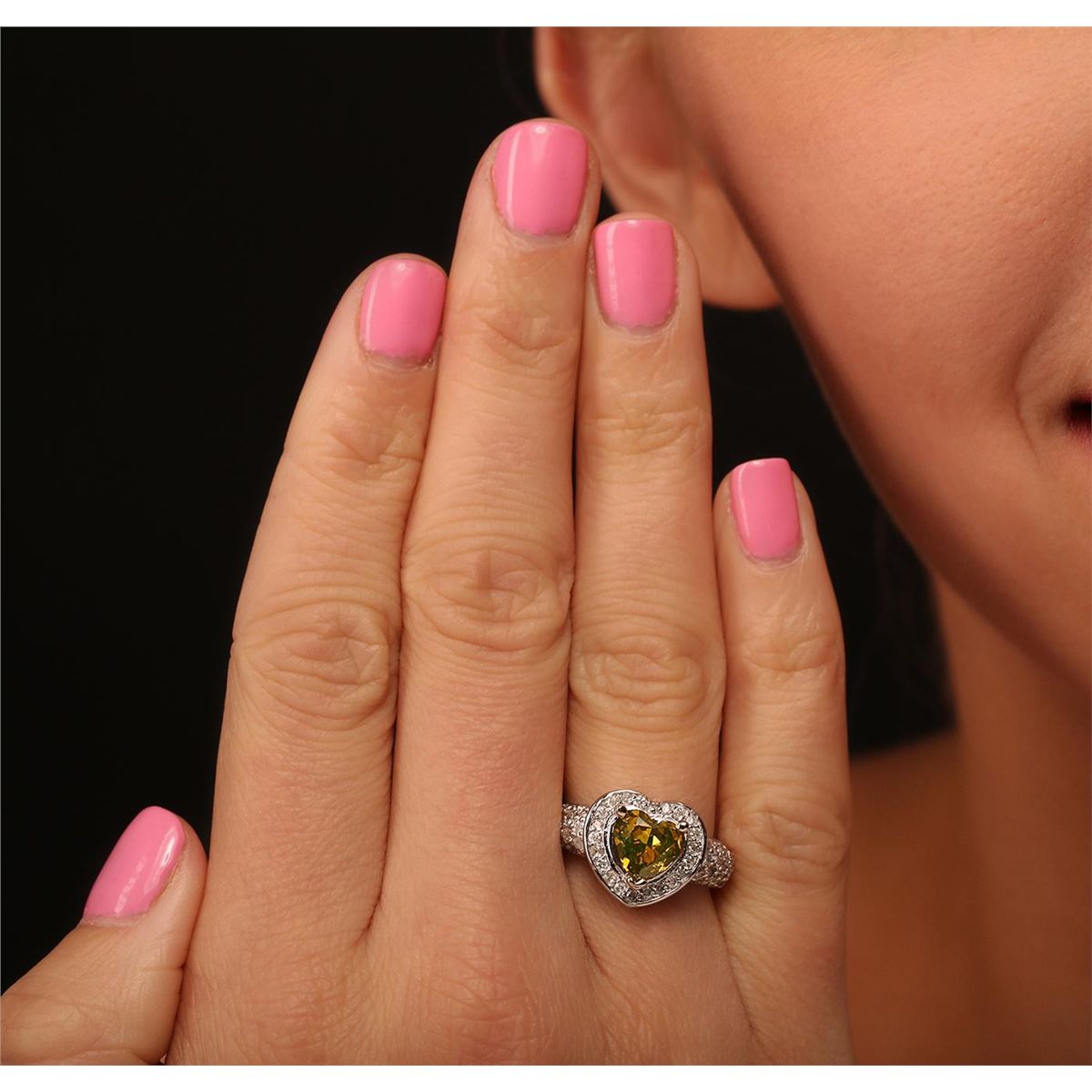 One electronically tested 14KT white gold ladies cast diamond unity ring with a bright polish finish. Condition is new, good workmanship. The featured diamond is set within a diamond bezel, supported by diamond set shoulders completed by a three millimeter wide band. Identified with markings of "14K". Containing: One prong set heart shaped cut diamond, measuring 7.60 x 7.65 x 3.70mm approximate weight of 1.50ct. Indications of laboratory irradiated enhanced color. Graded in the setting. Clarity SI-2 Color Fancy Greenish Yellow. Fifty-five bead set round brilliant cut diamonds, measuring 1.70 - 1.30 x 0.90mm (depth est) approximate total weight of 55 Stones = 0.77ct. Graded in the setting. Clarity I-1 to I-3 Color G-I. Total Weight of Diamonds 2.27ct. Total Weight of Ring 5.80 grams. AIG Appraised at $15,985.00.