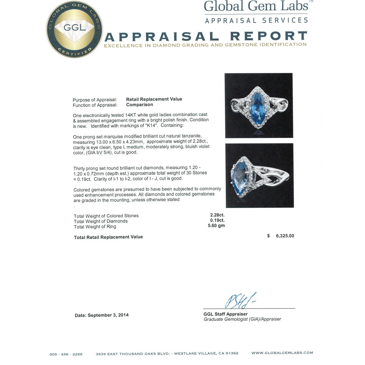 One electronically tested 14KT white gold ladies combination cast & assembled engagement ring with a bright polish finish. Identified with markings of "K14". Condition is new. Containing: One prong set marquise modified brilliant cut natural tanzanite, measuring 13.00 x 6.50 x 4.23mm, approximate weight of 2.28ct., clarity is eye clean, type I, medium, moderately strong, bluish violet color, (GIA bV 5/4), cut is good. Thirty prong set round brilliant cut diamonds, measuring 1.20 - 1.20 x 0.72mm (depth est.) approximate total weight of 30 Stones = 0.19ct. Clarity: I-1 to I-2. Color: I - J, Cut is Good. Colored gemstones are presumed to have been subjected to commonly used enhancement processes. All diamonds and colored gemstones are graded in the mounting, unless otherwise stated. Total Weight of Colored Stones 2.28ct. Total Weight of Diamonds 0.19ct. Total Weight of Ring 5.60 grams. GGL Appraised at $6,325.00.