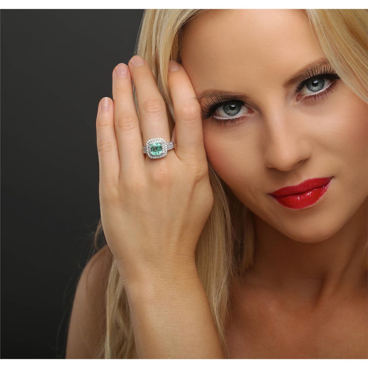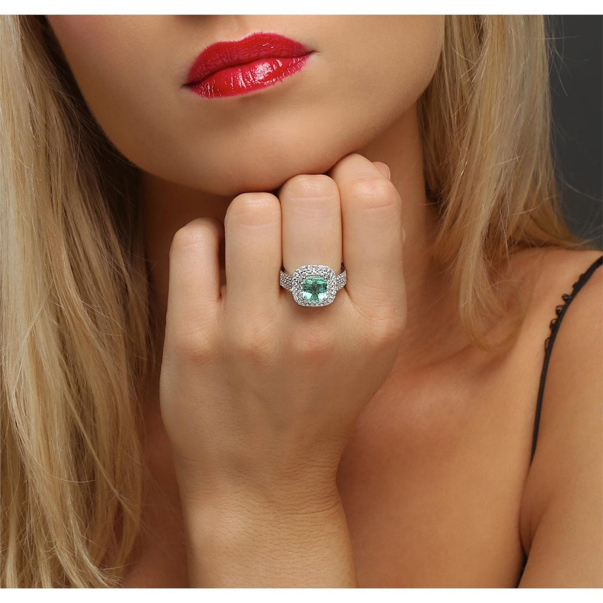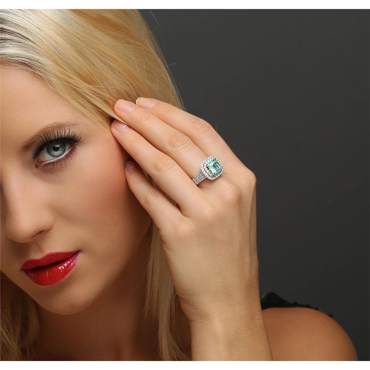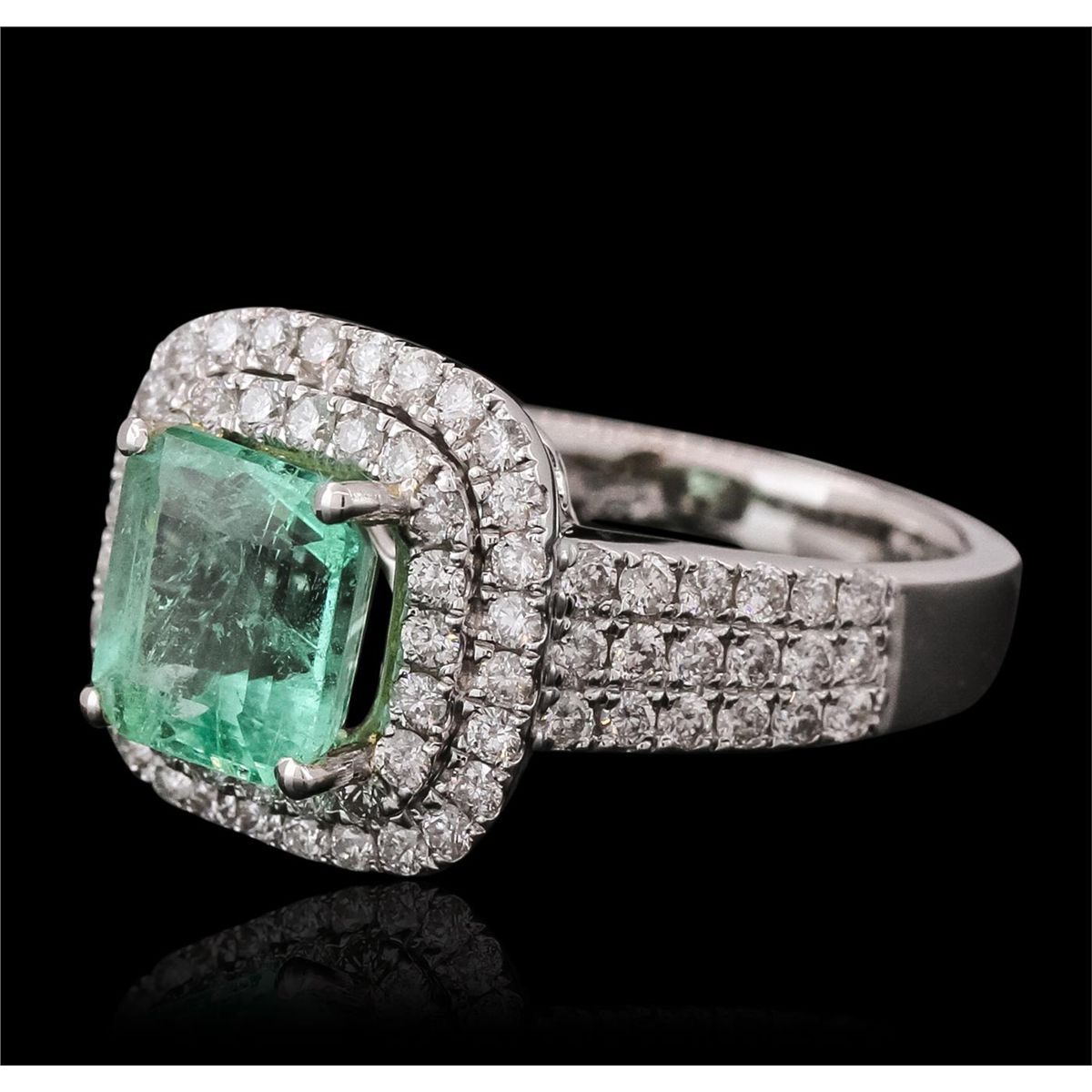 One electronically tested 14KT white gold ladies combination cast & assembled emerald and diamond ring with a flat shank with a bright polish finish. Identified with markings of "14K". Condition is new. Containing: One prong set emerald standard step cut natural emerald, measuring 8.24 x 7.62 x 4.95mm, approximate weight of 2.28ct., clarity is moderately included, type III, light, very slightly grayish, bluish green color, (GIA bG 3/3), cut is good. Eighty-Four prong set round brilliant cut diamonds, measuring 1.50 - 1.30 x 0.84mm (depth est.) approximate total weight of 84 Stones = 0.84ct. Clarity: SI-2 to I-2. Color: I - J, Cut is Good. Colored gemstones are presumed to have been subjected to commonly used enhancement processes. All diamonds and colored gemstones are graded in the mounting, unless otherwise stated total weight of Colored Stones 2.28ct. Total Weight of Diamonds 0.84ct. Total Weight of Ring 6.90 grams. GGL Appraised at $7,600.00.