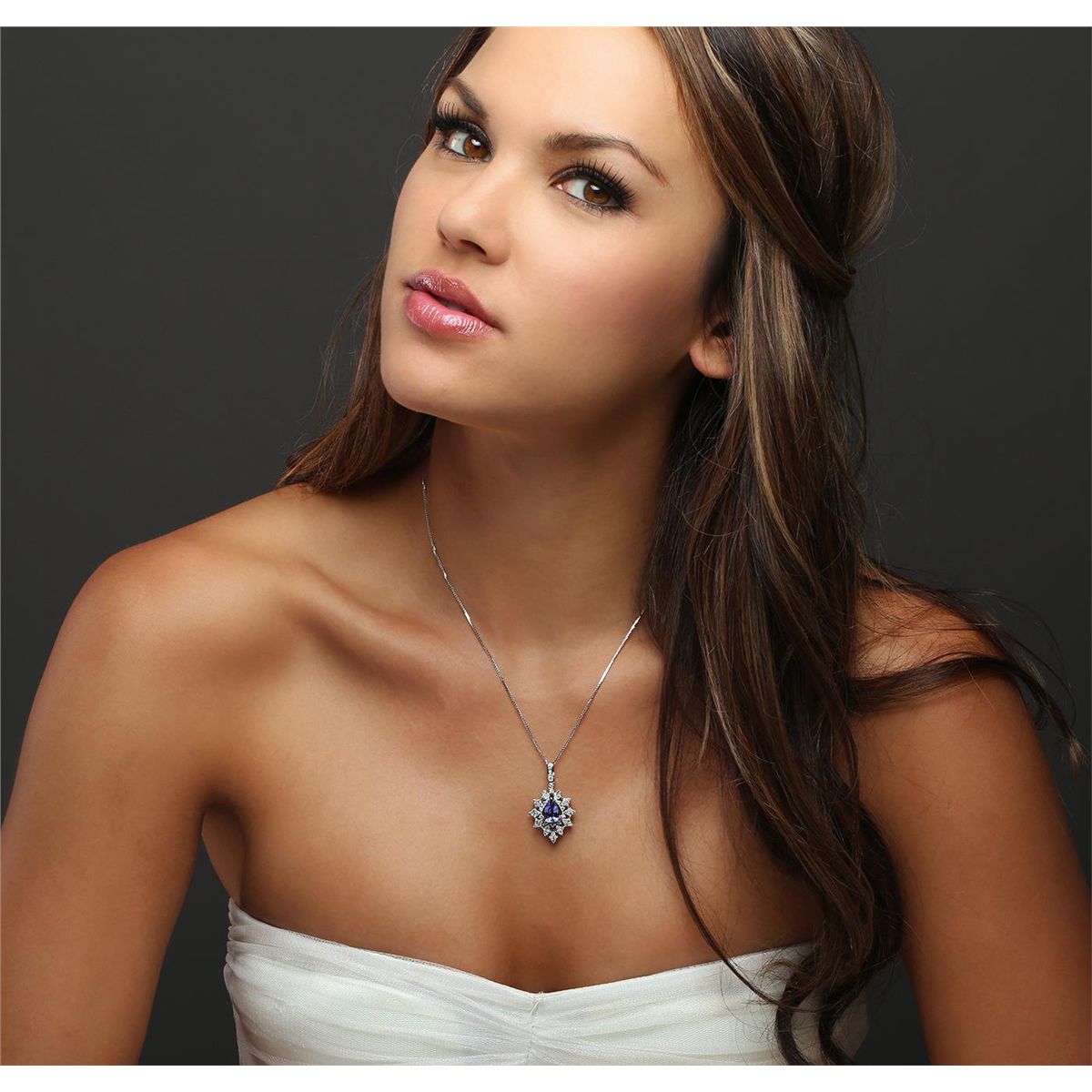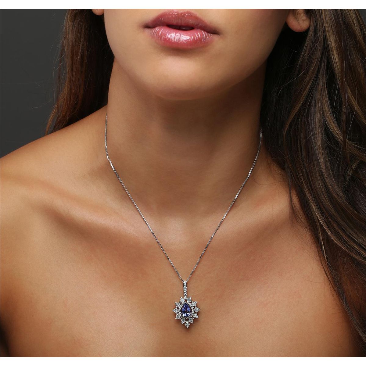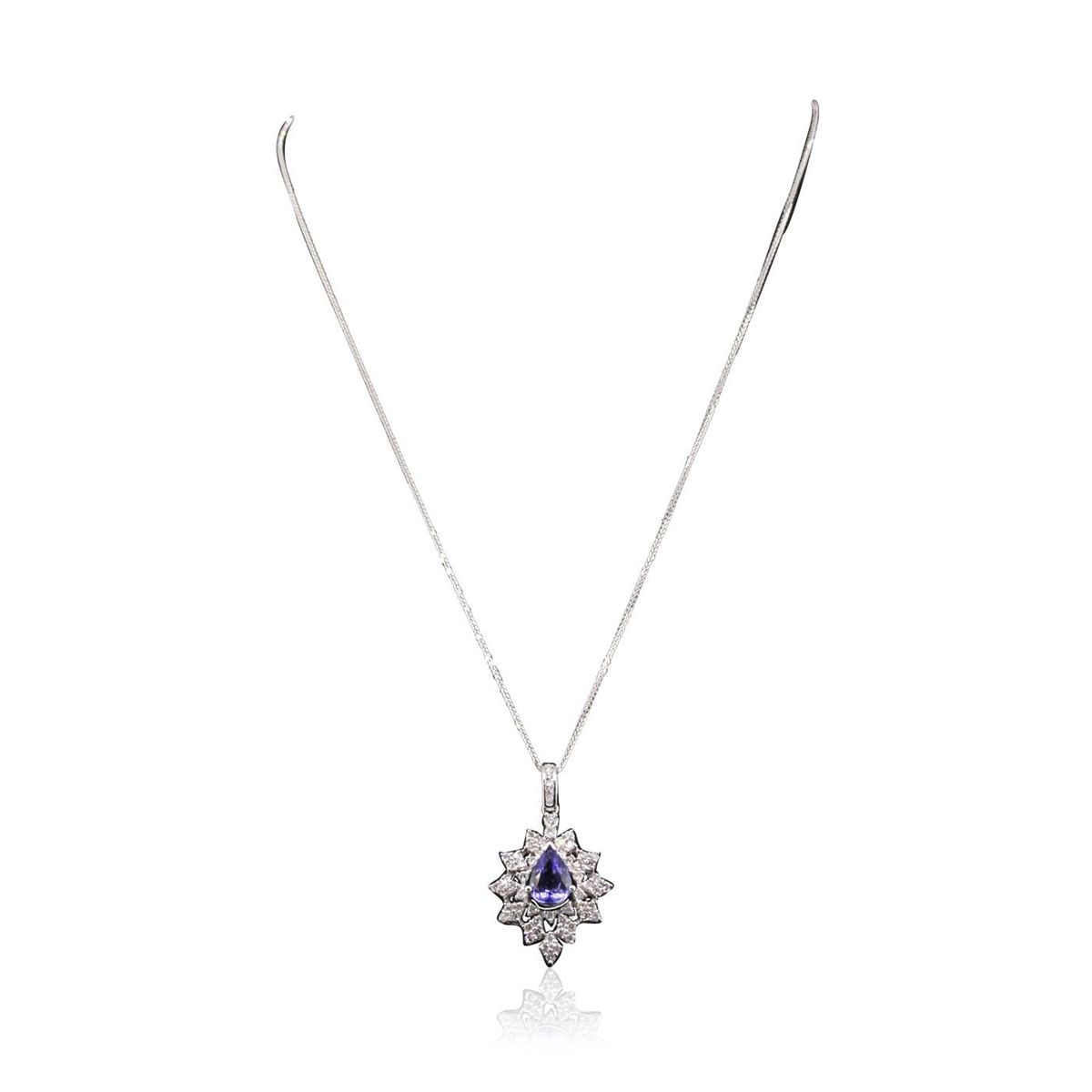 One electronically tested 14KT white gold Ladies combination cast & assembled pendant & chain 17.0" long, medium fancy link with a lobster claw clasp with a bright polish finish. Condition is new. Identified with markings of "14K". Containing: One prong set round pear modified brilliant cut natural tanzanite, measuring 10.00 x 7.00 x 4.87mm, approximate weight of 2.28ct., clarity is eye clean, type I, medium light, very slightly grayish, violet color, (GIA V 4/3), cut is good. Colored gemstones are presumed to have been subjected to commonly used color/clarity enhancement processes. Sixty prong set round brilliant cut diamonds, measuring 1.50 - 1.50 x 0.90mm (depth est.) approximate. Total Weight of 60 Stones = 0.74ct. Clarity: I-1 to I-2. Color: I - J, Cut is Good. Total Weight of Colored Stones 2.28ct. Total Weight of Diamonds 0.74ct. Total Weight of Pendant & Chain 6.70 grams. GGL Appraised at $7,165.00.
