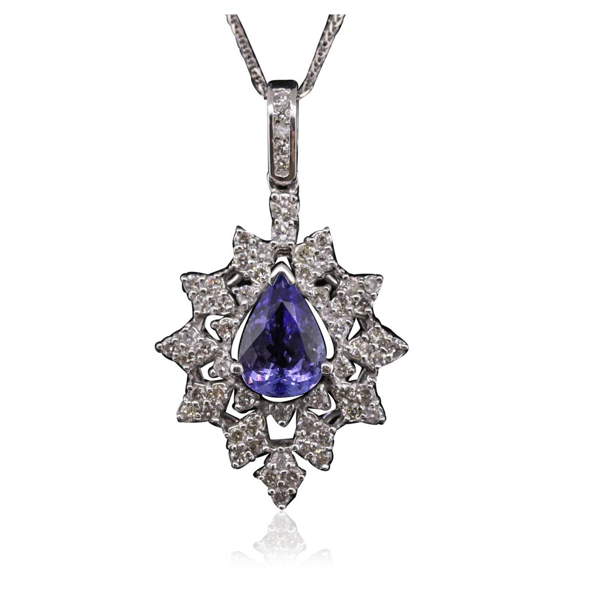 One electronically tested 14KT white gold Ladies combination cast & assembled pendant & chain 17.0" long, medium fancy link with a lobster claw clasp with a bright polish finish. Condition is new. Identified with markings of "14K". Containing: One prong set round pear modified brilliant cut natural tanzanite, measuring 10.00 x 7.00 x 4.87mm, approximate weight of 2.28ct., clarity is eye clean, type I, medium light, very slightly grayish, violet color, (GIA V 4/3), cut is good. Colored gemstones are presumed to have been subjected to commonly used color/clarity enhancement processes. Sixty prong set round brilliant cut diamonds, measuring 1.50 - 1.50 x 0.90mm (depth est.) approximate. Total Weight of 60 Stones = 0.74ct. Clarity: I-1 to I-2. Color: I - J, Cut is Good. Total Weight of Colored Stones 2.28ct. Total Weight of Diamonds 0.74ct. Total Weight of Pendant & Chain 6.70 grams. GGL Appraised at $7,165.00.