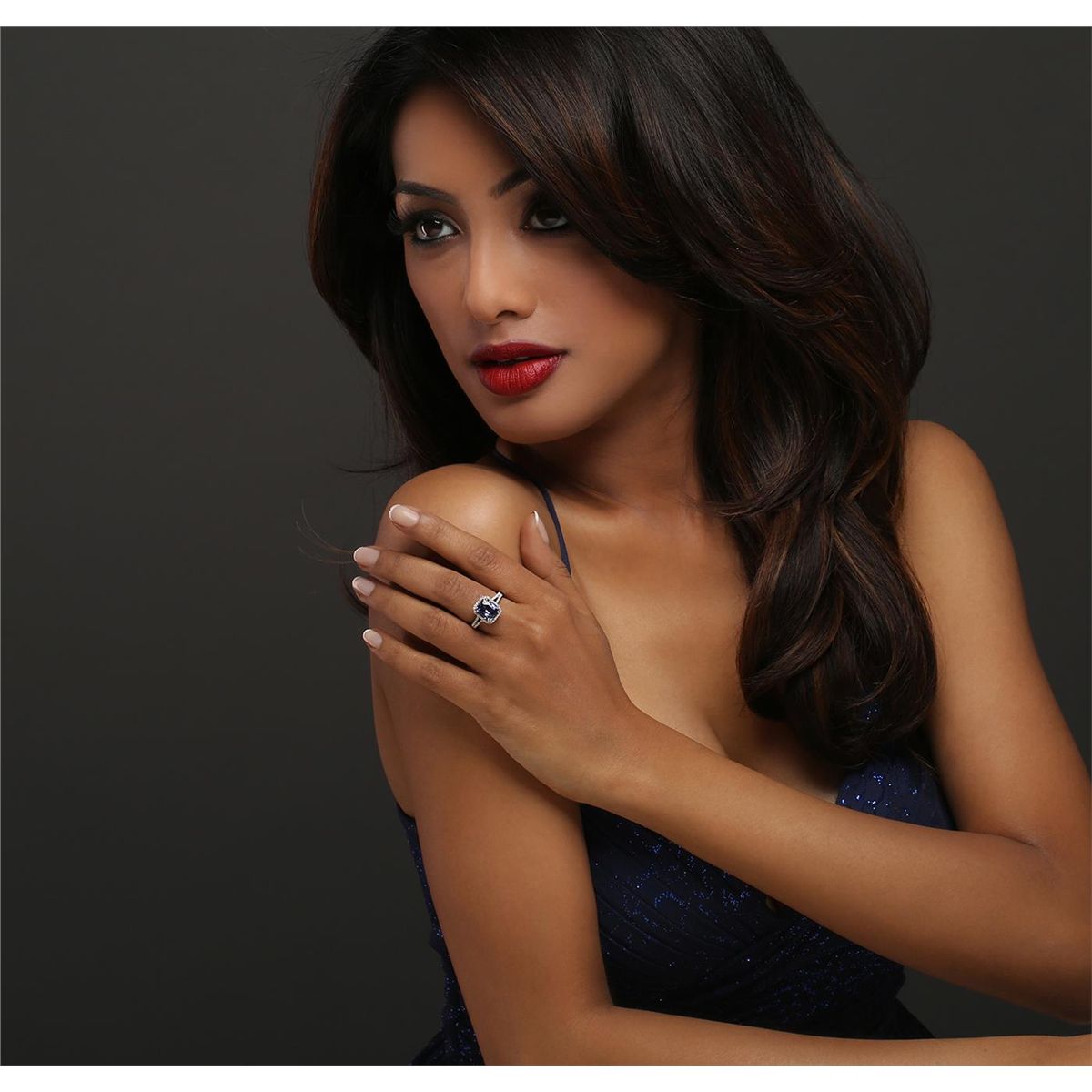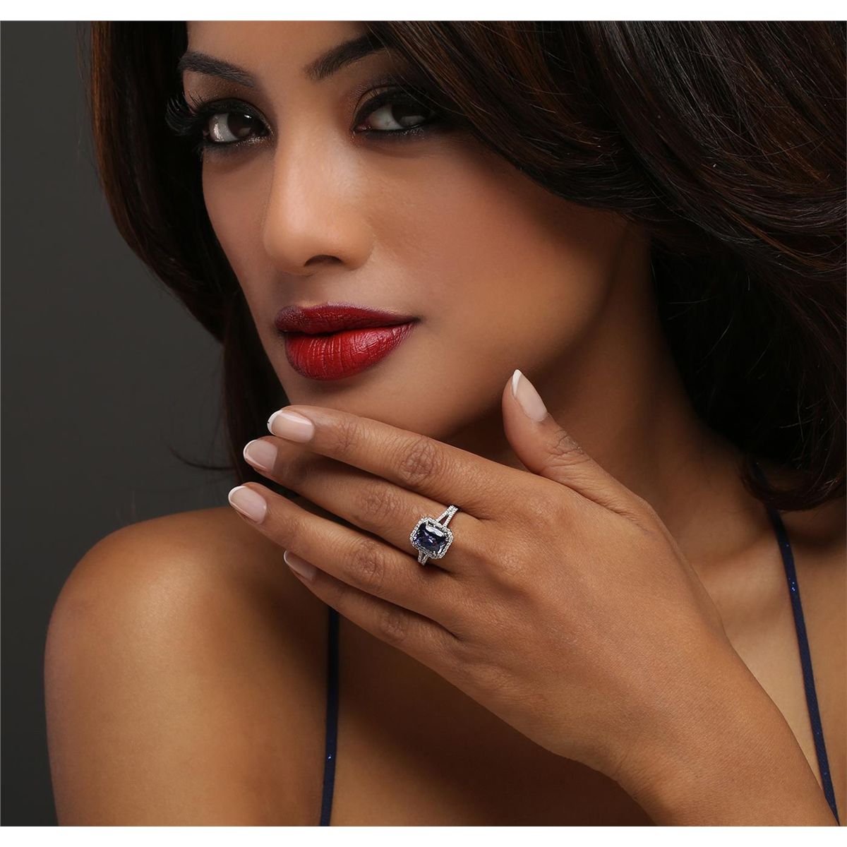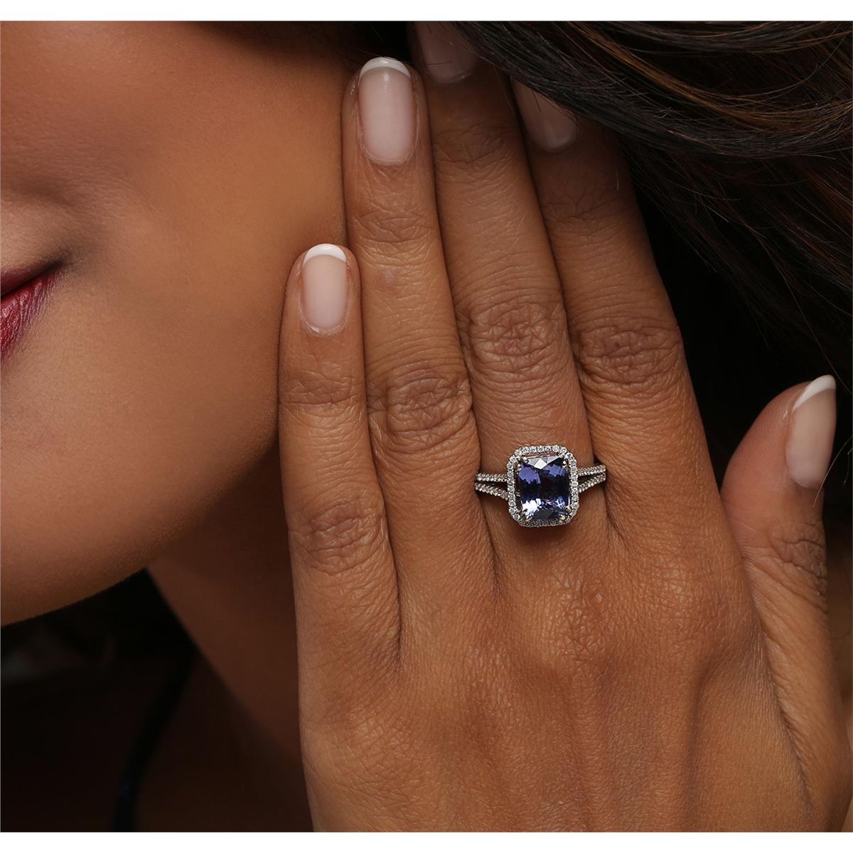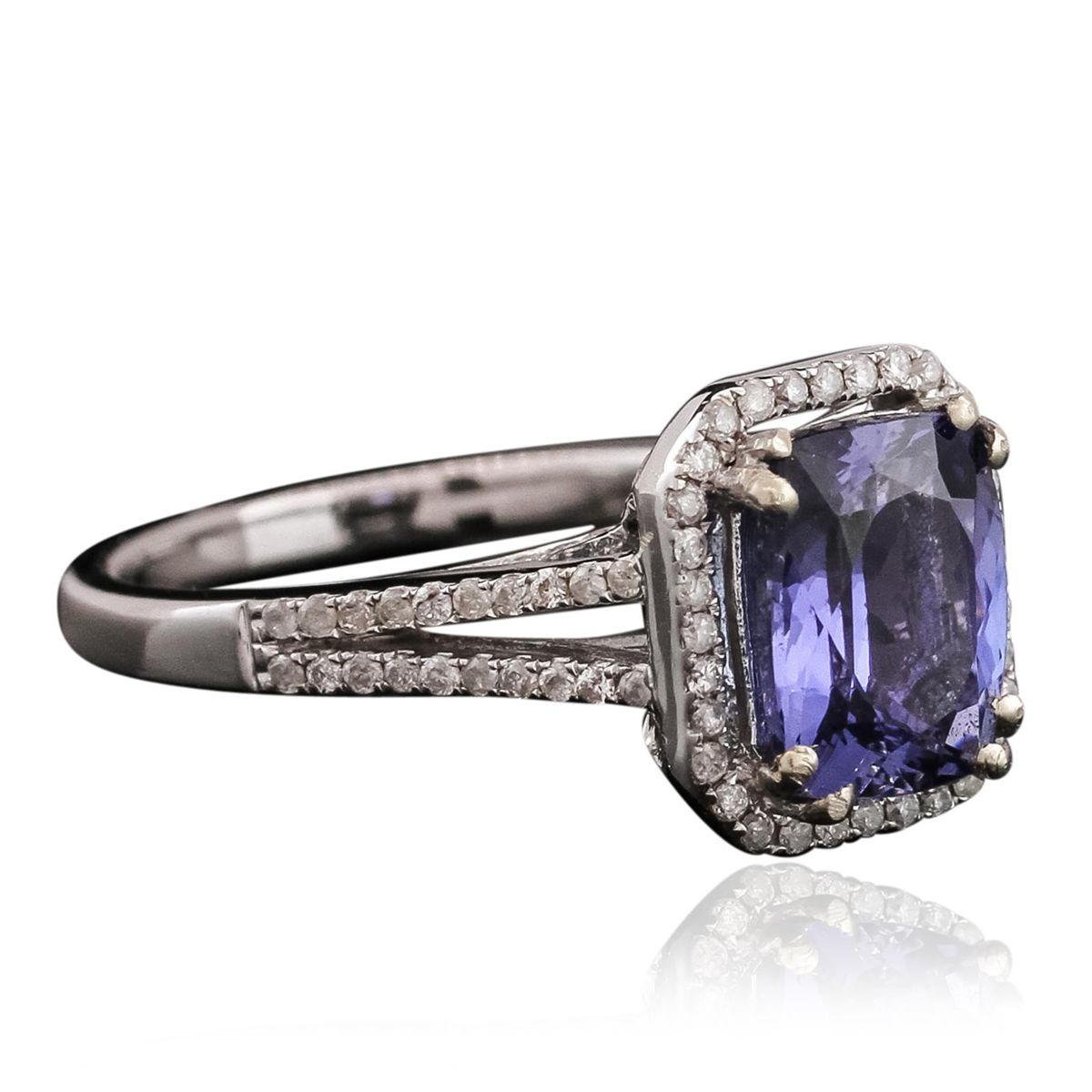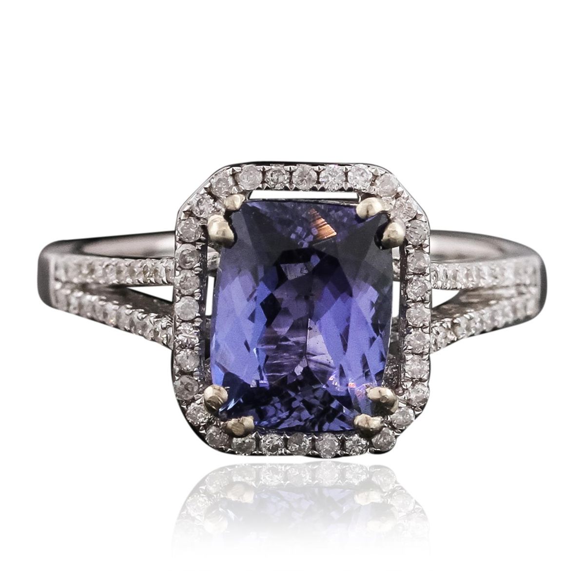 One electronically tested 14KT white gold ladies combination cast & assembled tanzanite and diamond ring with a flat shank with a bright polish finish. Identified with markings of "14K". Condition is new. Containing: One prong set rectangular cushion modified brilliant cut natural tanzanite, measuring 9.18 x 7.11 x 4.45mm, approximate weight of 2.29ct., clarity is eye clean, type I, medium, very slightly grayish, violet color, (GIA V 5/3), cut is good. One Hundred Six prong set round brilliant cut diamonds, measuring 1.20 - 1.20 x 0.72mm (depth est.) approximate total weight of 106 Stones = 0.67ct. Clarity: I-1 to I-3. Color: I - J, Cut is Good. Colored gemstones are presumed to have been subjected to commonly used enhancement processes. All diamonds and colored gemstones are graded in the mounting, unless otherwise stated. Total Weight of Colored Stones 2.29ct. Total Weight of Diamonds 0.67ct. Total Weight of Ring 5.00 grams. GGL Appraised at $6,025.00.