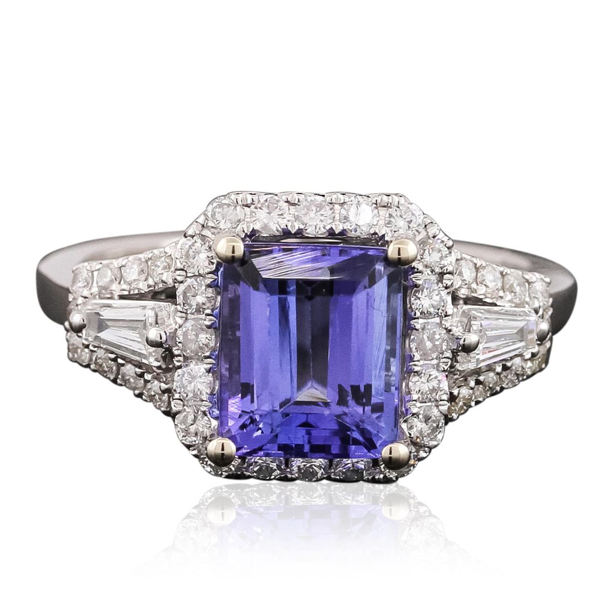 One electronically tested 14KT white gold ladies combination cast & assembled tanzanite and diamond ring with a split shank with a bright polish finish. Identified with markings of "14K". Condition is new. Containing: One prong set emerald standard step cut natural tanzanite, measuring 8.25 x 6.87 x 4.46mm, approximate weight of 2.29ct., clarity is eye clean, type I, medium, very slightly grayish, violet color, (GIA V 5/3), cut is good. Sixty-Eight prong set round brilliant cut diamonds, measuring 1.50 - 1.10 x 0.78mm (depth est.) approximate total weight of 68 Stones = 0.54ct. Clarity: SI-2 to I-1. Color: I - J, Cut is Good. Two prong set baguette cut diamonds, measuring 3.50 x 1.80 x 1.53mm (depth est.) approximate total weight of 2 Stones = 0.18ct. Clarity: SI-1. Color: J, Cut is Good. All colored gemstones are graded in the mounting, unless otherwise stated. All diamonds and colored gemstones are graded in the mounting, unless otherwise stated. Total Weight of Colored Stones 2.29ct. Total Weight of Diamonds 0.72ct. Total Weight of Ring 5.40 grams. GGL Appraised at $6,710.00.