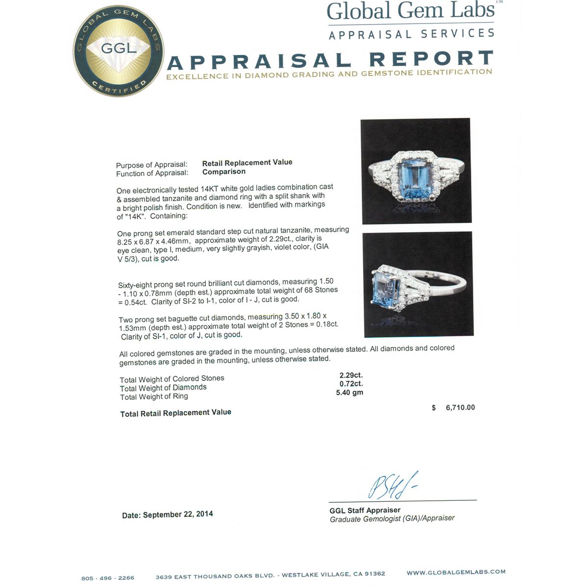 One electronically tested 14KT white gold ladies combination cast & assembled tanzanite and diamond ring with a split shank with a bright polish finish. Identified with markings of "14K". Condition is new. Containing: One prong set emerald standard step cut natural tanzanite, measuring 8.25 x 6.87 x 4.46mm, approximate weight of 2.29ct., clarity is eye clean, type I, medium, very slightly grayish, violet color, (GIA V 5/3), cut is good. Sixty-Eight prong set round brilliant cut diamonds, measuring 1.50 - 1.10 x 0.78mm (depth est.) approximate total weight of 68 Stones = 0.54ct. Clarity: SI-2 to I-1. Color: I - J, Cut is Good. Two prong set baguette cut diamonds, measuring 3.50 x 1.80 x 1.53mm (depth est.) approximate total weight of 2 Stones = 0.18ct. Clarity: SI-1. Color: J, Cut is Good. All colored gemstones are graded in the mounting, unless otherwise stated. All diamonds and colored gemstones are graded in the mounting, unless otherwise stated. Total Weight of Colored Stones 2.29ct. Total Weight of Diamonds 0.72ct. Total Weight of Ring 5.40 grams. GGL Appraised at $6,710.00.