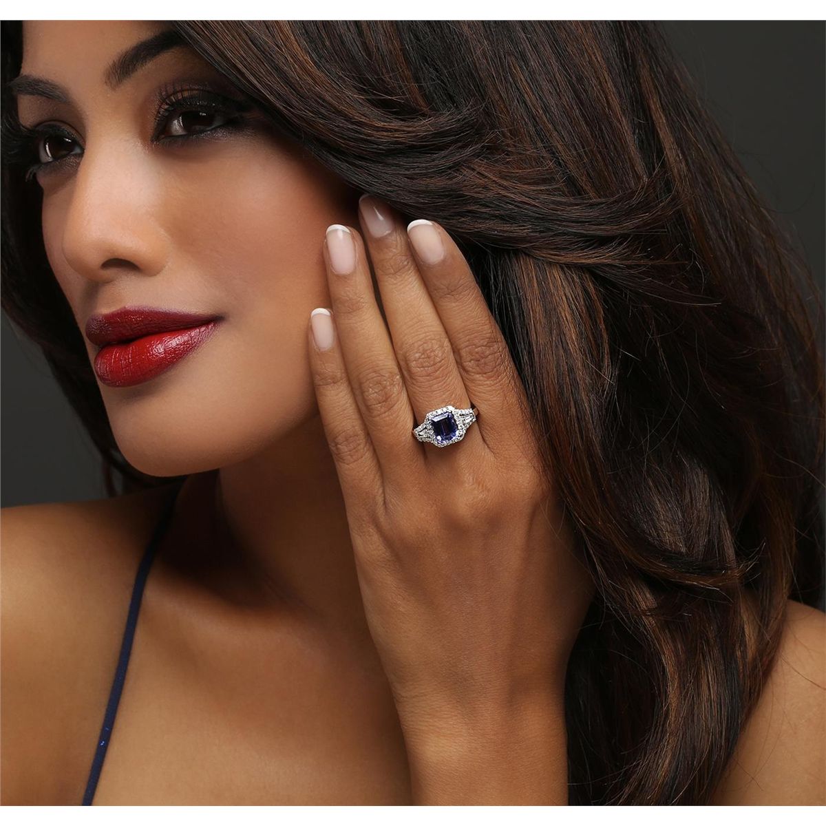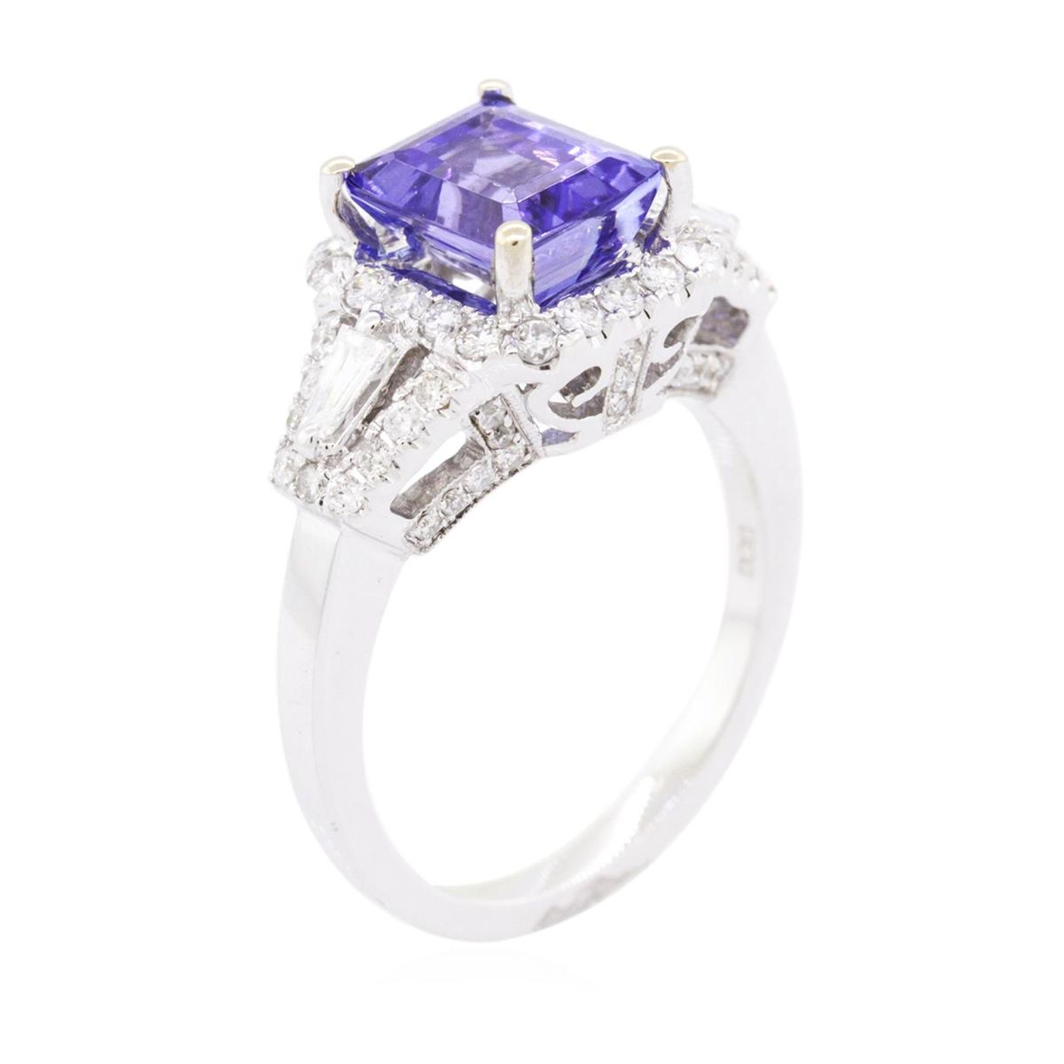 One electronically tested 14KT white gold ladies combination cast & assembled tanzanite and diamond ring with a split shank with a bright polish finish. Identified with markings of "14K". Condition is new. Containing: One prong set emerald standard step cut natural tanzanite, measuring 8.25 x 6.87 x 4.46mm, approximate weight of 2.29ct., clarity is eye clean, type I, medium, very slightly grayish, violet color, (GIA V 5/3), cut is good. Sixty-Eight prong set round brilliant cut diamonds, measuring 1.50 - 1.10 x 0.78mm (depth est.) approximate total weight of 68 Stones = 0.54ct. Clarity: SI-2 to I-1. Color: I - J, Cut is Good. Two prong set baguette cut diamonds, measuring 3.50 x 1.80 x 1.53mm (depth est.) approximate total weight of 2 Stones = 0.18ct. Clarity: SI-1. Color: J, Cut is Good. All colored gemstones are graded in the mounting, unless otherwise stated. All diamonds and colored gemstones are graded in the mounting, unless otherwise stated. Total Weight of Colored Stones 2.29ct. Total Weight of Diamonds 0.72ct. Total Weight of Ring 5.40 grams. GGL Appraised at $6,710.00.