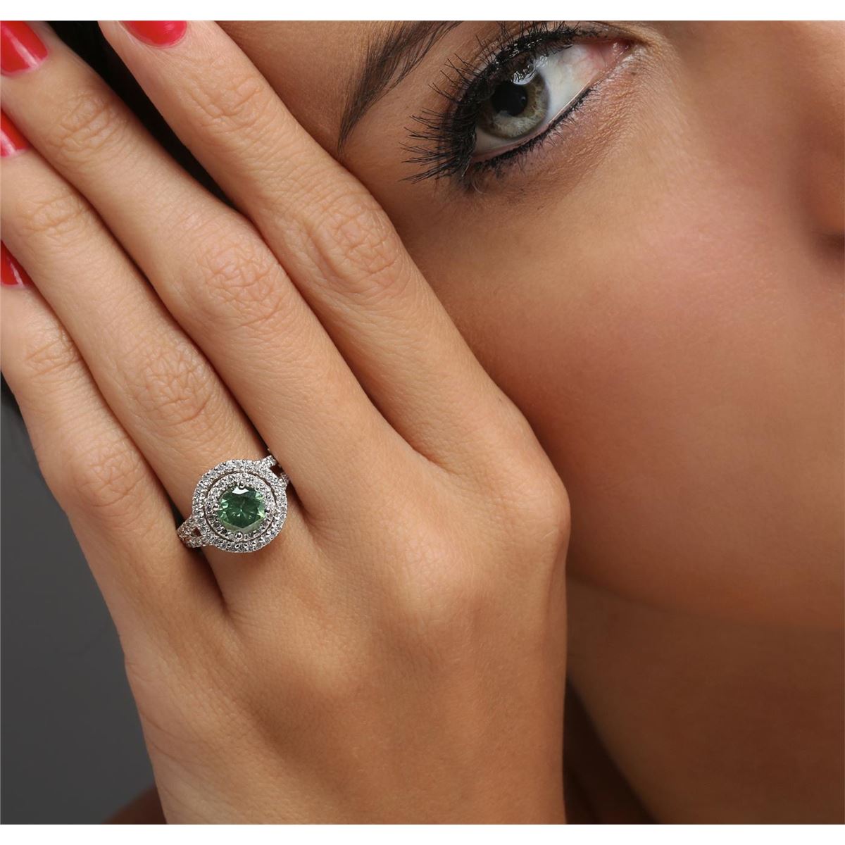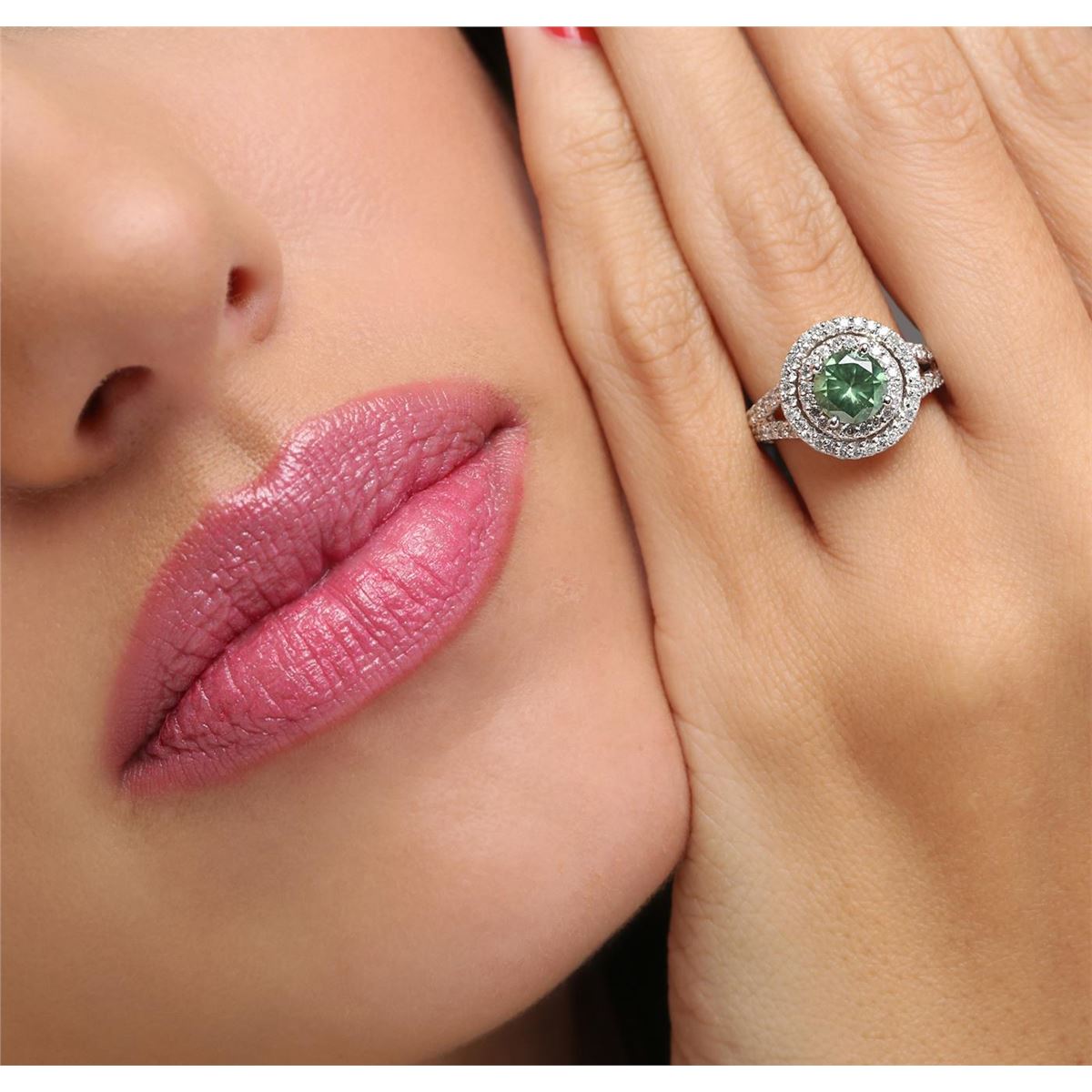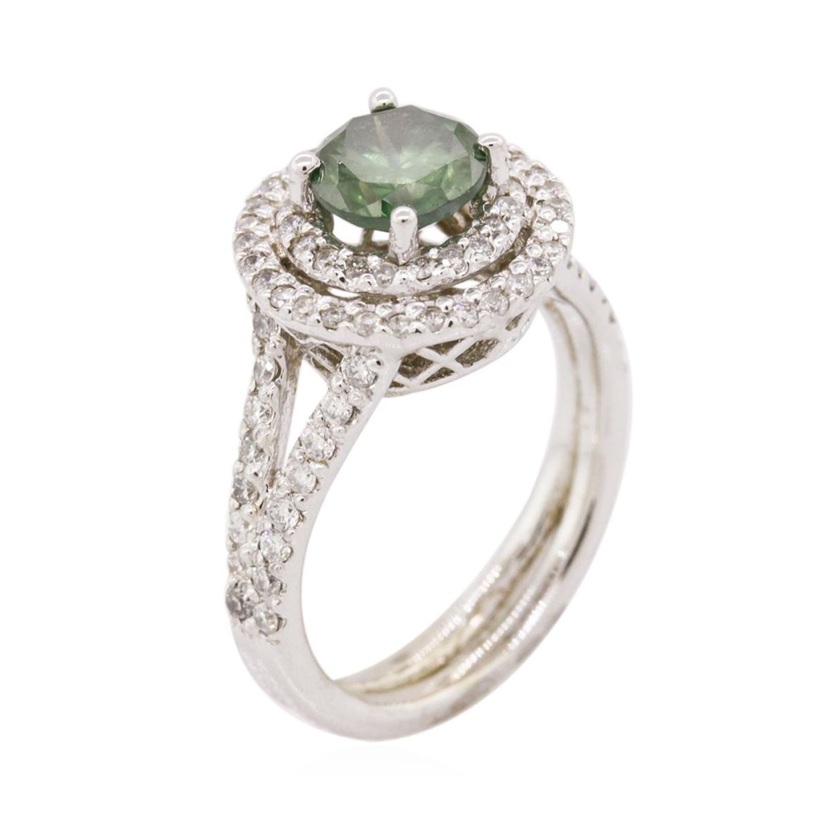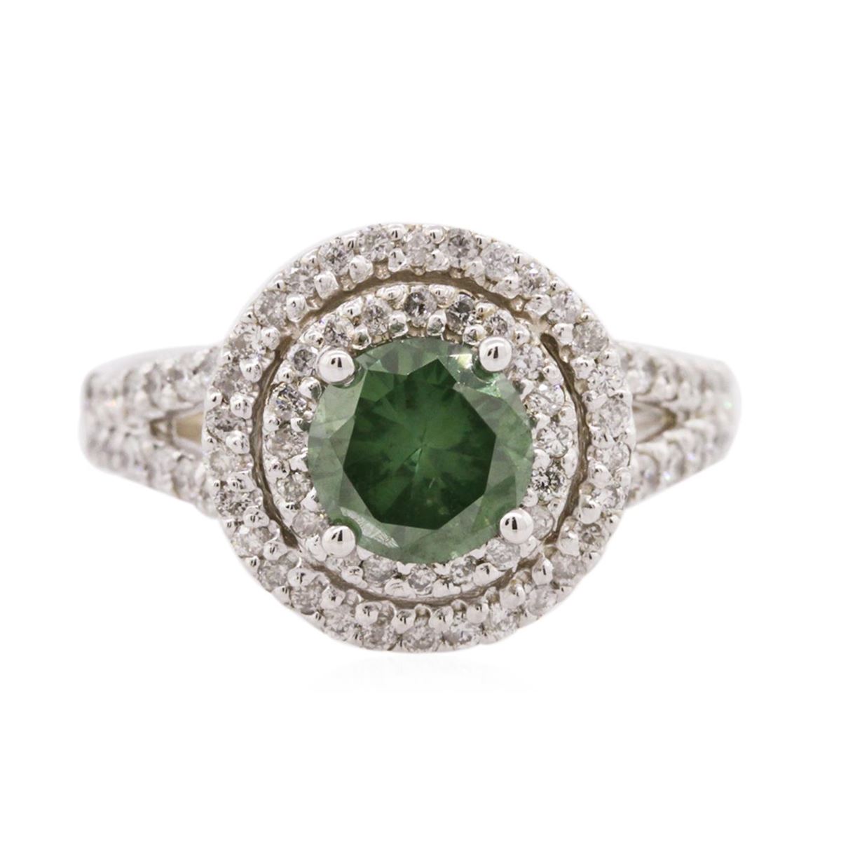 One electronically tested 14KT white gold ladies cast diamond ring with a bright polish finish. The featured diamond is set within two tiered diamond bezels supported by diamond set split shoulders, completed by a grooved three and one-half millimeter wide band. Identified with markings of "14K". Condition is new, good workmanship. Containing: One round brilliant cut diamond, measuring 6.55 - 6.50 x 4.15mm (depth est.), 6.00.%. GTCF approximate weight of 1.29ct with a faint green fluorescence. Indications of laboratory irradiated enhanced color. Graded in the setting. Clarity: I-1. Depth: 63.6%. Table 70.4%. Eighty-Two prong set round brilliant cut diamonds, measuring 1.50 - 1.40 x 0.87mm (depth est.) approximate total weight of 82 Stones = 1.01ct. Graded in the setting. Clarity: SI-2 to I-1. Color: G - I. Total Weight of Diamonds 2.30ct. Total Weight of Ring 5.71 grams. AIG Appraised at $13,375.00.