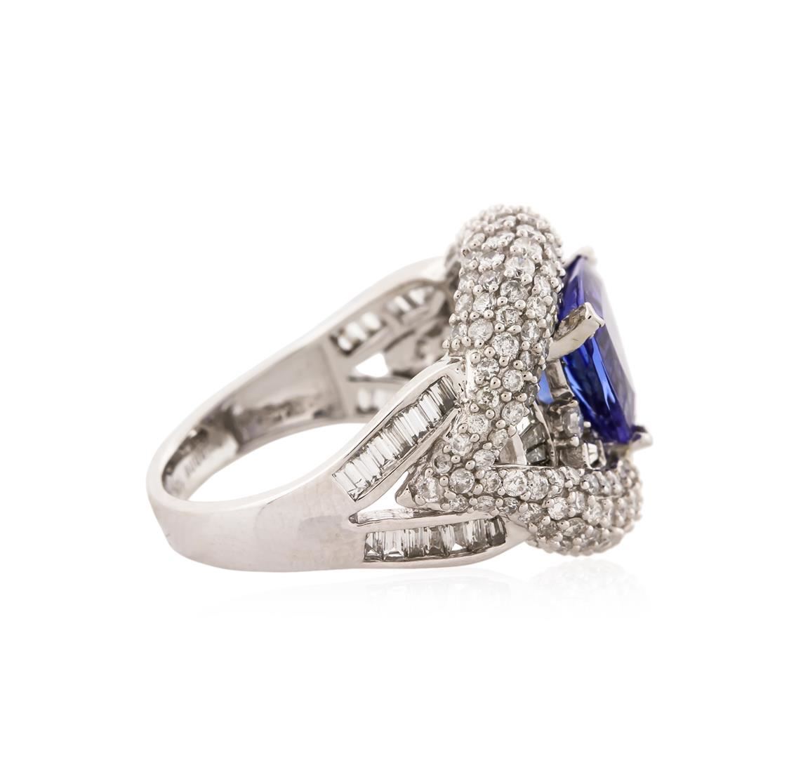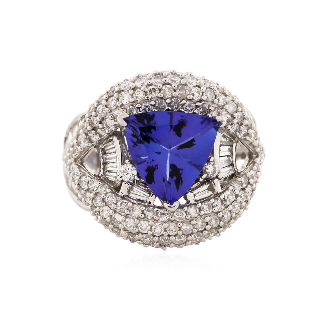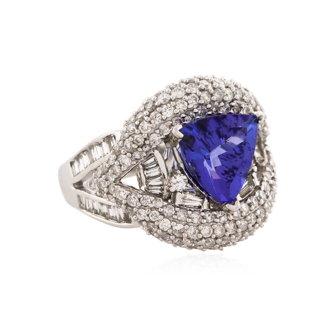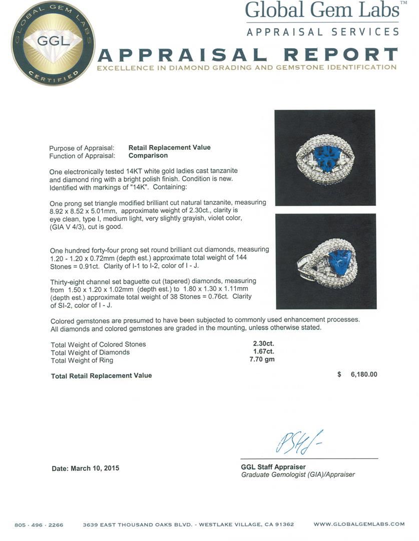 One electronically tested 14KT white gold ladies cast tanzanite and diamond ring with a bright polish finish. Identified with markings of "14K". Condition is new. Containing: One prong set triangle modified brilliant cut natural tanzanite, measuring 8.92 x 8.52 x 5.01mm, approximate weight of 2.30ct., clarity is eye clean, type I, medium light, very slightly grayish, violet color, (GIA V 4/3), cut is good. One Hundred Forty-Four prong set round brilliant cut diamonds, measuring 1.20 - 1.20 x 0.72mm (depth est.) approximate total weight of 144 Stones = 0.91ct. Clarity: I-1 to I-2. Color: I - J. Thirty-Eight channel set baguette cut (tapered) diamonds, measuring from 1.50 x 1.20 x 1.02mm (depth est.) to 1.80 x 1.30 x 1.11mm (depth est.) approximate total weight of 38 Stones = 0.76ct. Clarity: SI-2. Color: I - J. Colored gemstones are presumed to have been subjected to commonly used enhancement processes. All diamonds and colored gemstones are graded in the mounting, unless otherwise stated. Total Weight of Colored Stones 2.30ct. Total Weight of Diamonds 1.67ct. Total Weight of Ring 7.70 grams. GGL Appraised at $6,180.00.