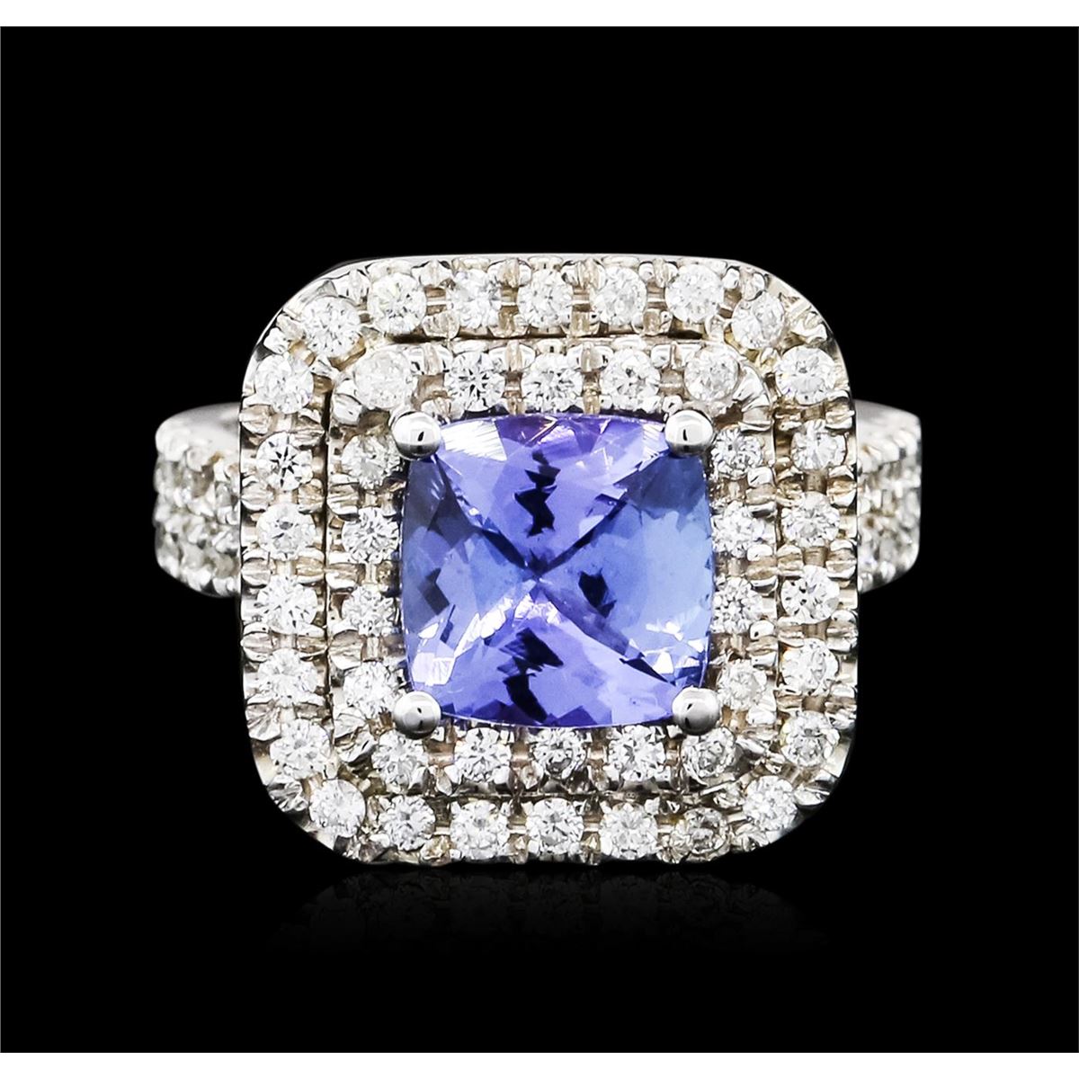 One electronically tested 14KT white gold ladies combination cast & assembled tanzanite and diamond ring with a bright polish finish. Identified with markings of "14K". Condition is new. Containing: One prong set oval square modified brilliant cut natural tanzanite, measuring 7.50 x 7.50 x 4.88mm, approximate weight of 2.30ct., clarity is eye clean, type I, medium, moderately strong, violet color, (GIA V 5/4), cut is good. Seventy-Eight prong set round brilliant cut diamonds, measuring 1.30 - 1.30 x 0.78mm (depth est.) approximate total weight of 78 Stones = 0.62ct. Clarity: I-1. Color: I - J, Cut is Good. Colored gemstones are presumed to have been subjected to commonly used enhancement processes. All diamonds and colored gemstones are graded in the mounting, unless otherwise stated. Total Weight of Colored Stones 2.30ct. Total Weight of Diamonds 0.62ct. Total Weight of Ring 8.40 grams. GGL Appraised at $7,240.00.