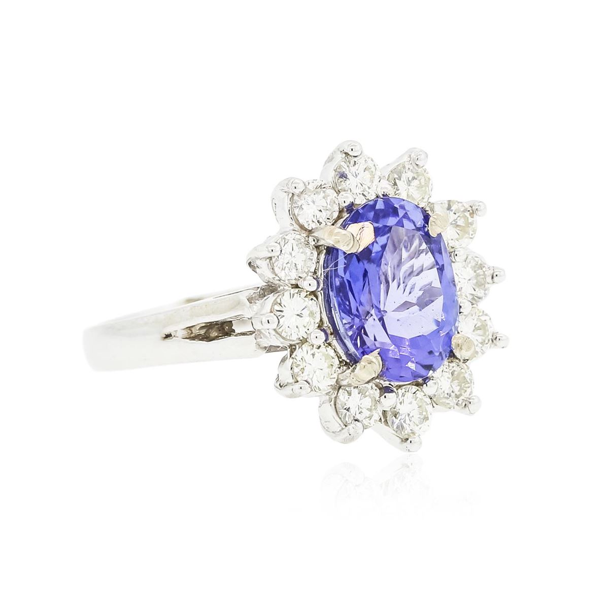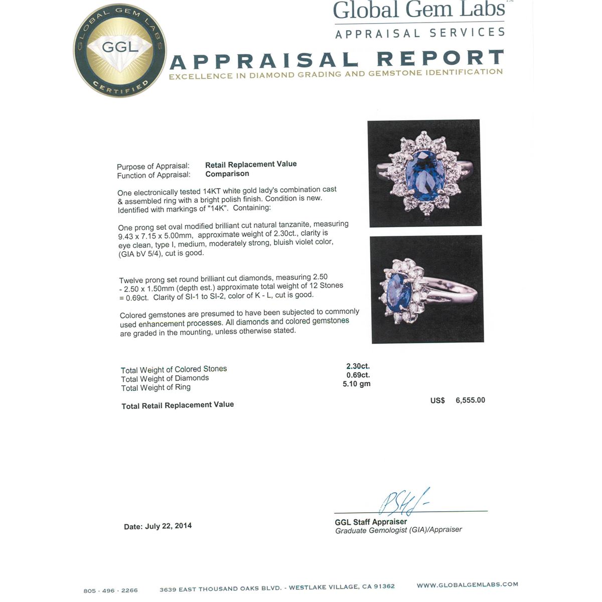 One electronically tested 14KT white gold ladies combination cast & assembled ring with a bright polish finish. Condition is new. Identified with markings of "14K". Containing: One prong set oval modified brilliant cut natural tanzanite, measuring 9.43 x 7.15 x 5.00mm, approximate weight of 2.30ct., clarity is eye clean, type I, medium, moderately strong, bluish violet color, (GIA bV 5/4), cut is good. Twelve prong set round brilliant cut diamonds, measuring 2.50 - 2.50 x 1.50mm (depth est.) approximate total weight of 12 Stones = 0.69ct. Clarity: SI-1 to SI-2. Color: K - L, Cut is Good. Colored gemstones are presumed to have been subjected to commonly used enhancement processes. All diamonds and colored gemstones are graded in the mounting, unless otherwise stated. Total Weight of Colored Stones 2.30ct. Total Weight of Diamonds 0.69ct. Total Weight of Ring 5.10 grams. GGL Appraised at $6,555.00.