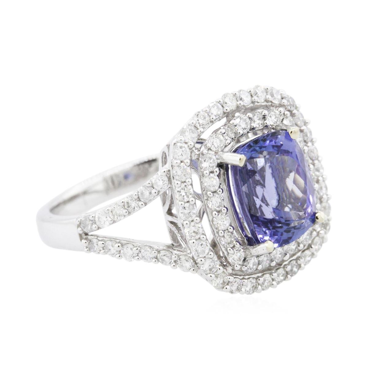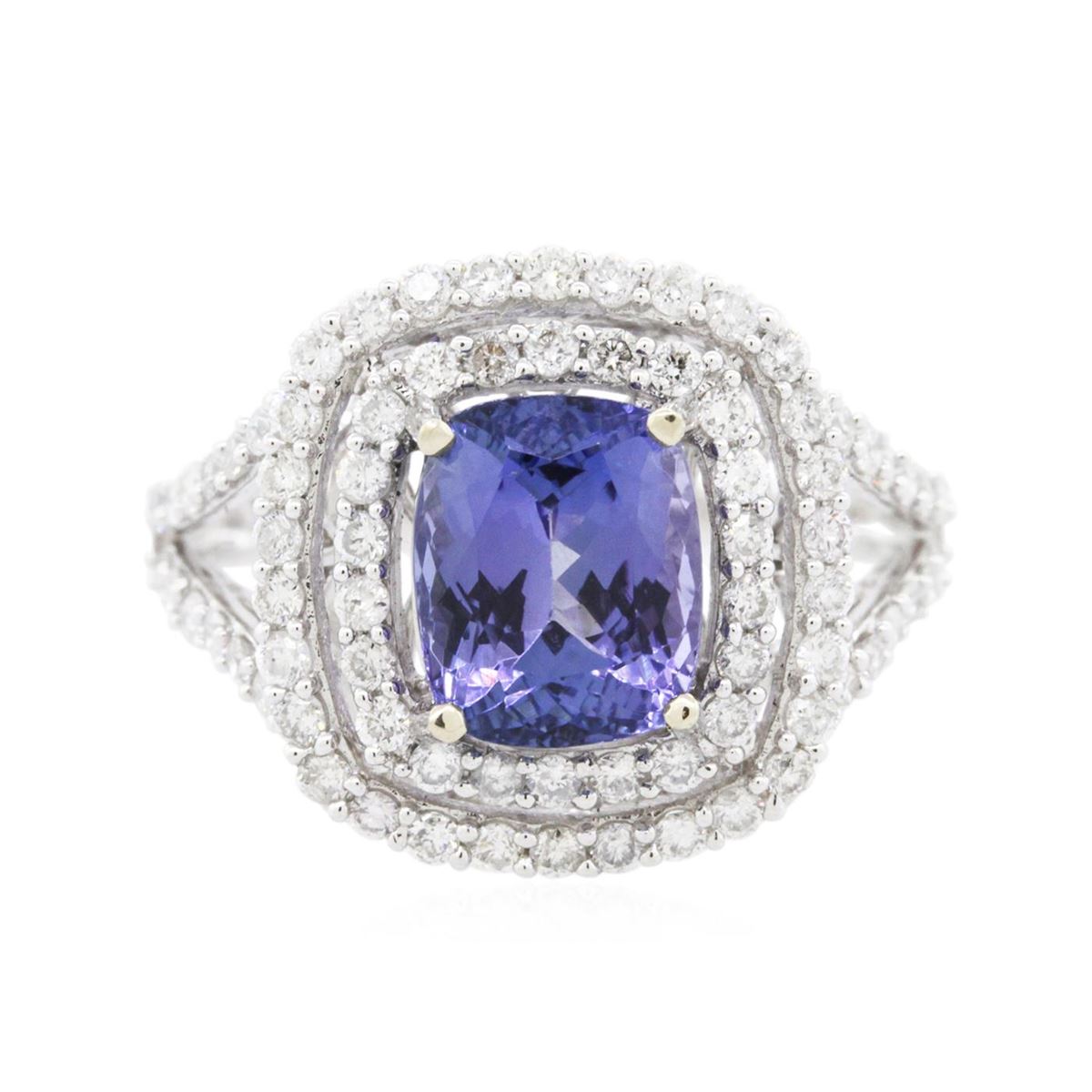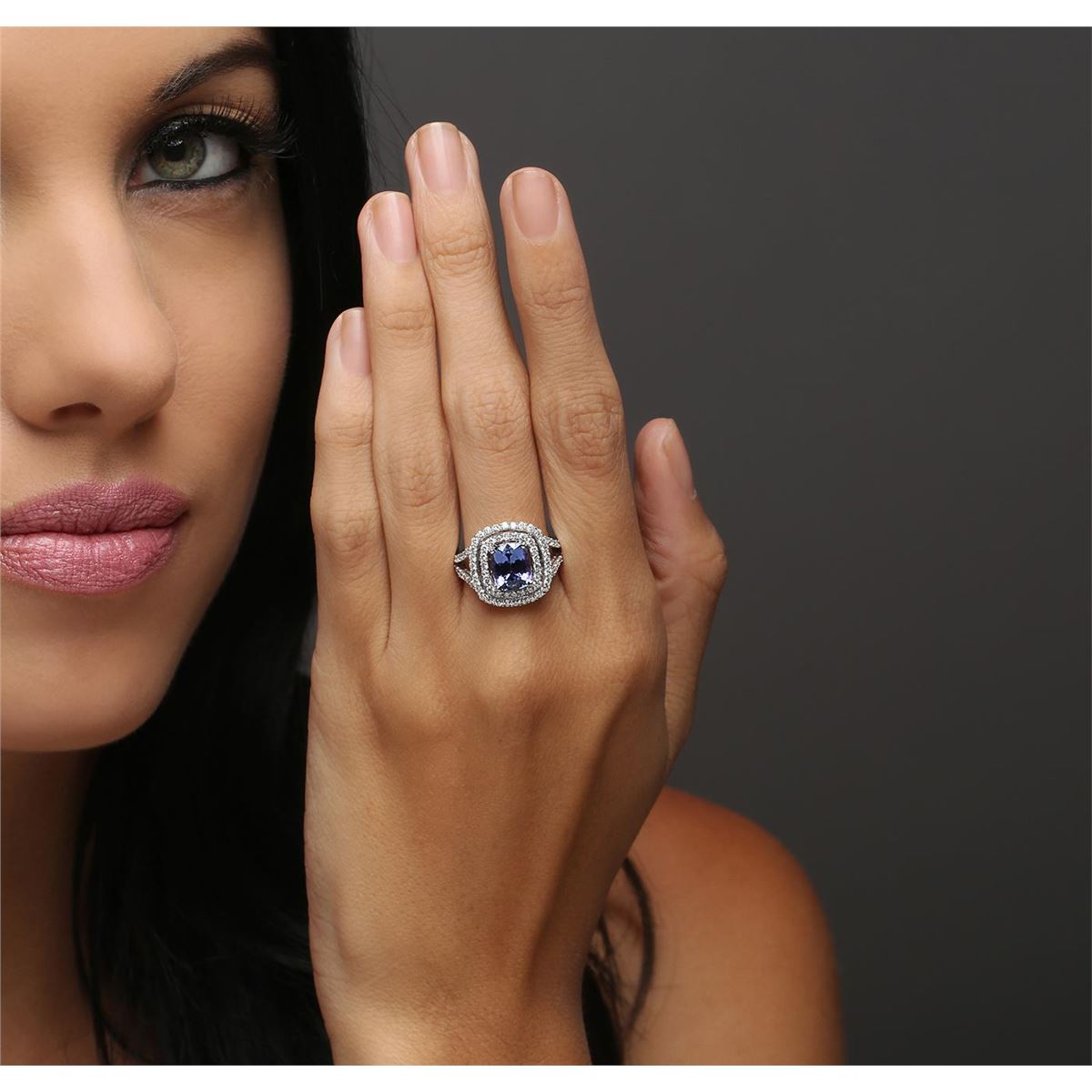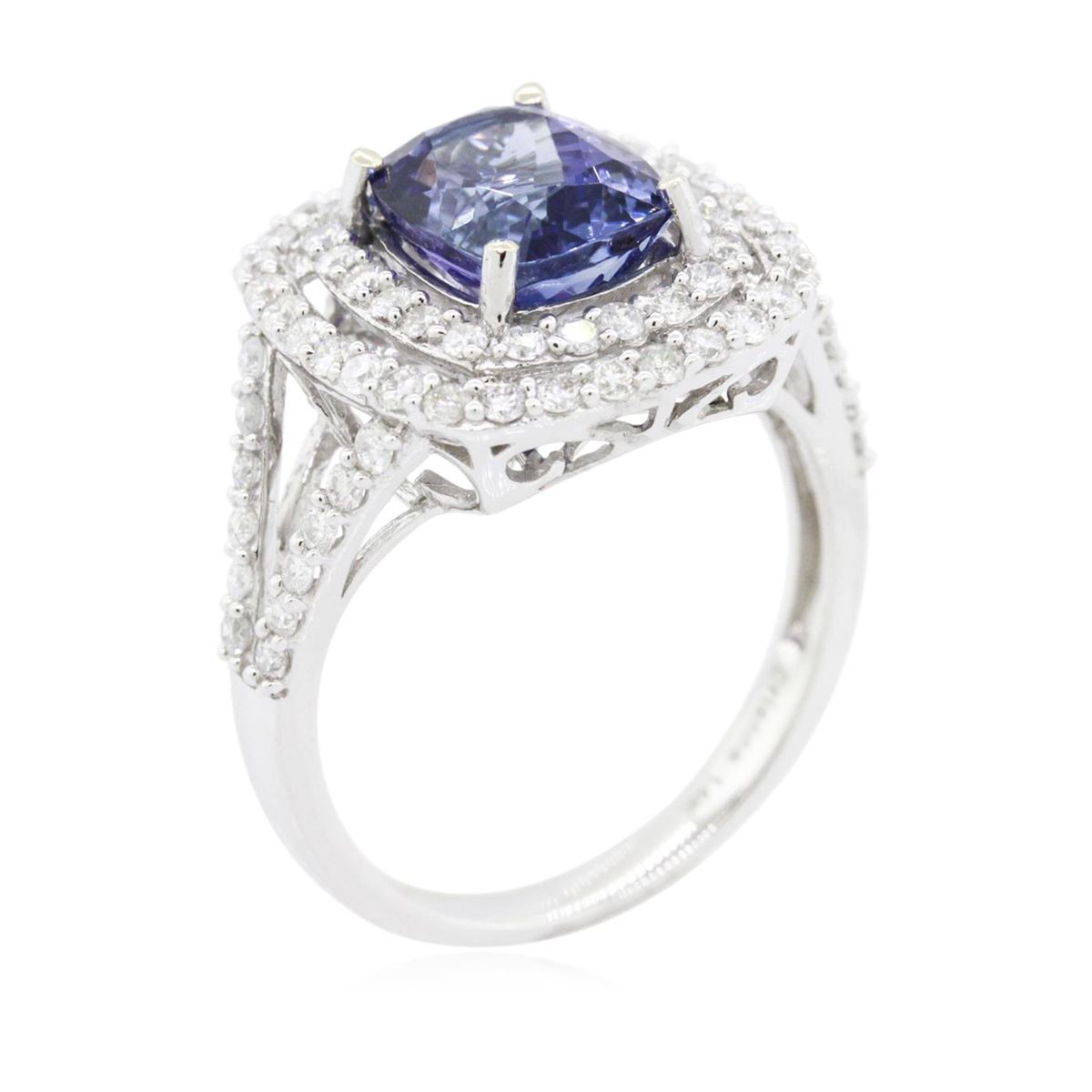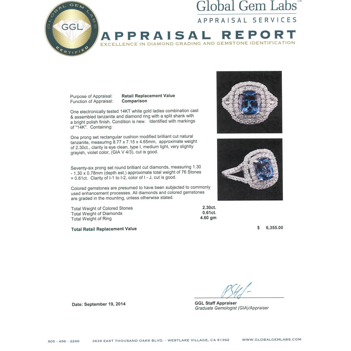 One electronically tested 14KT white gold ladies combination cast & assembled tanzanite and diamond ring with a split shank with a bright polish finish. Identified with markings of "14K". Condition is new. Containing: One prong set rectangular cushion modified brilliant cut natural tanzanite, measuring 8.77 x 7.15 x 4.65mm, approximate weight of 2.30ct., clarity is eye clean, type I, medium light, very slightly grayish, violet color, (GIA V 4/3), cut is good. Seventy-Six prong set round brilliant cut diamonds, measuring 1.30 - 1.30 x 0.78mm (depth est.) approximate total weight of 76 Stones = 0.61ct. Clarity: I-1 to I-2. Color: I - J, Cut is Good. Colored gemstones are presumed to have been subjected to commonly used enhancement processes. All diamonds and colored gemstones are graded in the mounting, unless otherwise stated. Total Weight of Colored Stones 2.30ct. Total Weight of Diamonds 0.61ct. Total Weight of Ring 4.60 grams. GGL Appraised at $6,355.00.