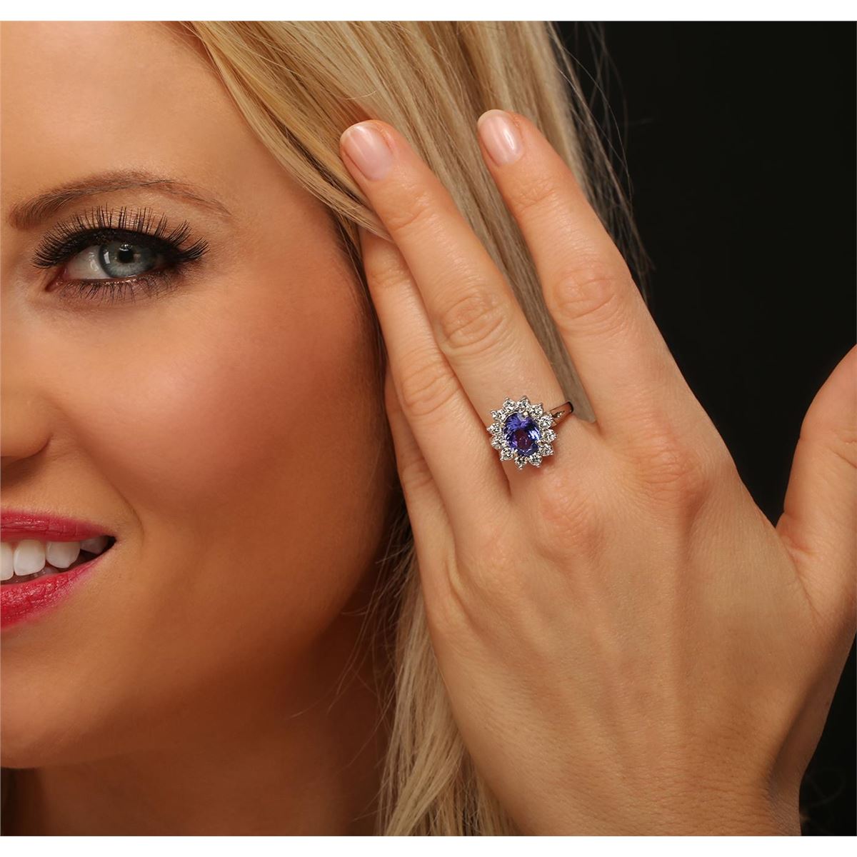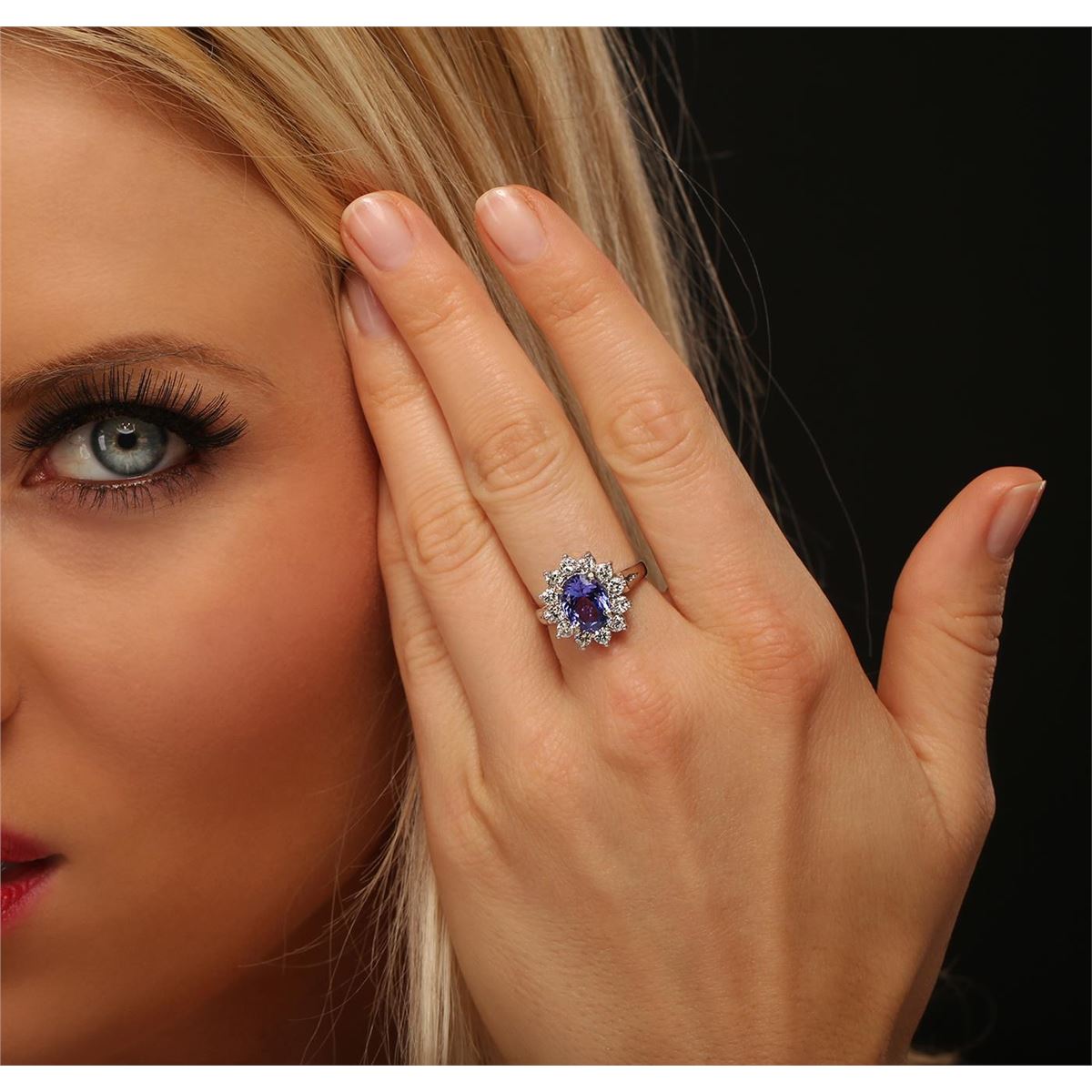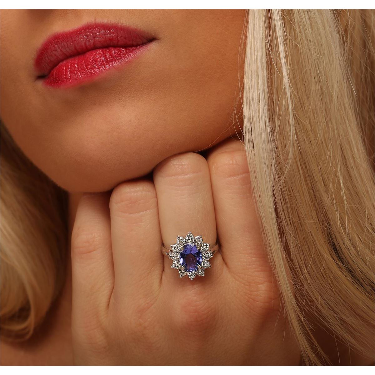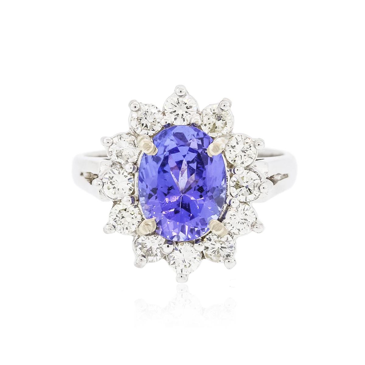 One electronically tested 14KT white gold ladies combination cast & assembled ring with a bright polish finish. Condition is new. Identified with markings of "14K". Containing: One prong set oval modified brilliant cut natural tanzanite, measuring 9.43 x 7.15 x 5.00mm, approximate weight of 2.30ct., clarity is eye clean, type I, medium, moderately strong, bluish violet color, (GIA bV 5/4), cut is good. Twelve prong set round brilliant cut diamonds, measuring 2.50 - 2.50 x 1.50mm (depth est.) approximate total weight of 12 Stones = 0.69ct. Clarity: SI-1 to SI-2. Color: K - L, Cut is Good. Colored gemstones are presumed to have been subjected to commonly used enhancement processes. All diamonds and colored gemstones are graded in the mounting, unless otherwise stated. Total Weight of Colored Stones 2.30ct. Total Weight of Diamonds 0.69ct. Total Weight of Ring 5.10 grams. GGL Appraised at $6,555.00.