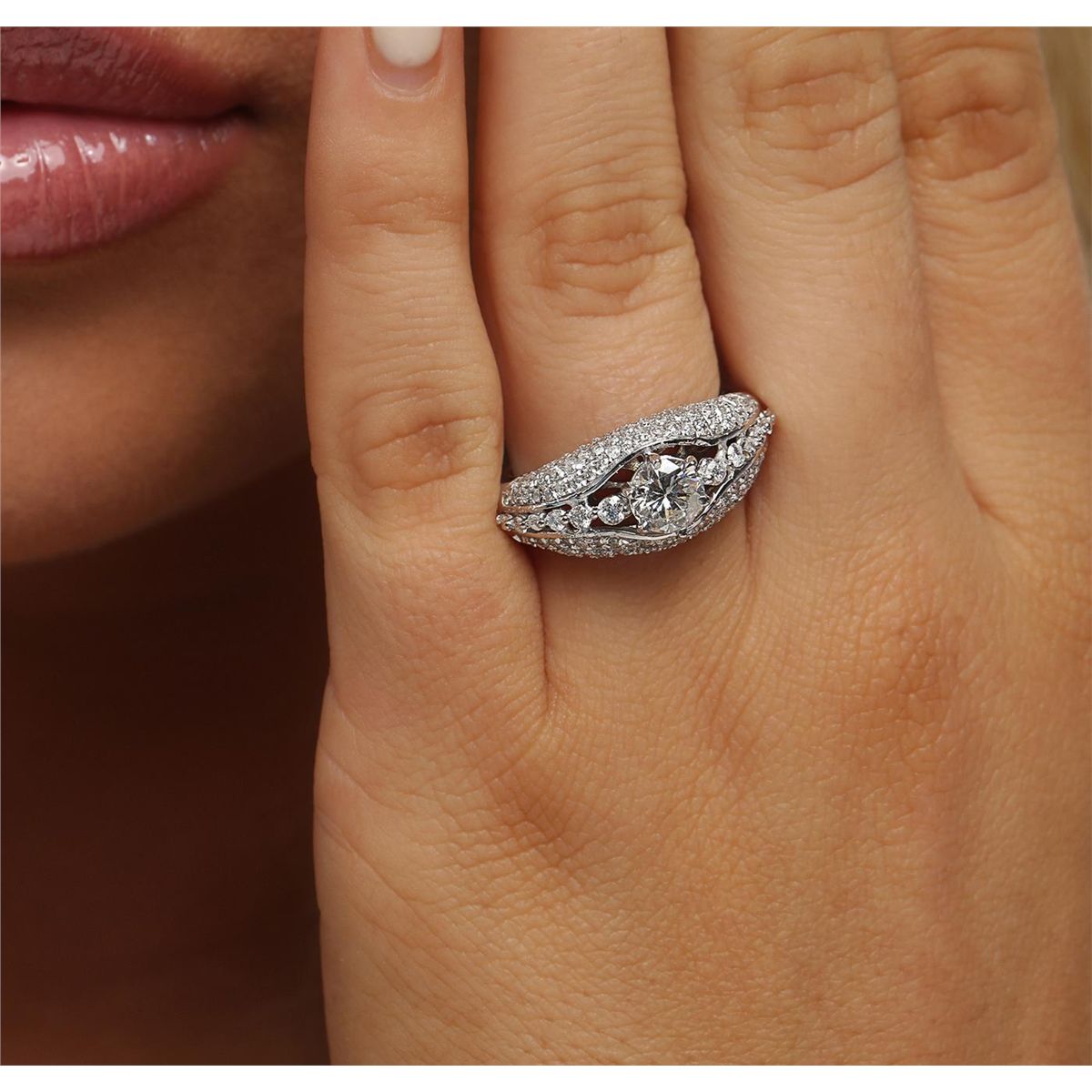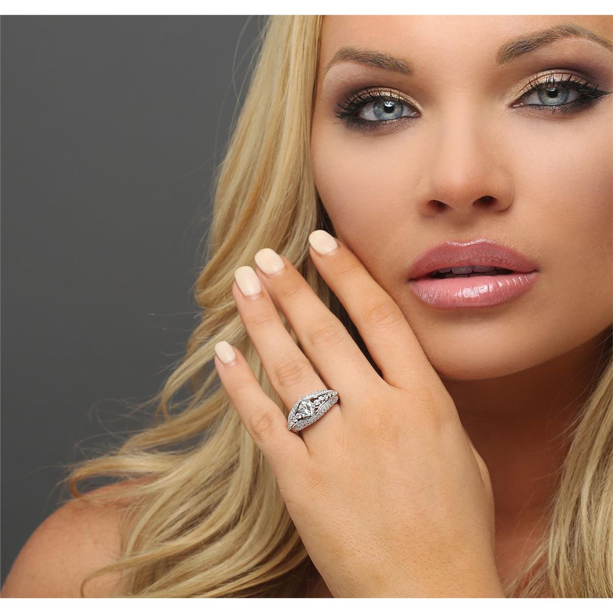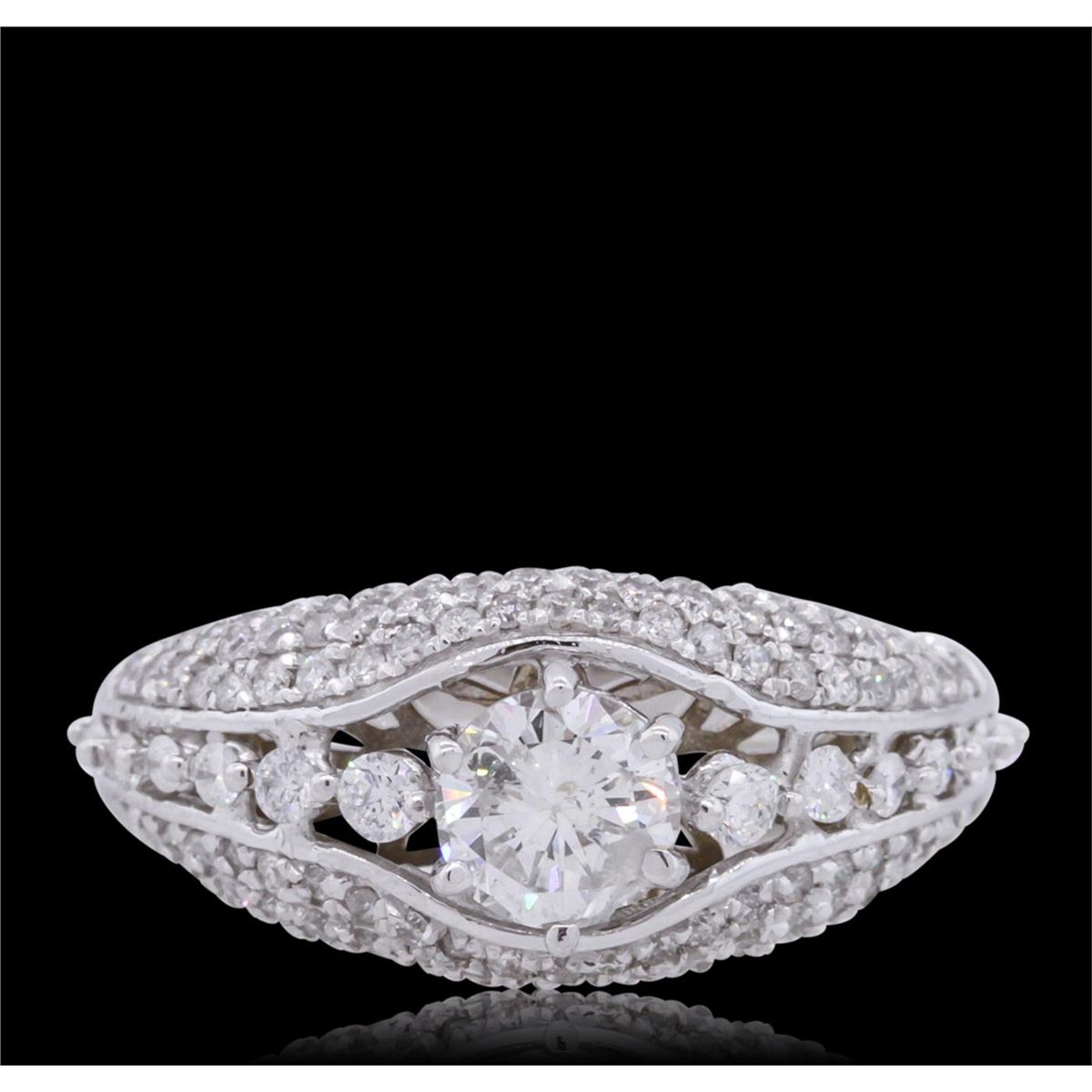 One electronically tested 14KT white gold ladies combination cast & assembled engagement ring with a bright polish finish. Identified with markings of "14K". Condition is new. Containing: One prong set round brilliant cut diamond, measuring 6.00 - 6.00 x 3.60mm (depth est.) approximate weight of 0.79ct. Clarity: I-2. Color: H, Cut is Good. One Hundred Forty-Six prong set round brilliant cut diamonds, measuring 2.10 - 1.30 x 1.02mm (depth est.) approximate total weight of 146 Stones = 1.51ct. Clarity: I-1 to I-2. Color: H - I, Cut is Good. All diamonds are graded in the mounting, unless otherwise stated. Total Weight of Diamonds 2.30ct. Total Weight of Ring 6.30 grams. GGL Appraised at $9,660.00.