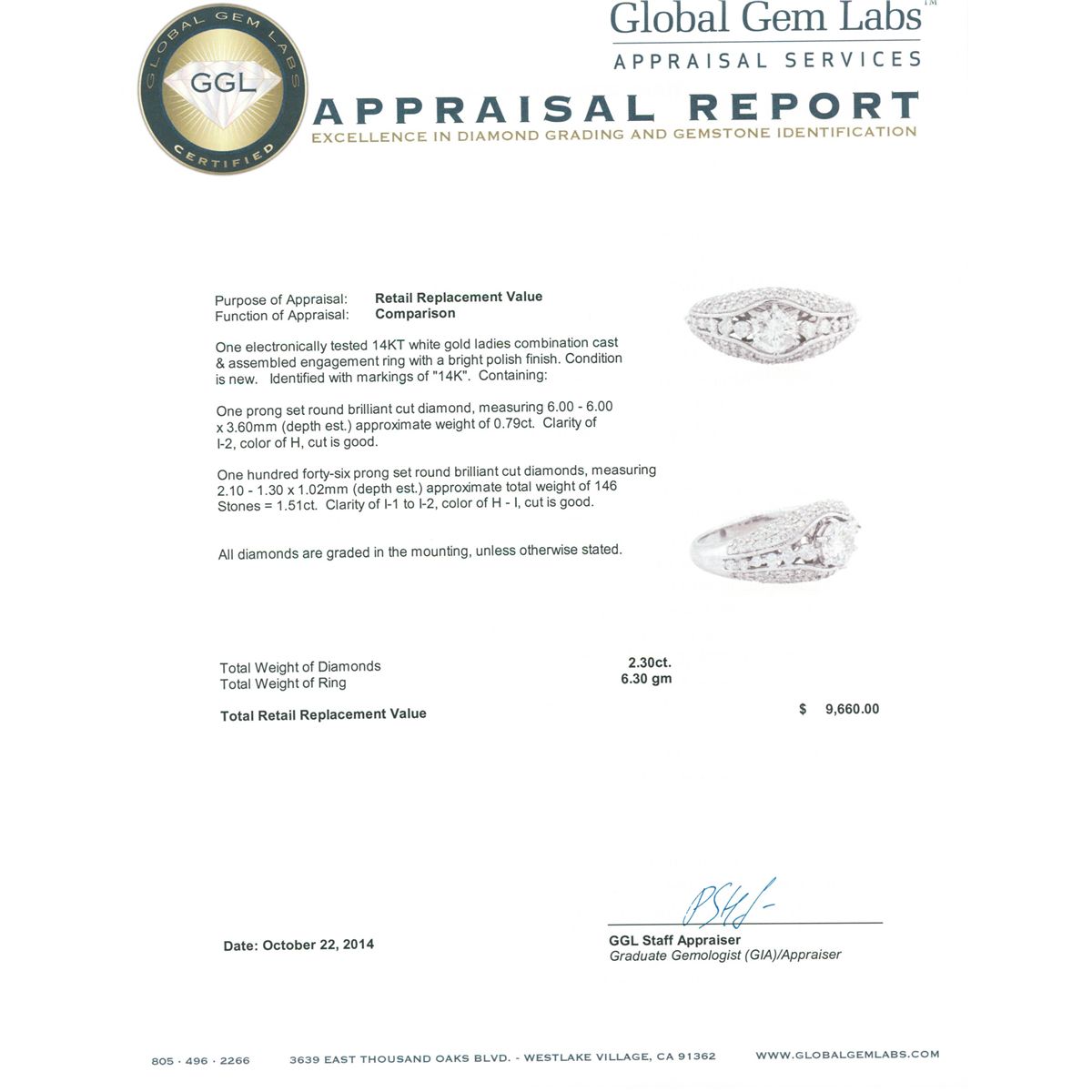 One electronically tested 14KT white gold ladies combination cast & assembled engagement ring with a bright polish finish. Identified with markings of "14K". Condition is new. Containing: One prong set round brilliant cut diamond, measuring 6.00 - 6.00 x 3.60mm (depth est.) approximate weight of 0.79ct. Clarity: I-2. Color: H, Cut is Good. One Hundred Forty-Six prong set round brilliant cut diamonds, measuring 2.10 - 1.30 x 1.02mm (depth est.) approximate total weight of 146 Stones = 1.51ct. Clarity: I-1 to I-2. Color: H - I, Cut is Good. All diamonds are graded in the mounting, unless otherwise stated. Total Weight of Diamonds 2.30ct. Total Weight of Ring 6.30 grams. GGL Appraised at $9,660.00.