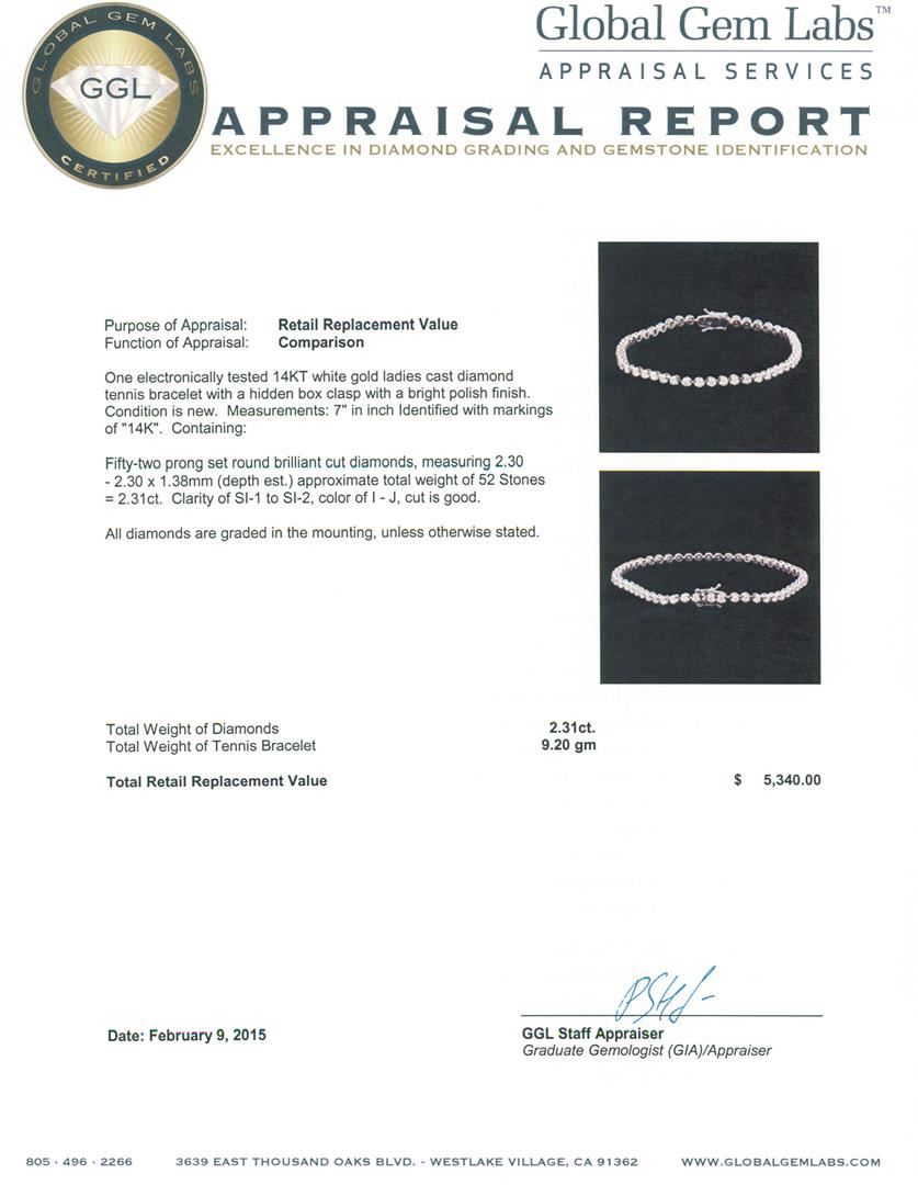 One electronically tested 14KT white gold ladies cast diamond tennis bracelet with a hidden box clasp with a bright polish finish. Measurements: 7" in inch Identified with markings of "14K". Condition is new. Containing: Fifty-Two prong set round brilliant cut diamonds, measuring 2.30 - 2.30 x 1.38mm (depth est.) approximate total weight of 52 Stones = 2.31ct. Clarity: SI-1 to SI-2. Color: I - J, Cut is Good. All diamonds are graded in the mounting, unless otherwise stated. Total Weight of Diamonds 2.31ct. Total Weight of Tennis Bracelet 9.20 grams. GGL Appraised at $5,340.00.