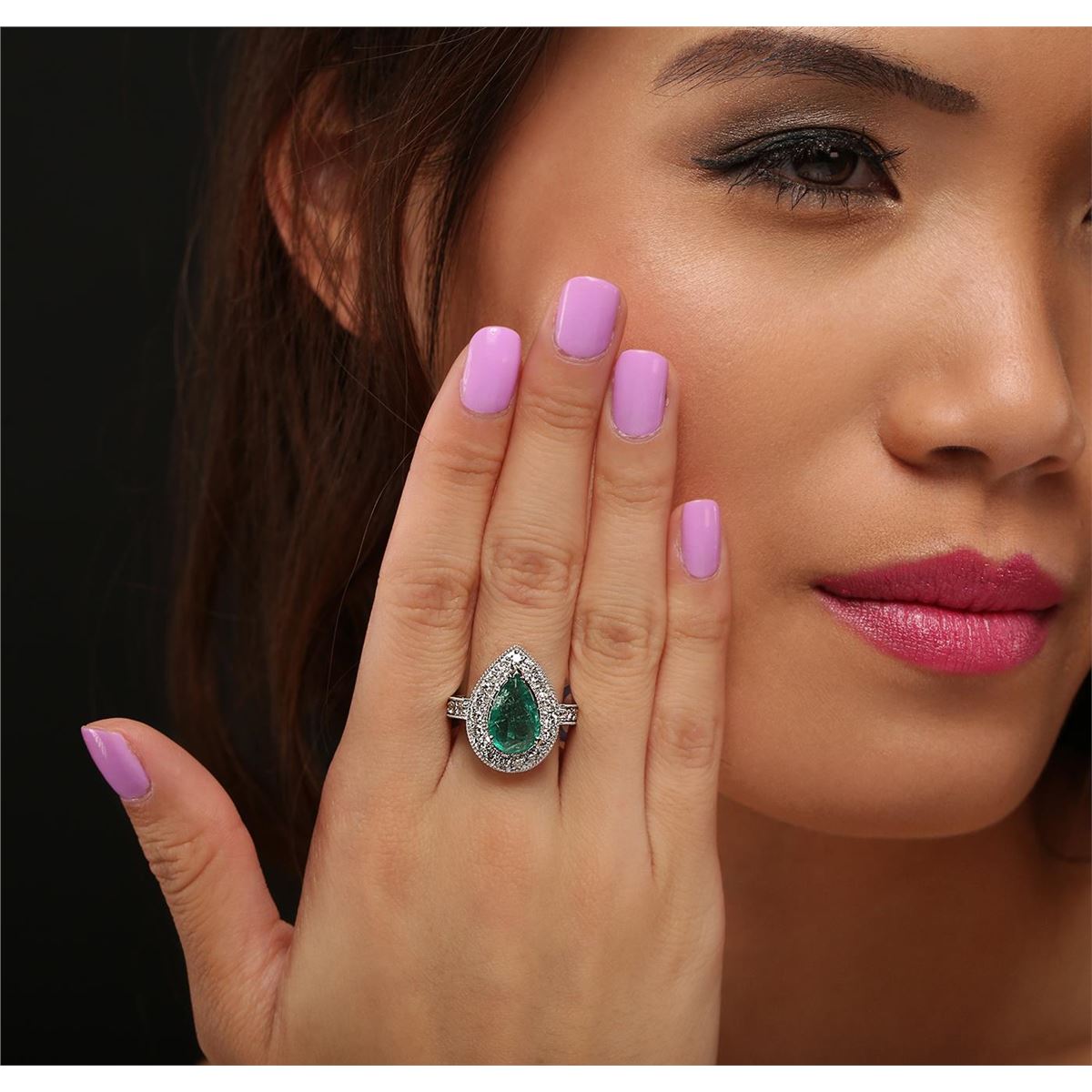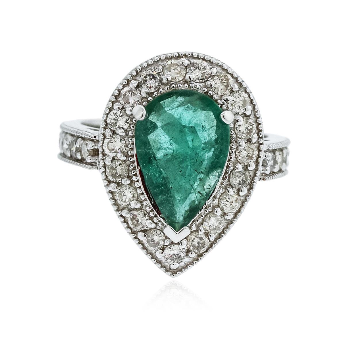 One electronically tested 14KT white gold Ladies combination cast & assembled cocktail ring with a bright polish finish. Identified with markings of "14K". Condition is excellent. Containing: One prong set pear modified brilliant cut natural emerald, measuring 13.50 x 8.50 x 3.70mm, approximate weight of 2.31ct., clarity is moderately included, type III, medium light, very slightly grayish, very slightly bluish green color, (GIA vslbG 4/3), cut is good. Colored gemstones are presumed to have been subjected to commonly used and possible undetectable color/clarity enhancement processes. Twenty-Nine prong set round brilliant cut diamonds, measuring 1.90 - 1.90 x 1.14mm (depth est.) approximate total weight of 29 Stones = 0.73ct. Clarity of SI-2 to I-1, Color of H - I, Cut is Good. Total Weight of Colored Stones 2.31ct. Total Weight of Diamonds 0.73ct. Total Weight of Ring 6.90gm. GGL Appraised at $8,450.00.