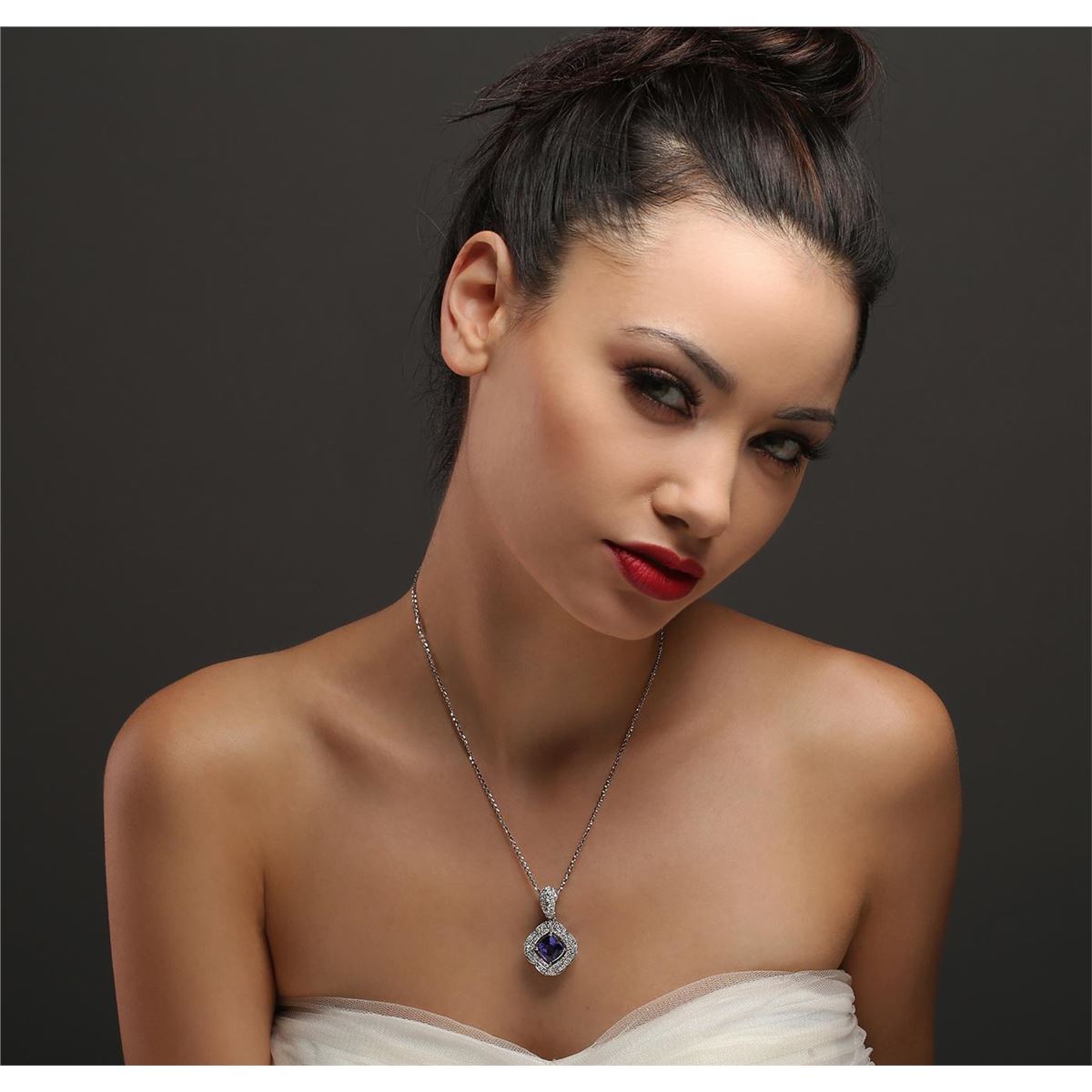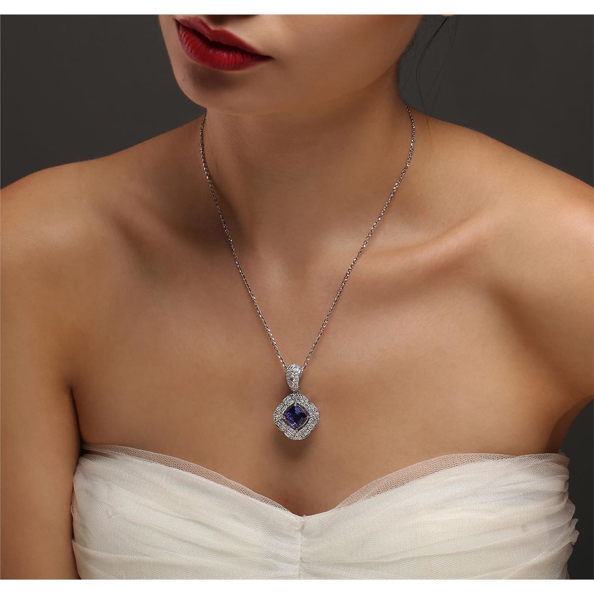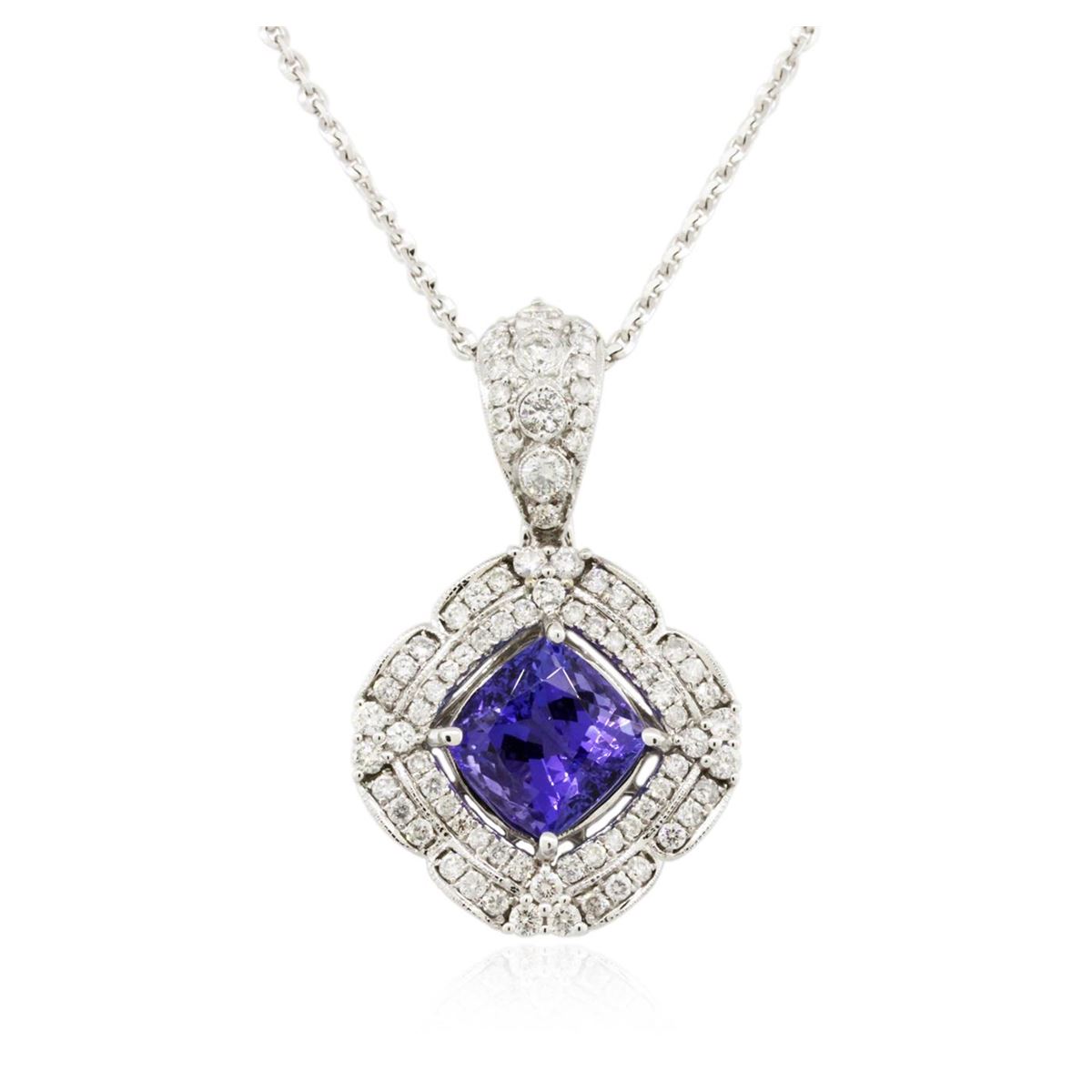 One electronically tested 14KT white gold Ladies combination cast & assembled pendant & chain 17.0" long, medium cable link with a lobster claw clasp with a bright polish finish. Condition is new. Identified with markings of "14K". Containing: One prong set square cushion modified brilliant cut natural tanzanite, measuring 7.78 x 7.56 x 4.99mm, approximate weight of 2.31ct., clarity is eye clean, type I, medium light, moderately strong, bluish violet color, (GIA bV 4/4), cut is very good. Colored gemstones are presumed to have been subjected to commonly used color/clarity enhancement processes. Four prong set round brilliant cut diamonds, measuring 3.00 - 3.00 x 1.80mm (depth est.) approximate. Total Weight of 4 Stones = 0.40ct. Clarity: I-1 to I-2. Color: I - J, Cut is Good. Seventy-Two prong set round brilliant cut diamonds, measuring 1.50 - 1.30 x 0.84mm (depth est.) approximate. Total Weight of 72 Stones = 0.72ct. Clarity: I-1 to I-2. Color: I - J, Cut is Good. Total Weight of Colored Stones 2.31ct. Total Weight of Diamonds 1.12ct. Total Weight of Pendant & Chain 14.60 grams. GGL Appraised at $10,745.00.
