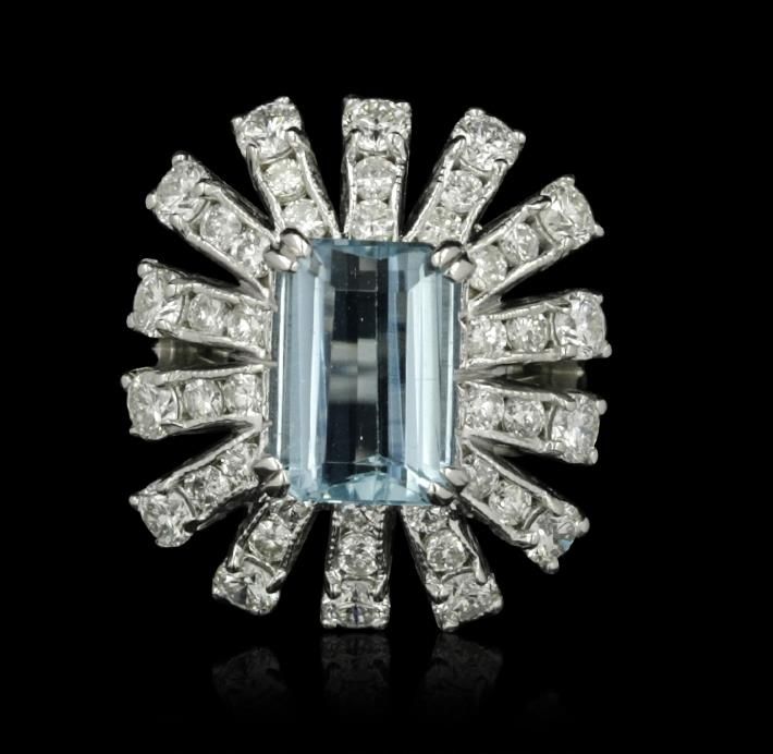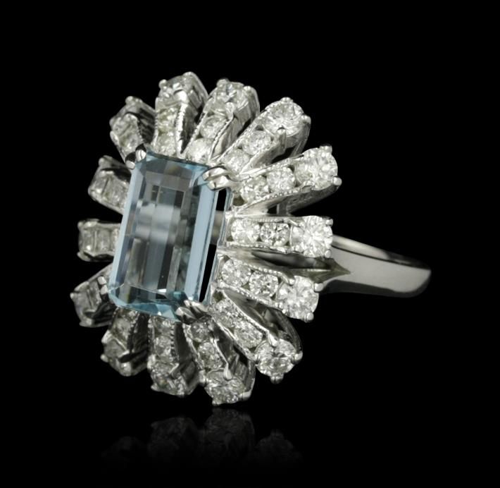 One polished, stamped, and electronically tested solid 14KT White Gold ring mounted with: 1 genuine aquamarine center stone weighing 2.31 carats and 42 genuine round diamonds weighing 1.95 carats. This item weighs 7.1 grams, condition is new, excellent workmanship. AIGL Appraised at $5,690.00.