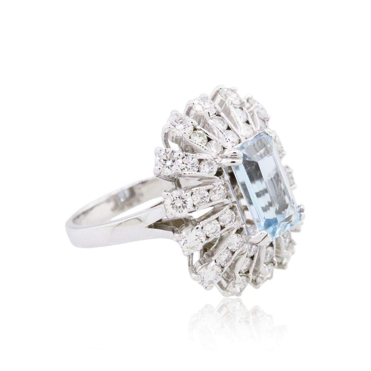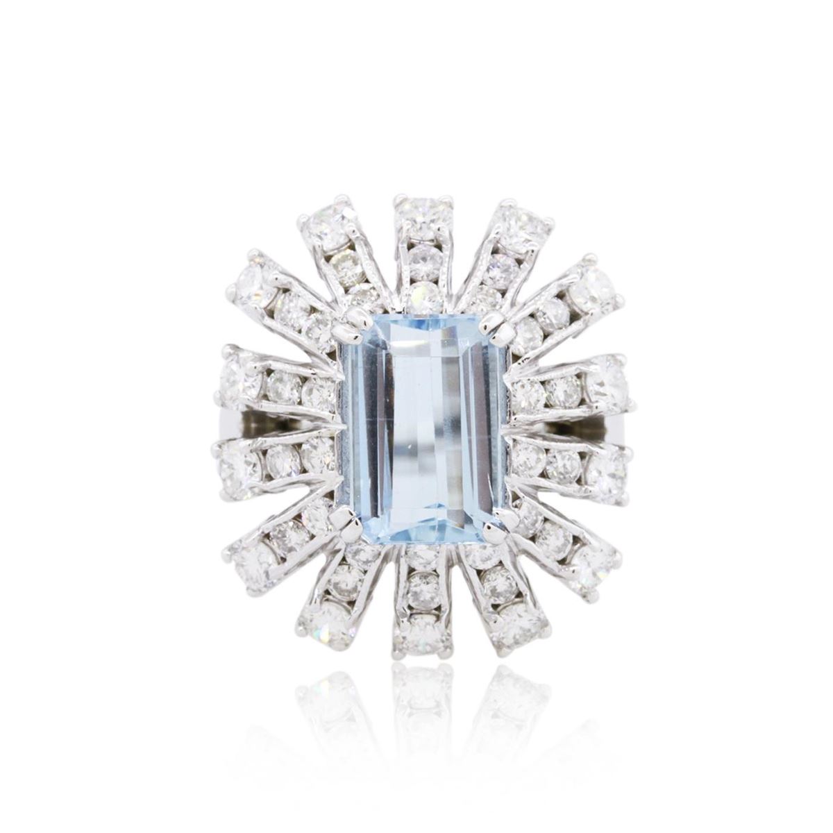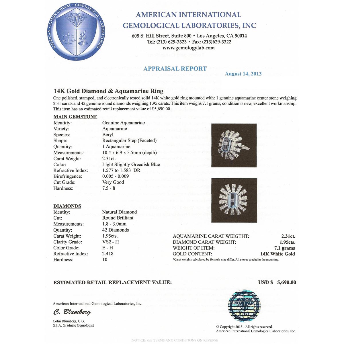 One polished, stamped, and electronically tested solid 14KT White Gold ring mounted with: 1 genuine aquamarine center stone weighing 2.31 carats and 42 genuine round diamonds weighing 1.95 carats. This item weighs 7.1 grams, condition is new, excellent workmanship. AIGL Appraised at $5,690.00.