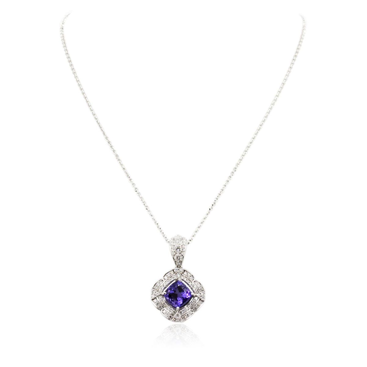 One electronically tested 14KT white gold Ladies combination cast & assembled pendant & chain 17.0" long, medium cable link with a lobster claw clasp with a bright polish finish. Condition is new. Identified with markings of "14K". Containing: One prong set square cushion modified brilliant cut natural tanzanite, measuring 7.78 x 7.56 x 4.99mm, approximate weight of 2.31ct., clarity is eye clean, type I, medium light, moderately strong, bluish violet color, (GIA bV 4/4), cut is very good. Colored gemstones are presumed to have been subjected to commonly used color/clarity enhancement processes. Four prong set round brilliant cut diamonds, measuring 3.00 - 3.00 x 1.80mm (depth est.) approximate. Total Weight of 4 Stones = 0.40ct. Clarity: I-1 to I-2. Color: I - J, Cut is Good. Seventy-Two prong set round brilliant cut diamonds, measuring 1.50 - 1.30 x 0.84mm (depth est.) approximate. Total Weight of 72 Stones = 0.72ct. Clarity: I-1 to I-2. Color: I - J, Cut is Good. Total Weight of Colored Stones 2.31ct. Total Weight of Diamonds 1.12ct. Total Weight of Pendant & Chain 14.60 grams. GGL Appraised at $10,745.00.