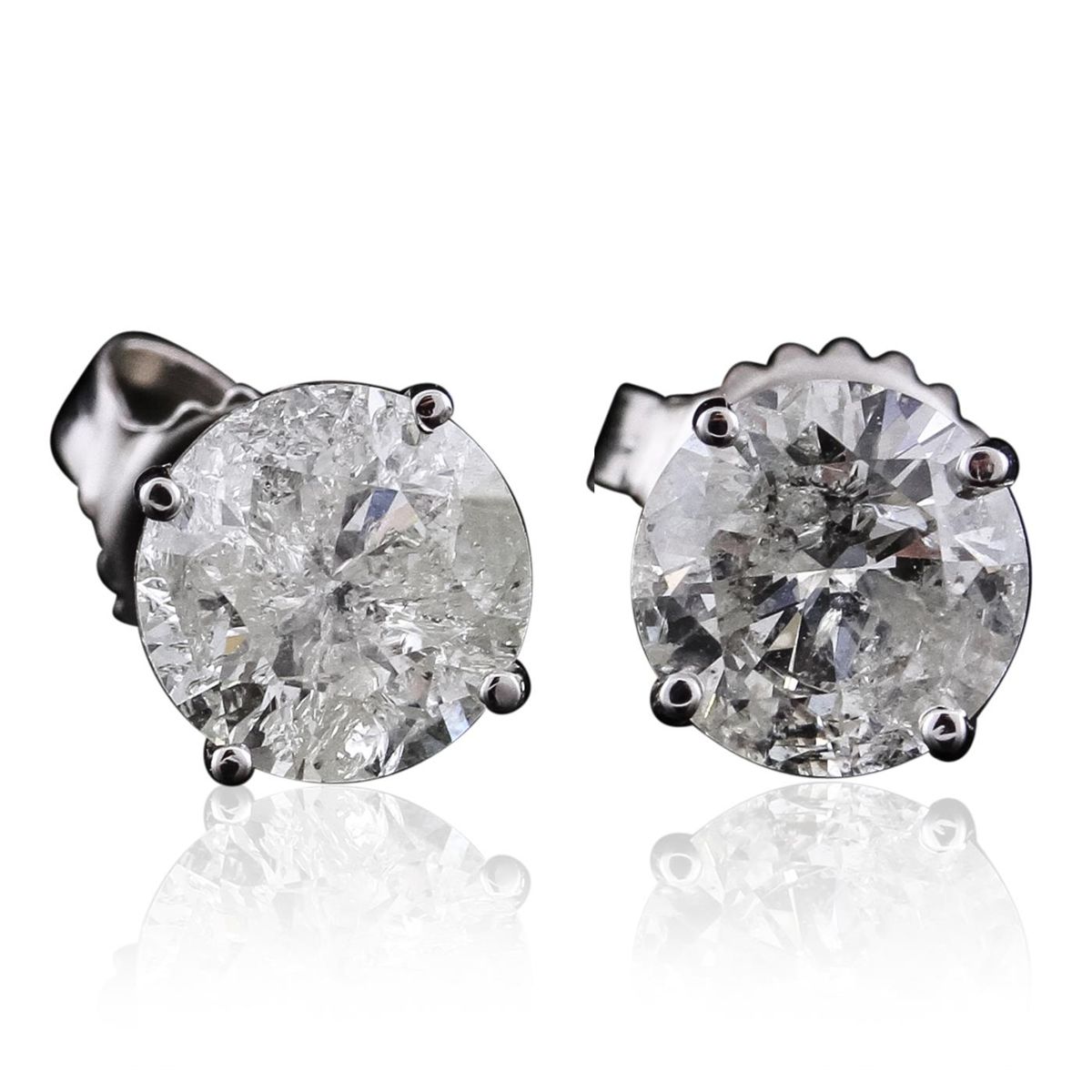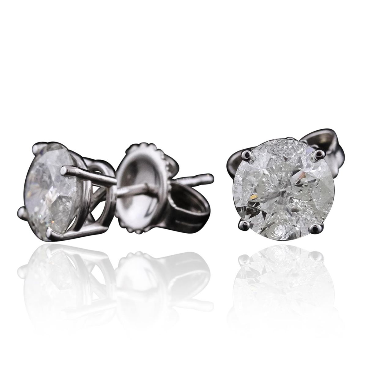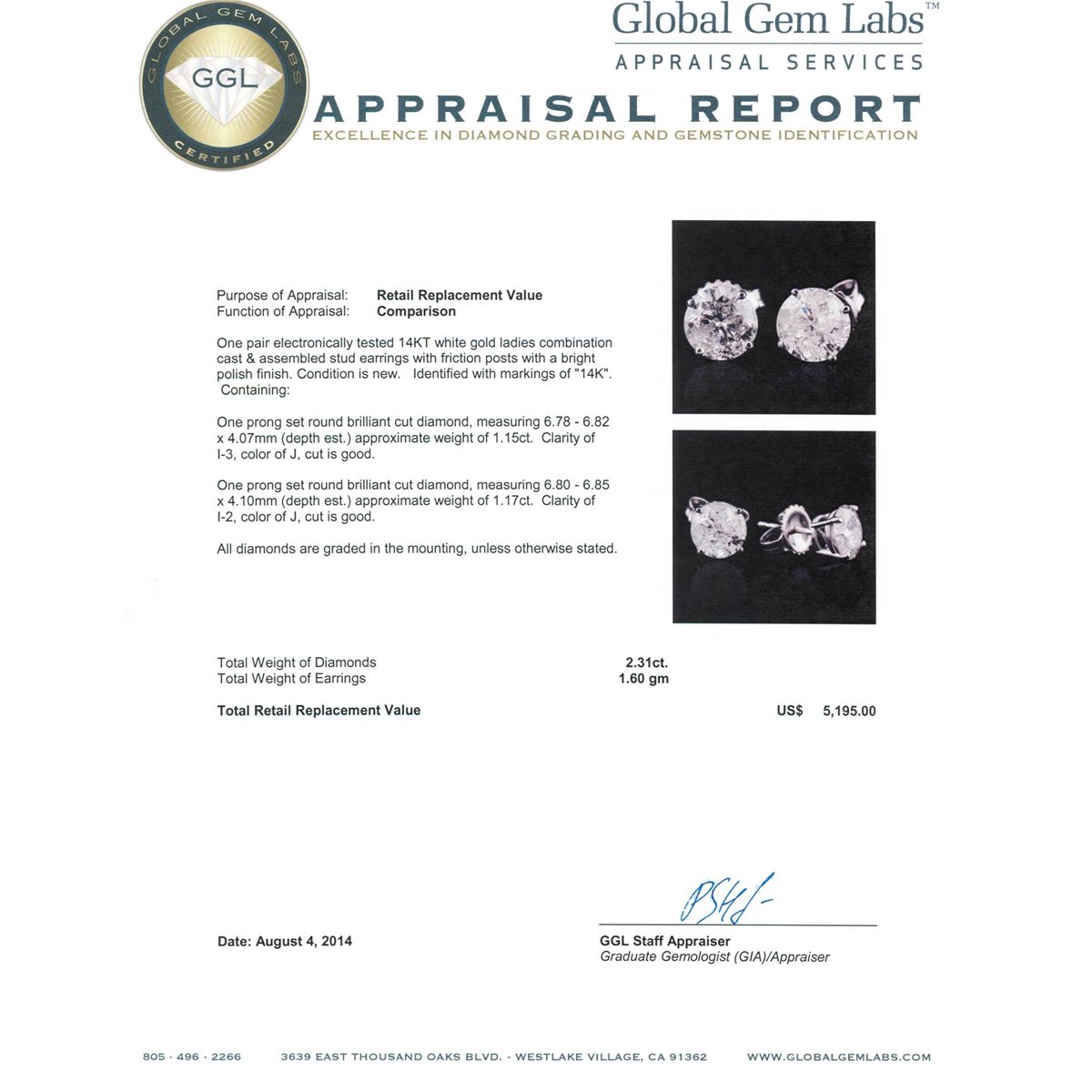 One pair electronically tested 14KT white gold ladies combination cast & assembled stud earrings with friction posts with a bright polish finish. Condition is new. Identified with markings of "14K". Containing: One prong set round brilliant cut diamond, measuring 6.78 - 6.82 x 4.07mm (depth est.) approximate weight of 1.15ct. Clarity: I-3. Color: J, Cut is Good. One prong set round brilliant cut diamond, measuring 6.80 - 6.85 x 4.10mm (depth est.) approximate weight of 1.17ct. Clarity: I-2. Color: J, Cut is Good. All diamonds are graded in the mounting, unless otherwise stated. Total Weight of Diamonds 2.31ct. Total Weight of Earrings 1.60 grams. GGL Appraised at $5,195.00.