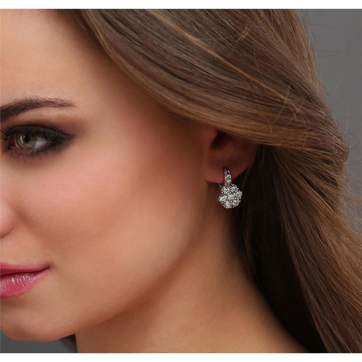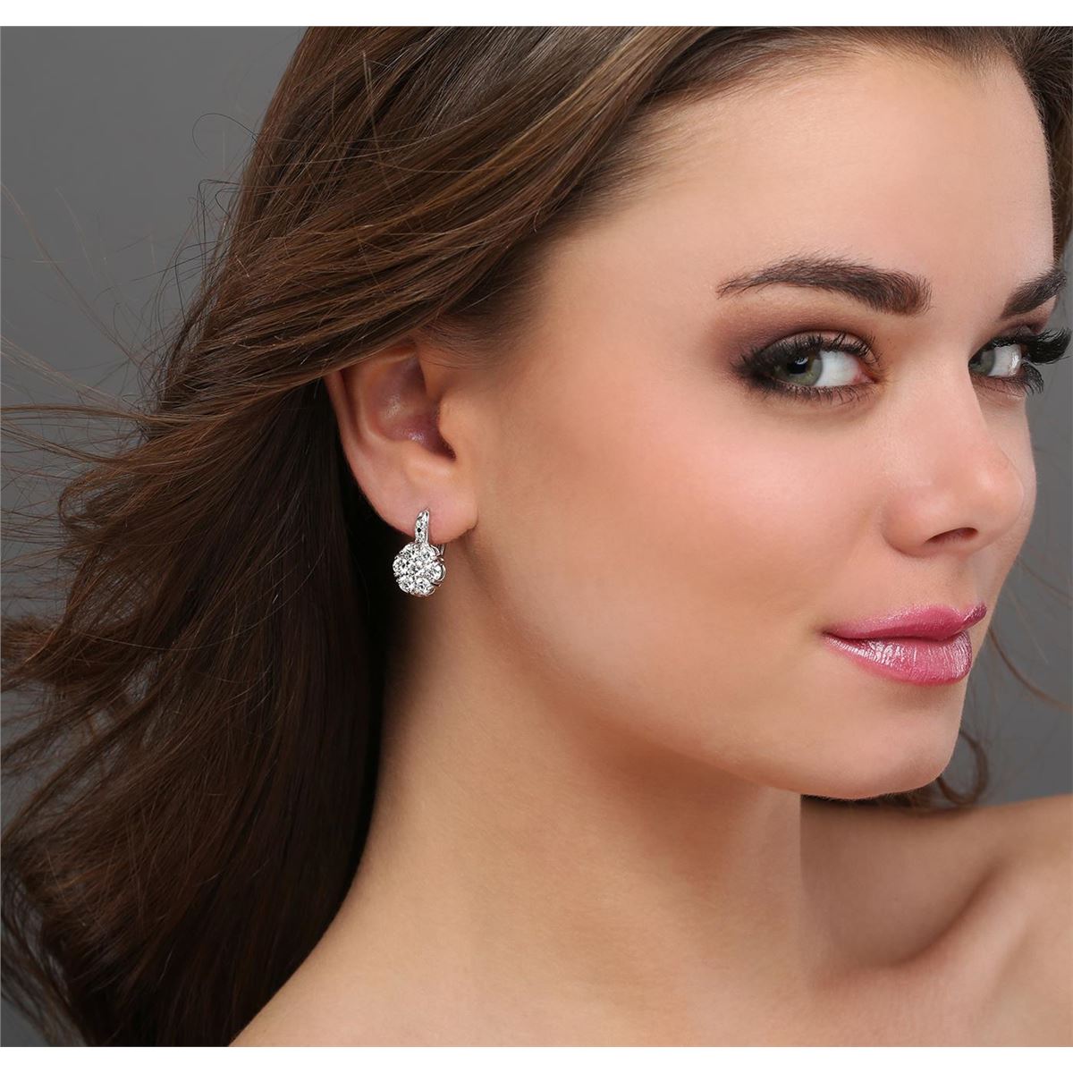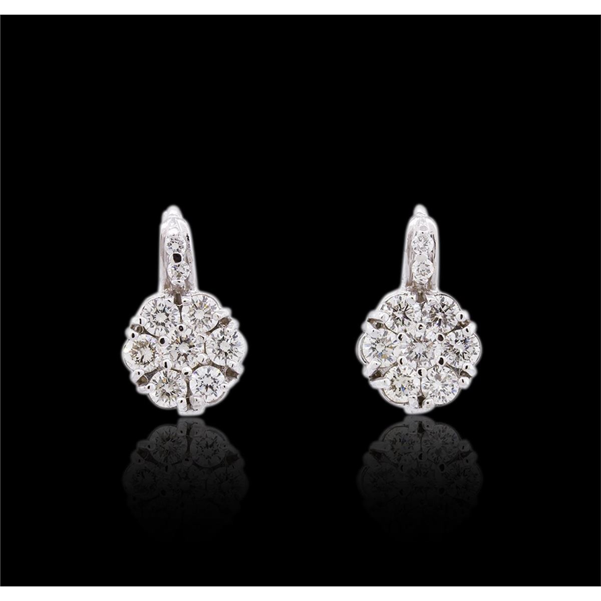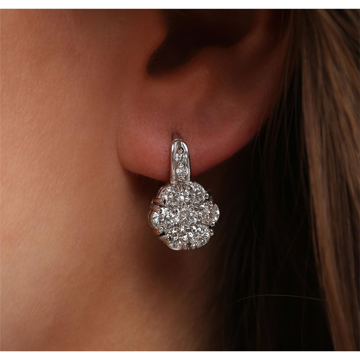 One pair electronically tested 14KT white gold ladies combination cast & assembled diamond earrings with lever backs with a bright polish finish. Identified with markings of "14K". Condition is new. Containing: Fourteen prong set round brilliant cut diamonds, measuring 3.50 - 3.50 x 2.10mm (depth est.) approximate total weight of 14 Stones = 2.20ct. Clarity: SI-1 to I-1. Color: J - K, Cut is Good. Four prong set round brilliant cut diamonds, measuring 2.00 - 2.00 x 1.20mm (depth est.) approximate total weight of 4 Stones = 0.12ct. Clarity: I-1. Color: J, Cut is Good. All diamonds are graded in the mounting, unless otherwise stated. Total Weight of Diamonds 2.31ct. Total Weight of Earrings 7.40 grams. GGL Appraised at $7,175.00.