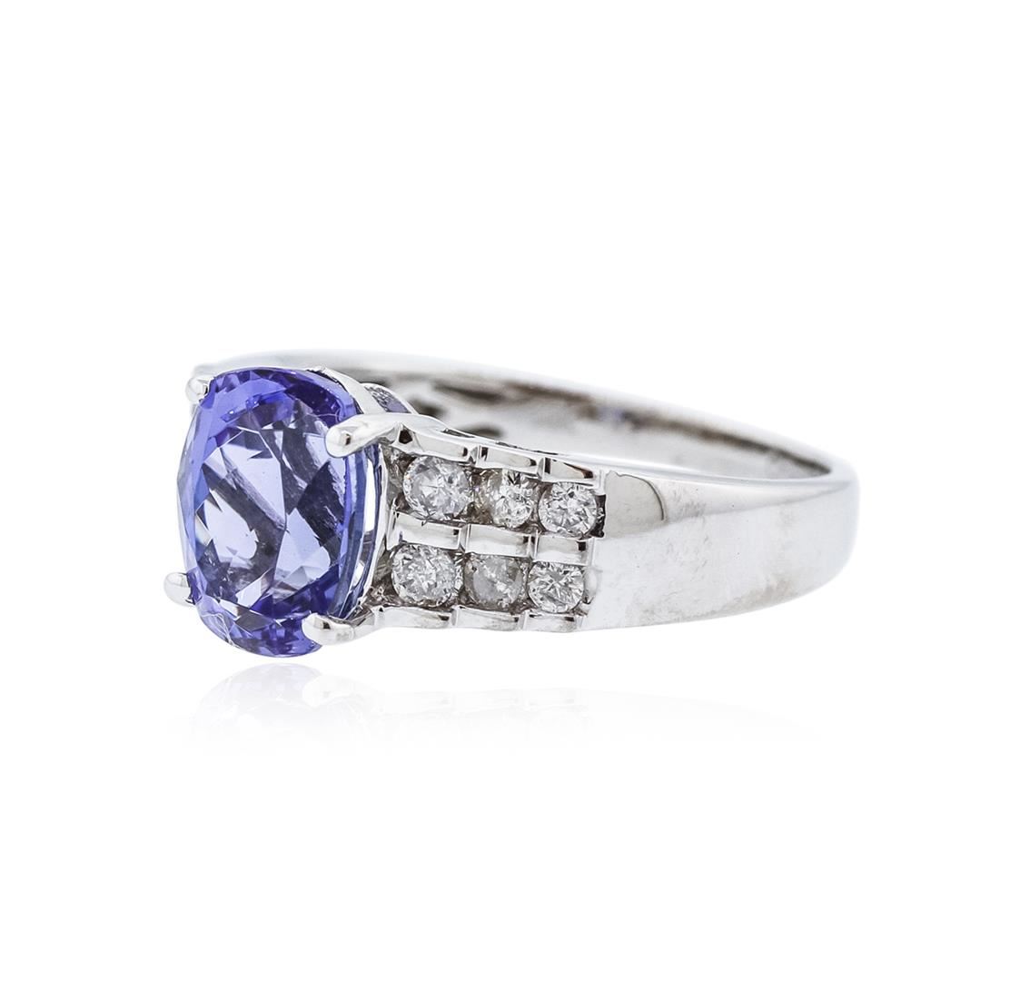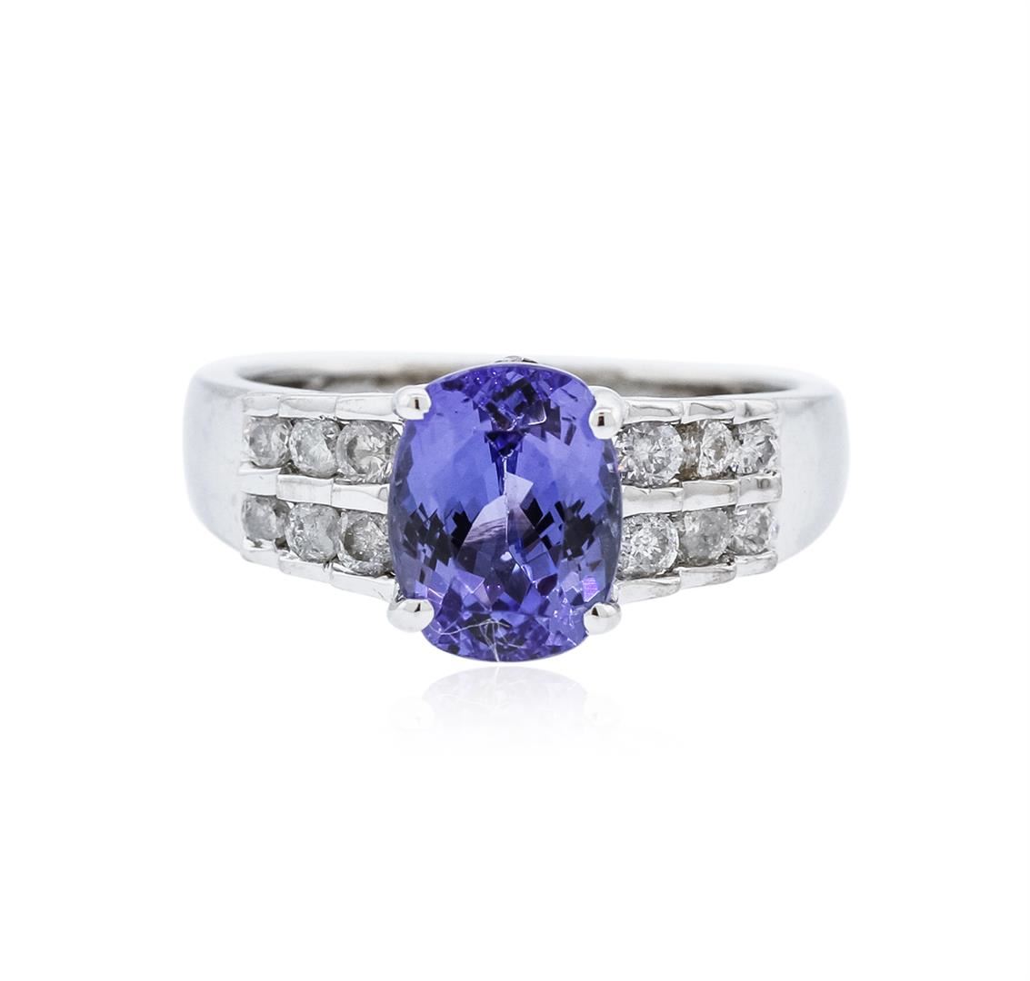 One electronically tested 14KT white gold ladies cast tanzanite and diamond ring with a tapered shank with a bright polish finish. Trademark is Orianne. Identified with markings of "14K". Condition is new. Containing: One prong set oval modified brilliant cut natural tanzanite, measuring 8.89 x 6.92 x 5.37mm, approximate weight of 2.32ct., clarity is eye clean, type I, medium light, very slightly grayish, violet color, (GIA V 4/3), cut is good. Twelve channel set round brilliant cut diamonds, measuring 2.00 - 2.00 x 1.20mm (depth est.) approximate total weight of 12 Stones = 0.35ct. Clarity: I-1 to I-2. Color: I - J. All diamonds and colored gemstones are graded in the mounting, unless otherwise stated. Colored gemstones are presumed to have been subjected to commonly used enhancement processes. Total Weight of Colored Stones 2.32ct. Total Weight of Diamonds 0.35ct. Total Weight of Ring 4.30 grams. GGL Appraised at $3,615.00.