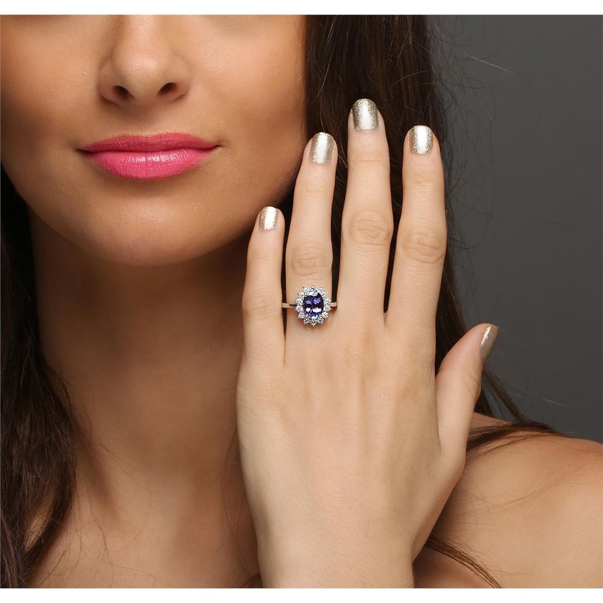 One electronically tested 14KT white gold ladies cast tanzanite & diamond ring with a bright finish. The featured tanzanite is set within a diamond bezel, supported by an elaborate white gold under gallery, completed by a three millimeter wide band. Identified with markings of "14K". Condition is new, good workmanship. Containing: One prong set oval mixed cut natural tanzanite, measuring 9.70 x 7.33 x 4.80mm, approximate weight of 2.33ct., clarity is eye clean, type I, medium dark, slightly grayish, bluish violet color, (GIA bV 6/2), cut is good. Transmitting light with no distortion, transparent. Graded in the setting. Tanzanite is a very rare gemstone that is only found in the country of Tanzania. Originally discovered in 1967. Tiffany & Company, named the stone Tanzanite. It is found in the Usumburu Mountains that border the Umba Valley of northern Tanzania. Tanzanite occurs in gray, brown, violet, blue, reddish-purple, & green. The gem is interesting because of its exceptional pleochroism. Rotated in different directions a tanzanite will exhibit multiple changes of color. Tanzanite has a low tolerance to ultrasonic cleaning, and should not be cleaned using this method. Fourteen prong set round brilliant cut diamonds, measuring 2.30 - 2.20 x 1.38mm (depth est.) approximate total weight of 14 Stones = 0.60ct. Graded in the setting. Clarity: SI-2 to I-2. Color: H - I. Total Weight of Colored Stones 2.33ct. Total Weight of Diamonds 0.60ct. Total Weight of Ring 4.32 grams. AIG Appraised at $6,200.00.