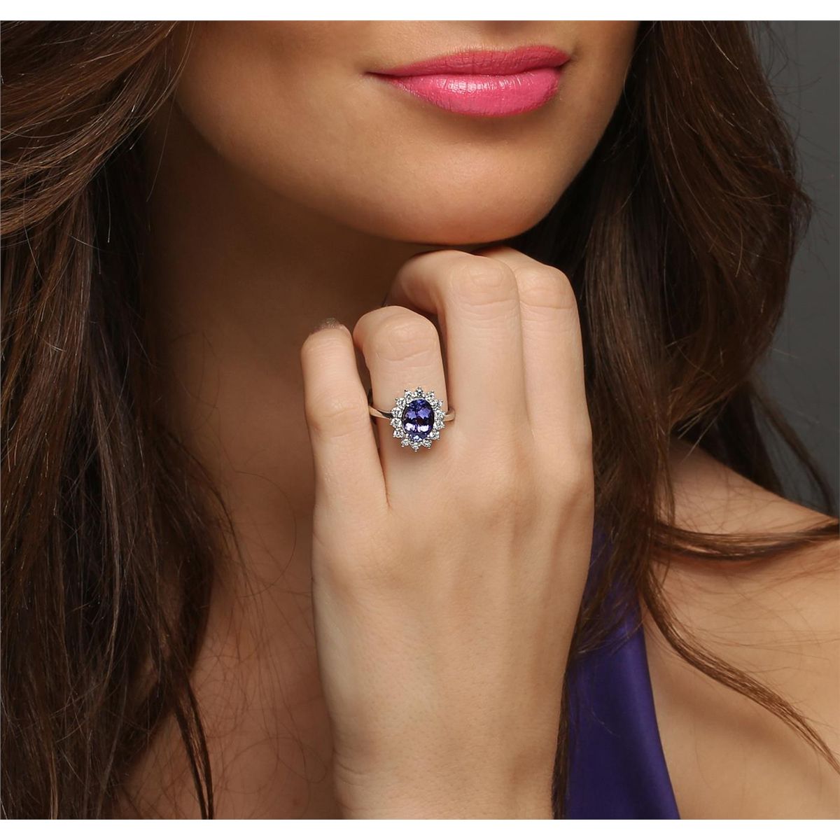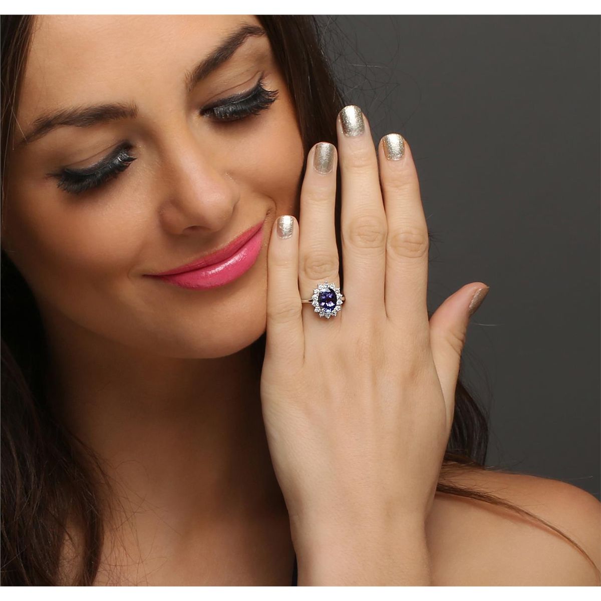 One electronically tested 14KT white gold ladies cast tanzanite & diamond ring with a bright finish. The featured tanzanite is set within a diamond bezel, supported by an elaborate white gold under gallery, completed by a three millimeter wide band. Identified with markings of "14K". Condition is new, good workmanship. Containing: One prong set oval mixed cut natural tanzanite, measuring 9.70 x 7.33 x 4.80mm, approximate weight of 2.33ct., clarity is eye clean, type I, medium dark, slightly grayish, bluish violet color, (GIA bV 6/2), cut is good. Transmitting light with no distortion, transparent. Graded in the setting. Tanzanite is a very rare gemstone that is only found in the country of Tanzania. Originally discovered in 1967. Tiffany & Company, named the stone Tanzanite. It is found in the Usumburu Mountains that border the Umba Valley of northern Tanzania. Tanzanite occurs in gray, brown, violet, blue, reddish-purple, & green. The gem is interesting because of its exceptional pleochroism. Rotated in different directions a tanzanite will exhibit multiple changes of color. Tanzanite has a low tolerance to ultrasonic cleaning, and should not be cleaned using this method. Fourteen prong set round brilliant cut diamonds, measuring 2.30 - 2.20 x 1.38mm (depth est.) approximate total weight of 14 Stones = 0.60ct. Graded in the setting. Clarity: SI-2 to I-2. Color: H - I. Total Weight of Colored Stones 2.33ct. Total Weight of Diamonds 0.60ct. Total Weight of Ring 4.32 grams. AIG Appraised at $6,200.00.