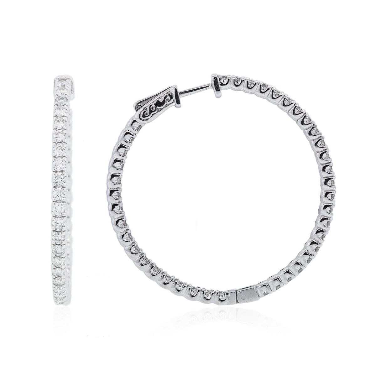 One pair electronically tested 14KT white gold ladies cast hoop earrings with hinged clip backs with a bright polish finish. Measurements: 1.50" in diameter Condition is new. Containing: Eighty prong set round brilliant cut diamonds, measuring 2.00 - 2.00 x 1.20mm (depth est.) approximate total weight of 80 Stones = 2.34ct. Clarity: SI-1 to I-1. Color: I - J, Cut is Good. All diamonds are graded in the mounting, unless otherwise stated. Total Weight of Diamonds 2.34ct. Total Weight of Earrings 14.80 grams. GGL Appraised at $11,080.00.