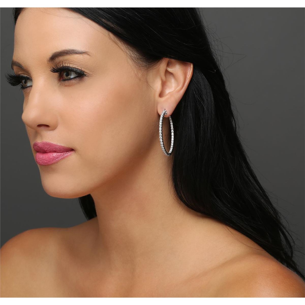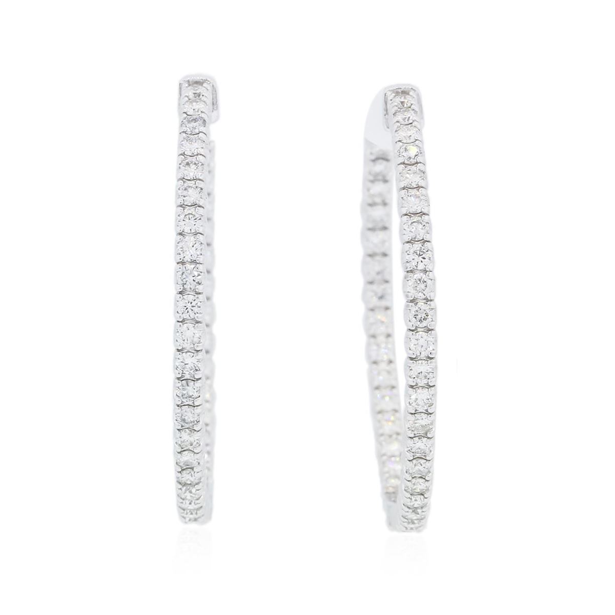 One pair electronically tested 14KT white gold ladies cast hoop earrings with hinged clip backs with a bright polish finish. Measurements: 1.50" in diameter Condition is new. Containing: Eighty prong set round brilliant cut diamonds, measuring 2.00 - 2.00 x 1.20mm (depth est.) approximate total weight of 80 Stones = 2.34ct. Clarity: SI-1 to I-1. Color: I - J, Cut is Good. All diamonds are graded in the mounting, unless otherwise stated. Total Weight of Diamonds 2.34ct. Total Weight of Earrings 14.80 grams. GGL Appraised at $11,080.00.