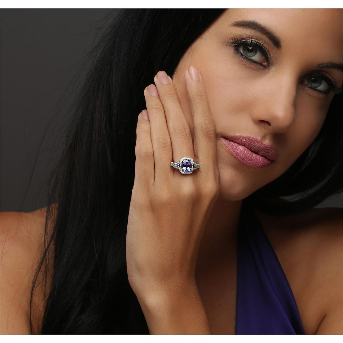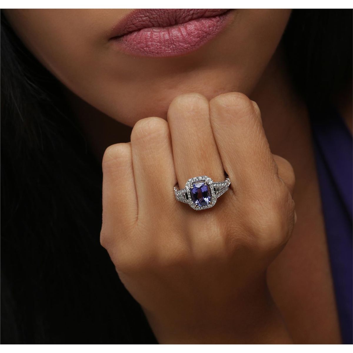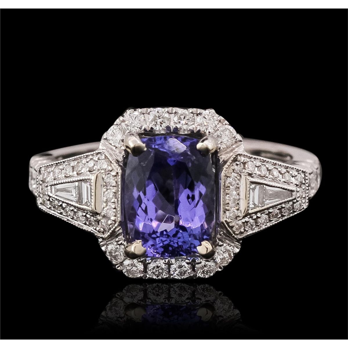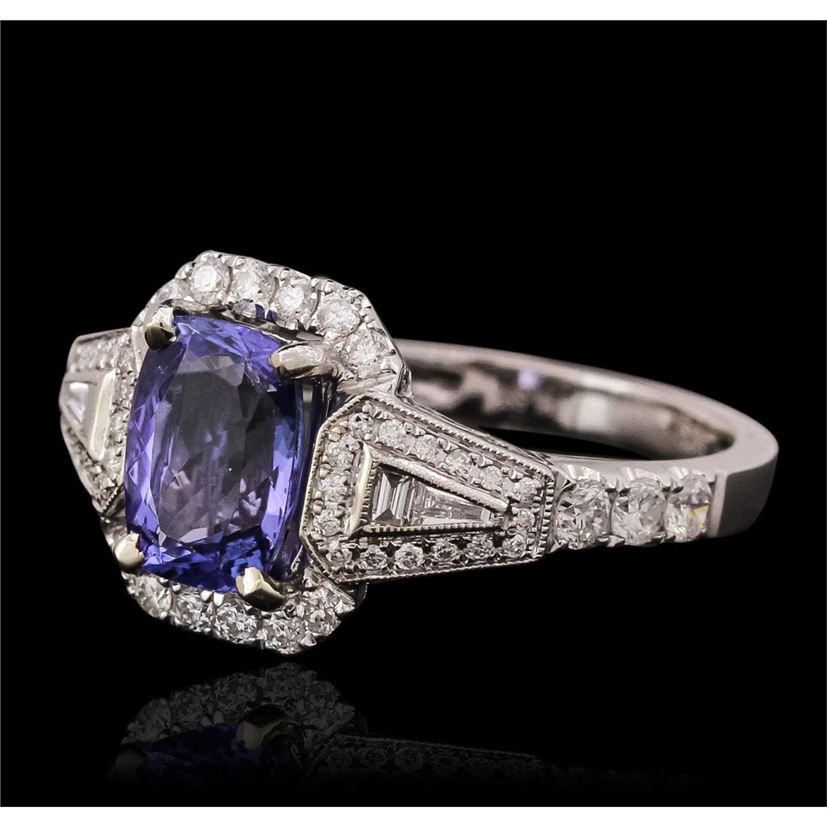 One electronically tested 14KT white gold ladies combination cast & assembled tanzanite and diamond ring with a flat shank with a bright polish finish. Identified with markings of "14K". Condition is new. Containing: One prong set rectangular cushion modified brilliant cut natural tanzanite, measuring 8.52 x 7.36 x 4.76mm, approximate weight of 2.35ct., clarity is eye clean, type I, medium light, moderately strong, bluish violet color, (GIA bV 4/4), cut is good. Eighteen prong set round brilliant cut diamonds, measuring 2.00 - 1.60 x 1.08mm (depth est.) approximate total weight of 18 Stones = 0.38ct. Clarity: SI-1 to I-1. Color: I - J, Cut is Good. Thirty prong set round brilliant cut diamonds, measuring 1.00 - 1.00 x 0.60mm (depth est.) approximate total weight of 30 Stones = 0.11ct. Clarity: SI-2 to I-1. Color: I - J, Cut is Good. Four channel set baguette cut (tapered) diamonds, measuring from 1.50 x 1.10 x 0.94mm (depth est.) to 2.00 x 1.10 x 0.94mm (depth est.) approximate total weight of 4 Stones = 0.07ct. Clarity: VS-2. Color: I, Cut is Good. Colored gemstones are presumed to have been subjected to commonly used enhancement processes. All diamonds and colored gemstones are graded in the mounting, unless otherwise stated. Total Weight of Colored Stones 2.35ct. Total Weight of Diamonds 0.56ct. Total Weight of Ring 5.00 grams. GGL Appraised at $6,845.00.