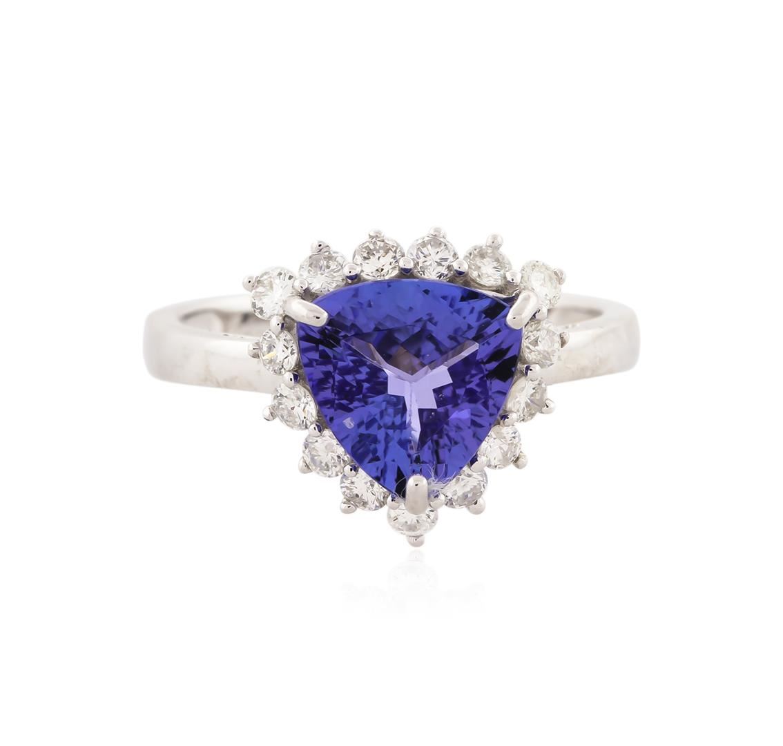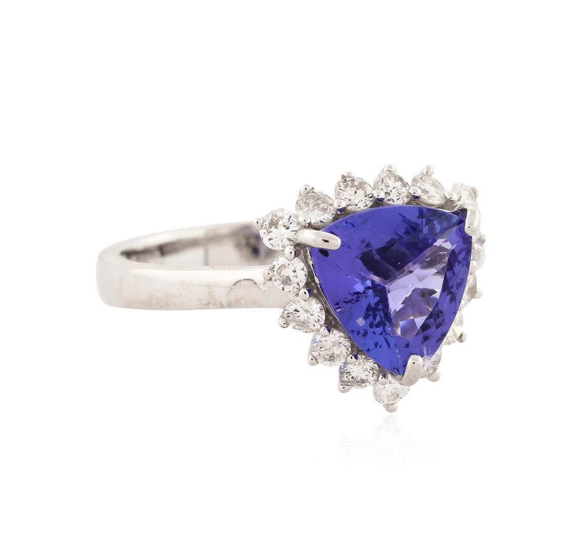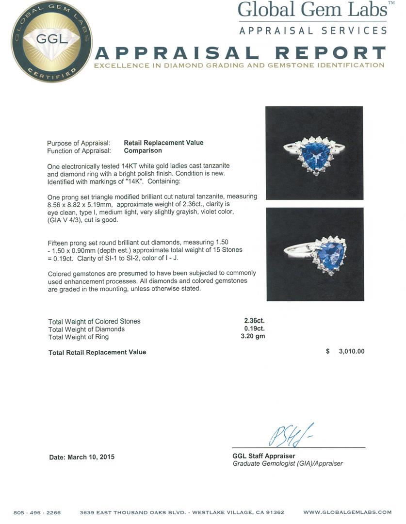 One electronically tested 14KT white gold ladies cast tanzanite and diamond ring with a bright polish finish. Identified with markings of "14K". Condition is new. Containing: One prong set triangle modified brilliant cut natural tanzanite, measuring 8.56 x 8.82 x 5.19mm, approximate weight of 2.36ct., clarity is eye clean, type I, medium light, very slightly grayish, violet color, (GIA V 4/3), cut is good. Fifteen prong set round brilliant cut diamonds, measuring 1.50 - 1.50 x 0.90mm (depth est.) approximate total weight of 15 Stones = 0.19ct. Clarity: SI-1 to SI-2. Color: I - J. Colored gemstones are presumed to have been subjected to commonly used enhancement processes. All diamonds and colored gemstones are graded in the mounting, unless otherwise stated. Total Weight of Colored Stones 2.36ct. Total Weight of Diamonds 0.19ct. Total Weight of Ring 3.20 grams. GGL Appraised at $3,010.00.