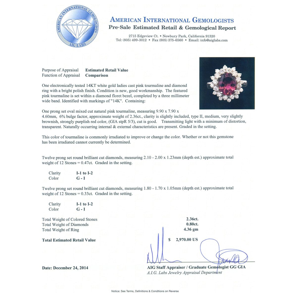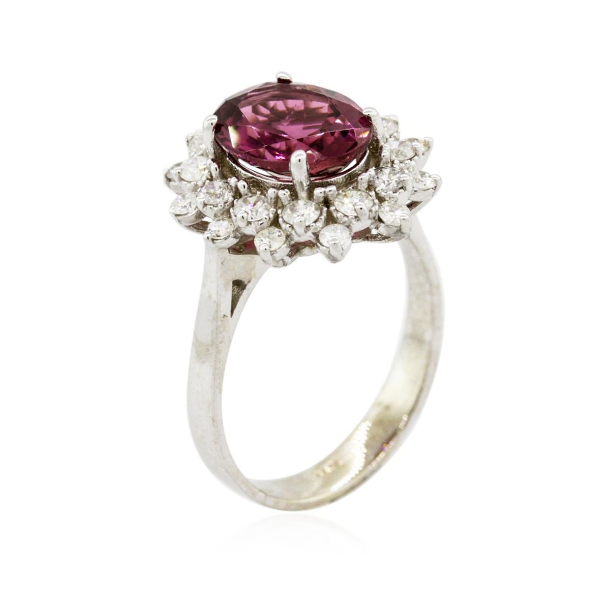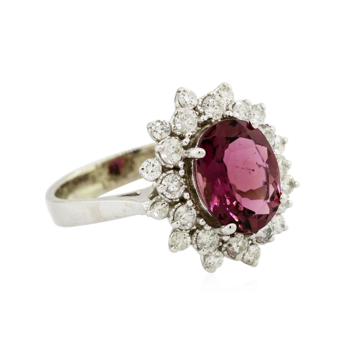 One electronically tested 14KT white gold ladies cast pink tourmaline and diamond ring with a bright polish finish. The featured pink tourmaline is set within a diamond floret bezel, completed by a three millimeter wide band. Identified with markings of "14K". Condition is new, good workmanship. Containing: One prong set oval mixed cut natural pink tourmaline, measuring 9.90 x 7.90 x 4.60mm, 6% bulge factor, approximate weight of 2.36ct., clarity is slightly included, type II, medium, very slightly brownish, strongly purplish red color, (GIA stpR 5/3), cut is good. Transmitting light with a minimum of distortion, transparent. Naturally occurring internal & external characteristics are present. Graded in the setting. This color of tourmaline is commonly irradiated to improve or change the color. Whether or not this gemstone has been irradiated cannot currently be determined. Twelve prong set round brilliant cut diamonds, measuring 2.10 - 2.00 x 1.23mm (depth est.) approximate total weight of 12 Stones = 0.47ct. Graded in the setting. Clarity: I-1 to I-2. Color: G - I Twelve prong set round brilliant cut diamonds, measuring 1.80 - 1.70 x 1.05mm (depth est.) approximate total weight of 12 Stones = 0.33ct. Graded in the setting. Clarity: I-1 to I-2. Color: G - I. Total Weight of Colored Stones 2.36ct. Total Weight of Diamonds 0.80ct. Total Weight of Ring 4.36 grams. AIG Appraised at $2,970.00.