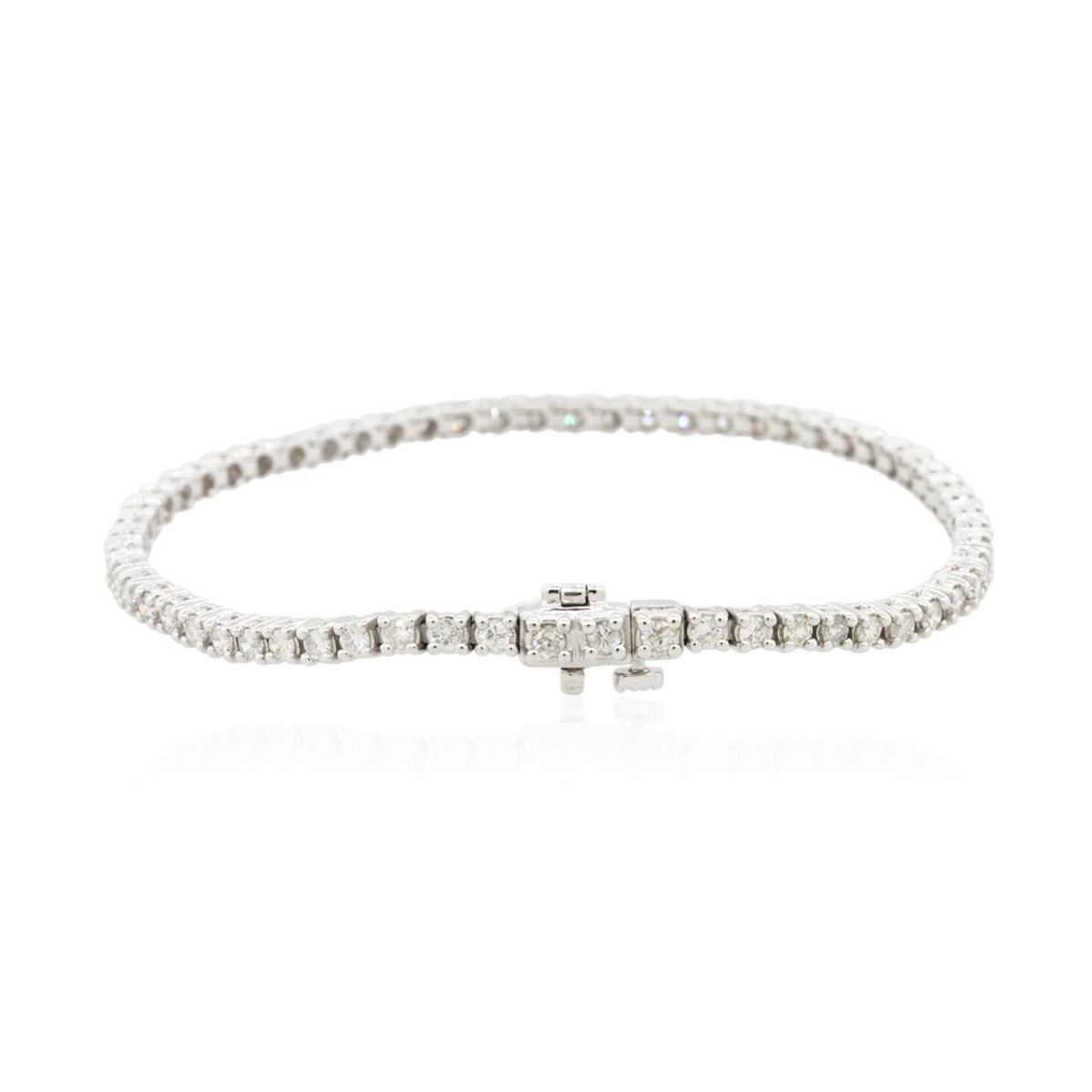One electronically tested 14KT white gold Ladies combination cast & assembled tennis bracelet with a hidden box clasp with a bright polish finish. Condition is new. Measurements: 7" in length. Identified with markings of "14K". Containing: Sixty-One prong set round brilliant cut diamonds, measuring 2.20 - 2.20 x 1.32mm (depth est.) approximate. Total Weight of 61 Stones = 2.37ct. Clarity: I-1 to I-3. Color: I - J, Cut is Good. Total Weight of Diamonds 2.37ct. Total Weight of Bracelet 10.80 grams. GGL Appraised at $7,210.00.