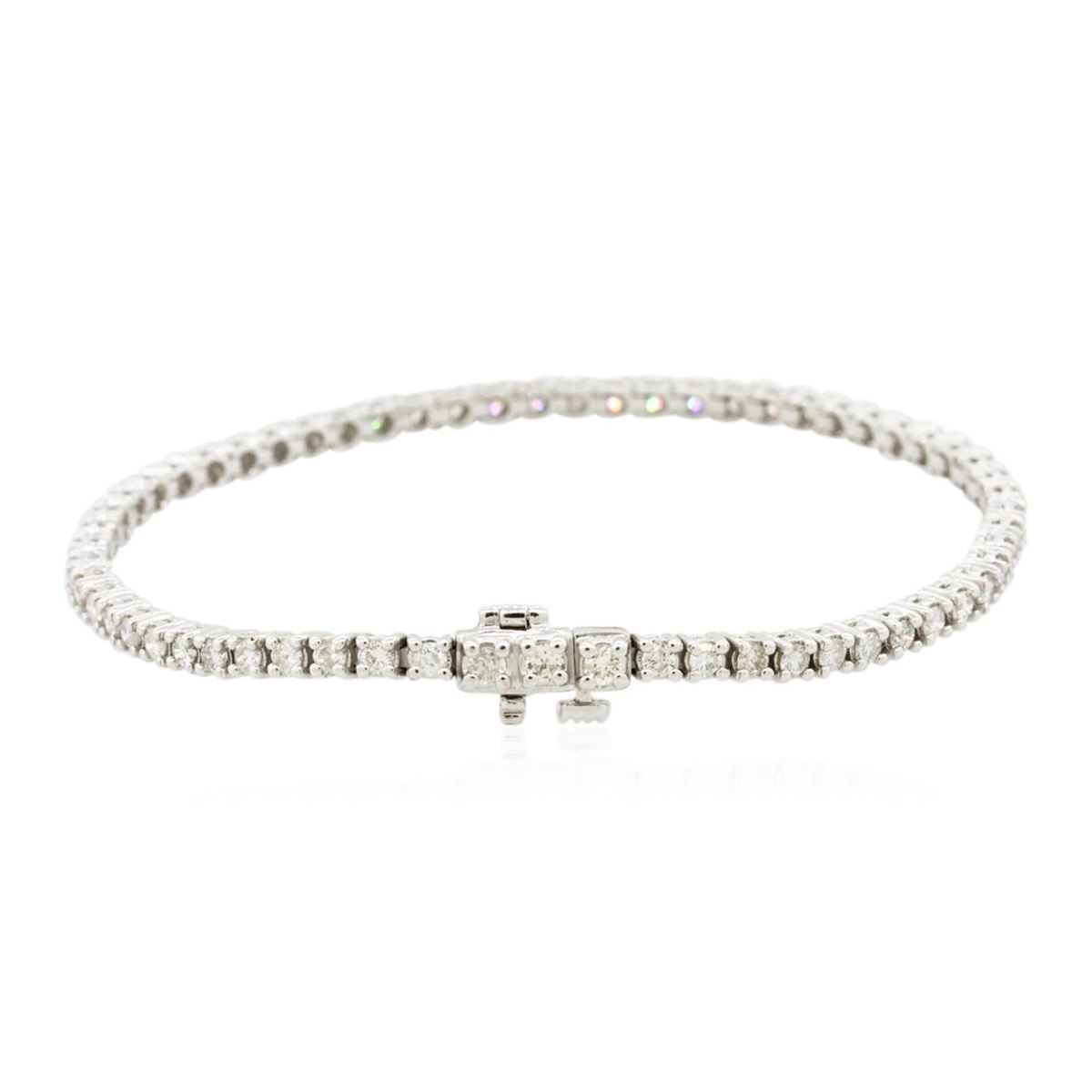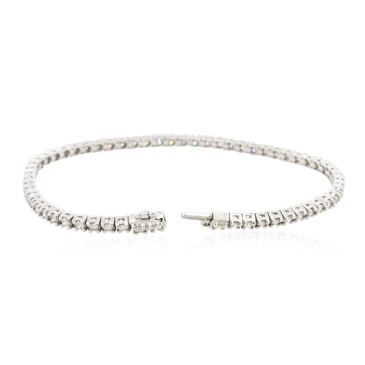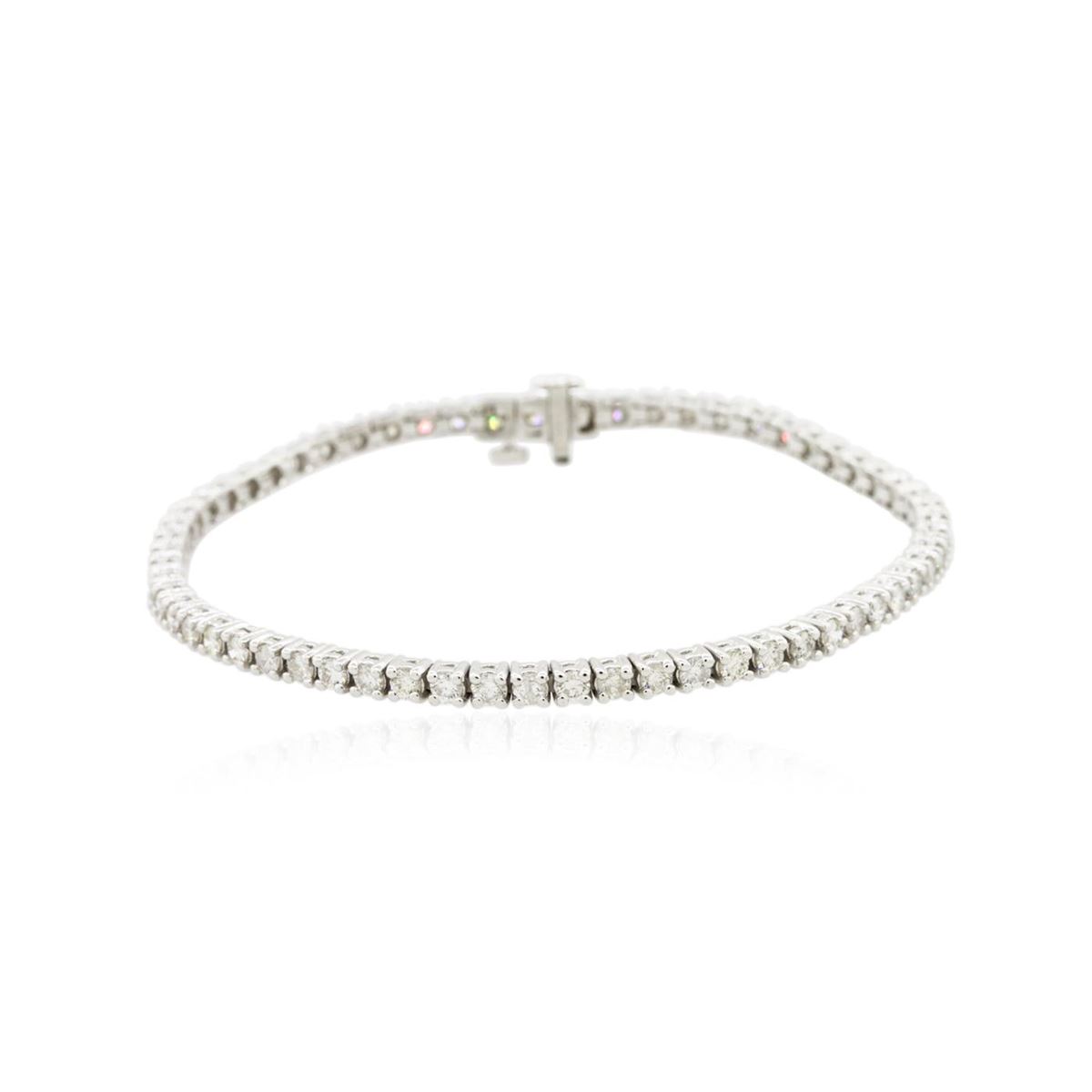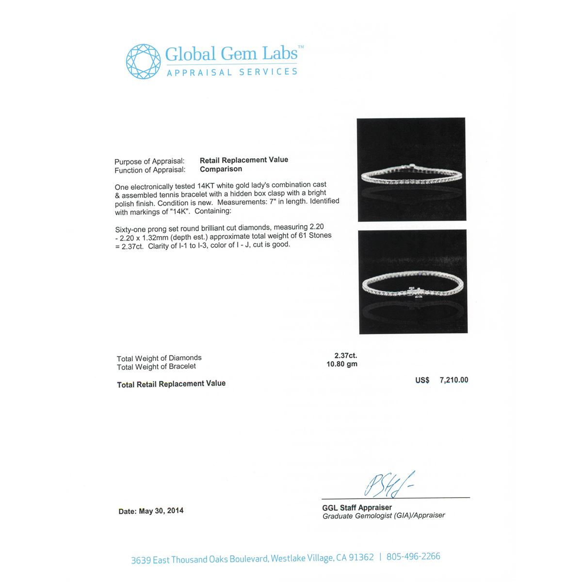 One electronically tested 14KT white gold Ladies combination cast & assembled tennis bracelet with a hidden box clasp with a bright polish finish. Condition is new. Measurements: 7" in length. Identified with markings of "14K". Containing: Sixty-One prong set round brilliant cut diamonds, measuring 2.20 - 2.20 x 1.32mm (depth est.) approximate. Total Weight of 61 Stones = 2.37ct. Clarity: I-1 to I-3. Color: I - J, Cut is Good. Total Weight of Diamonds 2.37ct. Total Weight of Bracelet 10.80 grams. GGL Appraised at $7,210.00.