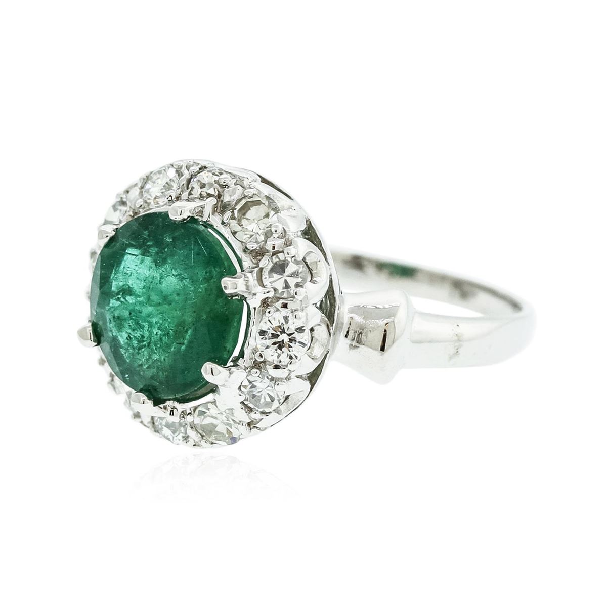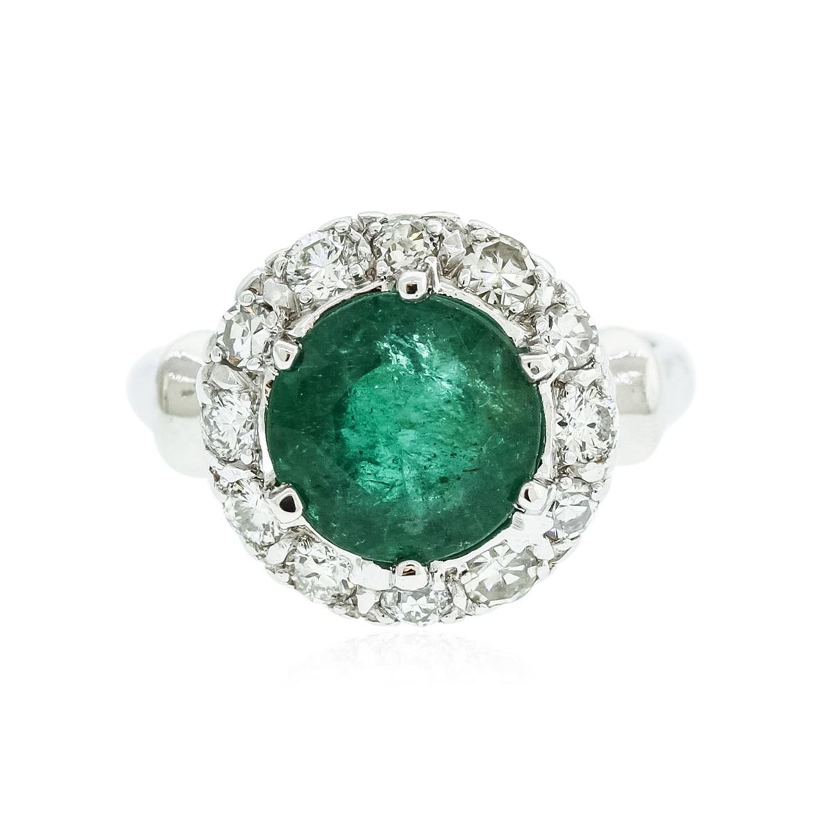 One electronically tested 14KT white gold ladies cast emerald and diamond ring with a bright polish finish. Condition is good. The featured emerald is set within a stylized diamond bezel supported by tapering shoulders, completed by a one and one-half millimeter wide band. Identified with markings of "14K". Containing: One prong set round mixed cut natural emerald, measuring 8.65 - 8.60 x 5.50 mm, 6%. bulge factor, approximate weight of 2.37ct., clarity is heavily included, type III, medium dark, moderately strong, very slightly bluish green color, (GIA vslbG 6/4), cut is good. Transmitting light with a minimum of distortion, transparent. Naturally occurring internal & external characteristics are present. Indications of oil residue. Graded in the setting. Twelve prong set round cut diamonds, measuring 2.70 x 2.40 x 1.53mm (depth est.) approximate. Total Weight of 12 Stones = 0.85ct. The group contains a mix of round brilliant, single cut and old European cut diamonds. Graded in the setting. Clarity: VS-1 to SI-1. Color: G - I. Total Weight of Colored Stones 2.37ct. Total Weight of Diamonds 0.85ct. Total Weight of Ring 8.69 grams. AIG Appraised at $6,705.00.