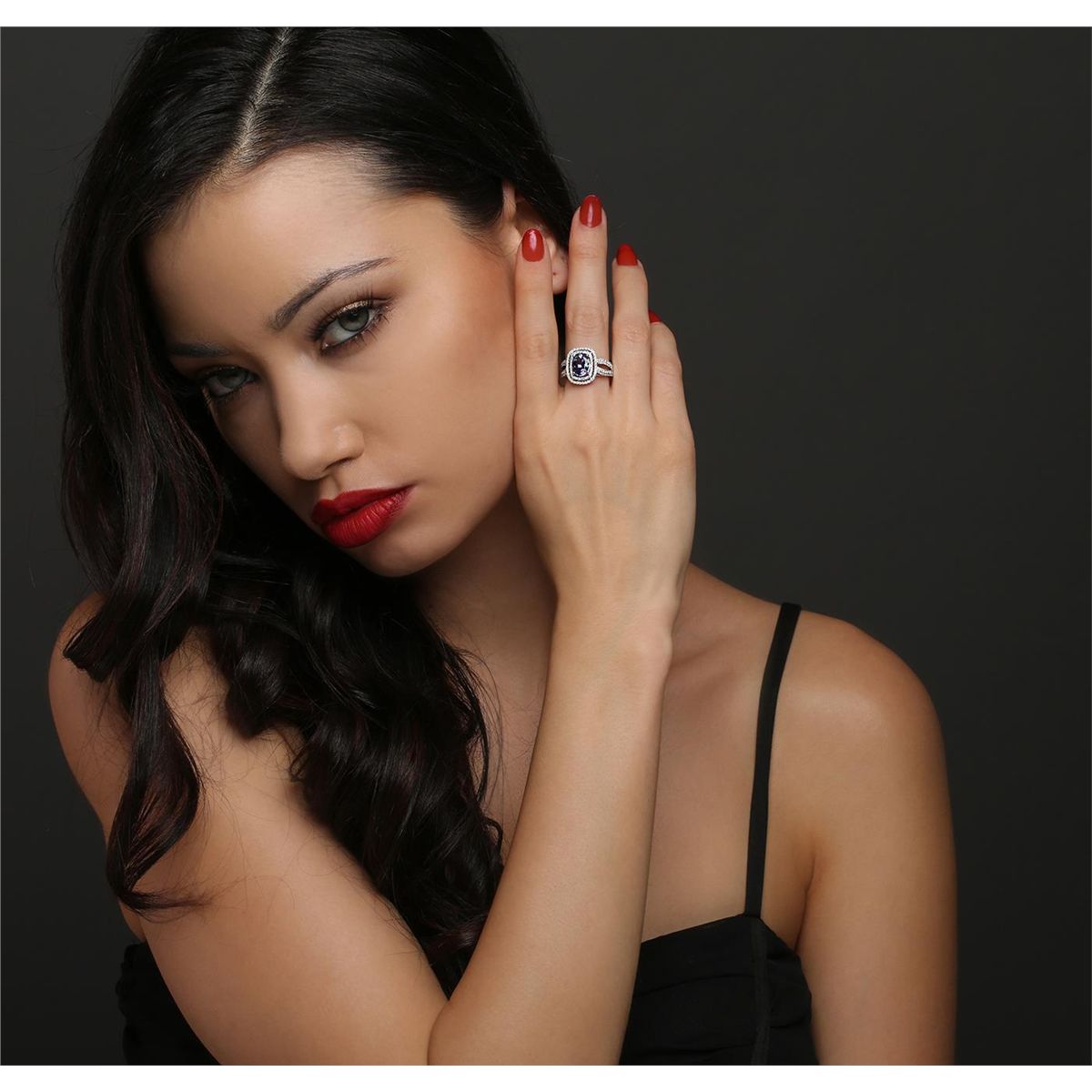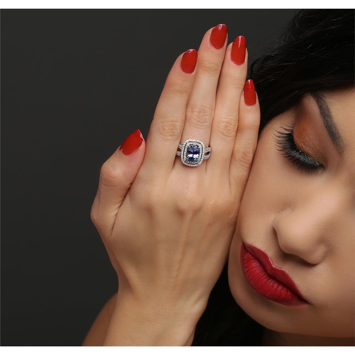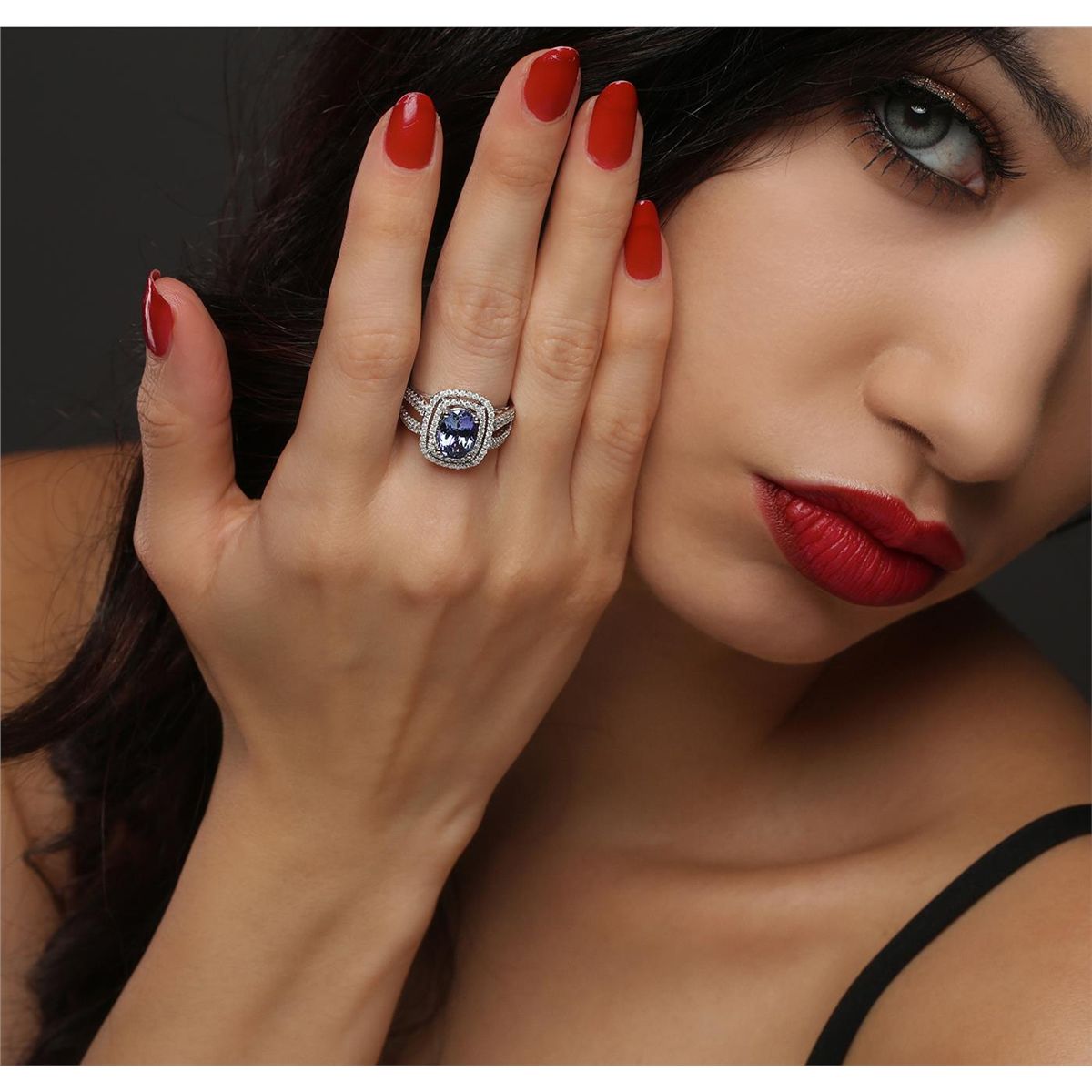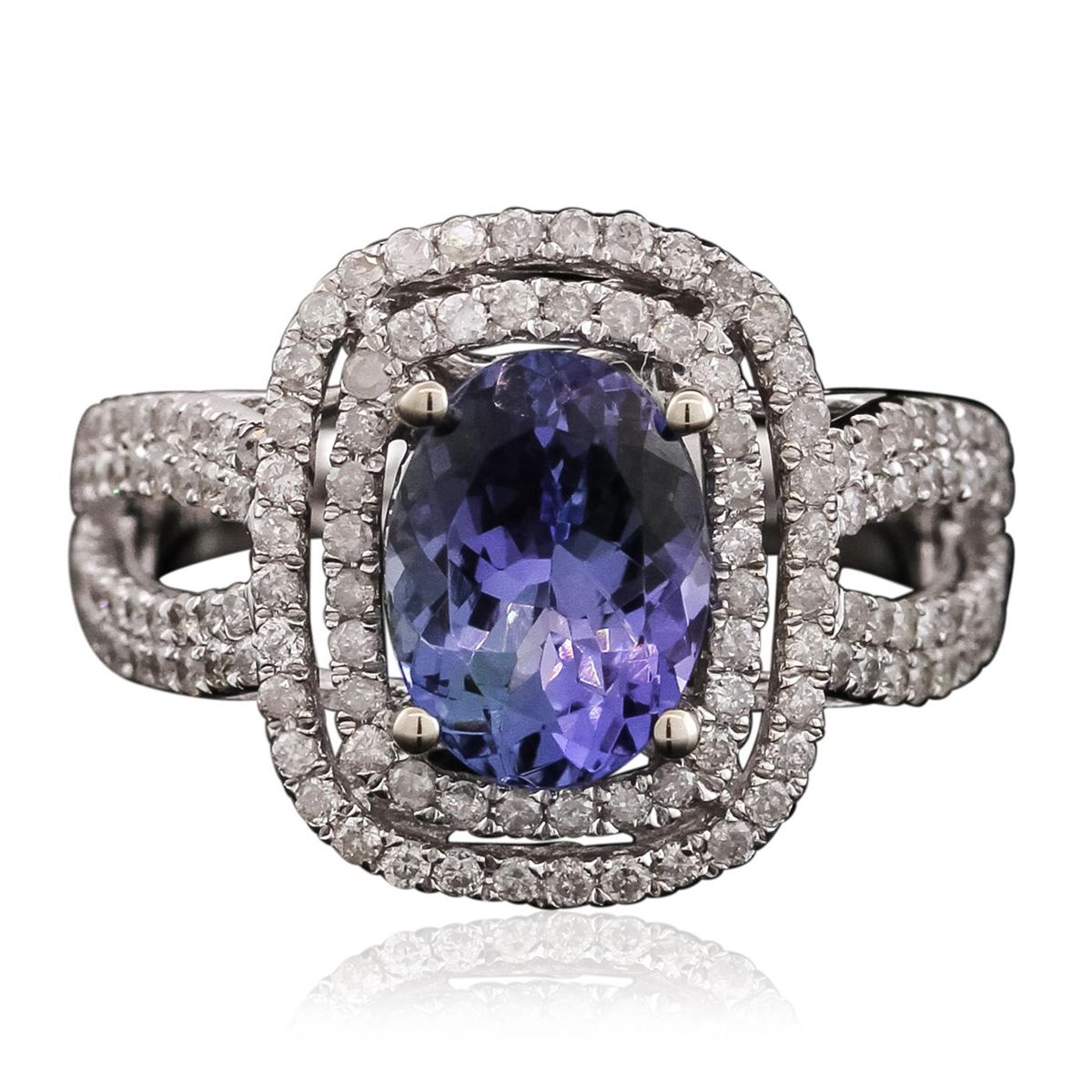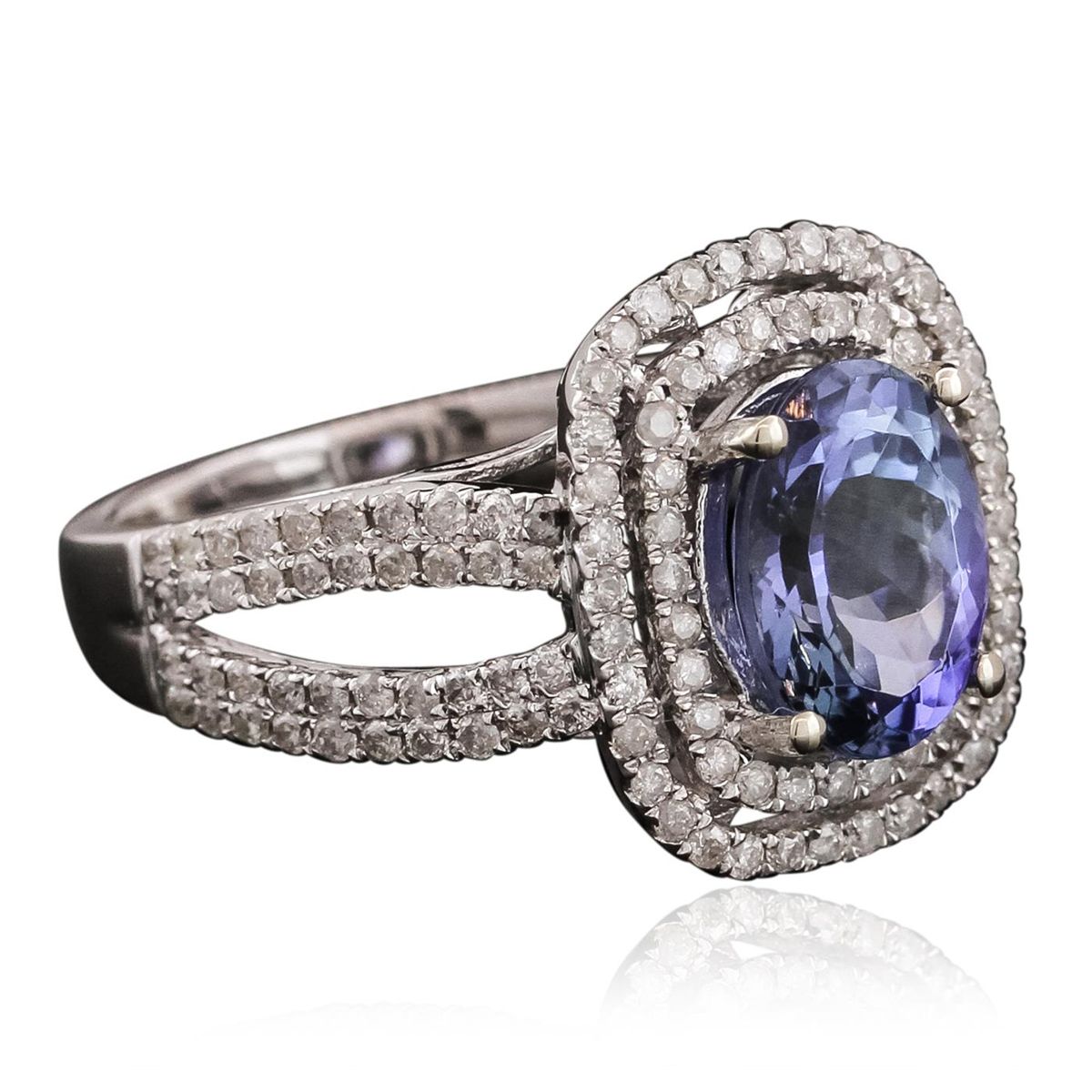 One electronically tested 14KT white gold ladies cast tanzanite and diamond ring with a bright polish finish. The featured tanzanite is set within two tiered diamond bezels supported by diamond set split shoulders, completed by a two and one-half millimeter wide band. Trademark is Orianne. Identified with markings of "14K". Condition is new, good workmanship. Containing: One prong set oval brilliant cut natural tanzanite, measuring 9.50 x 7.01 x 4.90mm, 6% bulge factor, approximate weight of 2.37ct., clarity is eye clean, type I, medium, very slightly grayish, bluish violet color, (GIA bV 5/3), cut is good. Transmitting light with no distortion, transparent. Graded in the setting. Tanzanite is a very rare gemstone that is only found in the country of Tanzania. Originally discovered in 1967. Tiffany & Company, named the stone Tanzanite. It is found in the Usumburu Mountains that border the Umba Valley of northern Tanzania. Tanzanite occurs in gray, brown, violet, blue, reddish-purple, & green. The gem is interesting because of its exceptional pleochroism. Rotated in different directions a tanzanite will exhibit multiple changes of color. Tanzanite has a low tolerance to ultrasonic cleaning, and should not be cleaned using this method. One Hundred Forty prong set round brilliant cut diamonds, measuring 1.20 - 1.10 x 0.69mm (depth est.) approximate total weight of 140 Stones = 0.87ct. Graded in the setting. Clarity: I-1 to I-3. Color: H - J. Total Weight of Colored Stones 2.37ct. Total Weight of Diamonds 0.87ct. Total Weight of Ring 5.95 grams. AIG Appraised at $8,340.00.