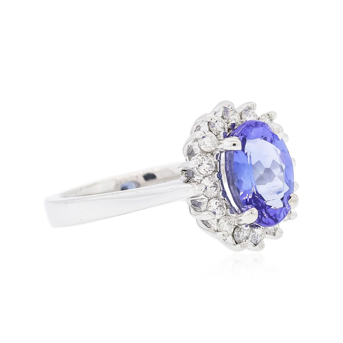 One electronically tested 14KT white gold ladies cast tanzanite and diamond ring with a bright polish finish. The featured tanzanite is set within a diamond bezel, completed by a two and one-half millimeter wide band. Identified with markings of "14K". Condition is new, good workmanship. Containing: One prong set oval mixed cut natural tanzanite, measuring 9.25 x 7.50 x 4.75mm, 6% bulge factor, approximate weight of 2.37ct., clarity is eye clean, type I, medium dark, very slightly grayish, bluish violet color, (GIA bV 6/3), cut is good. Transmitting light with no distortion, transparent. Graded in the setting. Tanzanite is a very rare gemstone that is only found in the country of Tanzania. Originally discovered in 1967. Tiffany & Company, named the stone Tanzanite. It is found in the Usumburu Mountains that border the Umba Valley of northern Tanzania. Tanzanite occurs in gray, brown, violet, blue, reddish-purple, & green. The gem is interesting because of its exceptional pleochroism. Rotated in different directions a tanzanite will exhibit multiple changes of color. Tanzanite has a low tolerance to ultrasonic cleaning, and should not be cleaned using this method. Sixteen prong set round brilliant cut diamonds, measuring 2.10 - 2.00 x 1.23mm (depth est.) approximate total weight of 16 Stones = 0.60ct. Graded in the setting. Clarity: SI-2 to I-1. Color: H - J. Total Weight of Colored Stones 2.37ct. Total Weight of Diamonds 0.60ct. Total Weight of Ring 5.13 grams. AIG Appraised at $7,730.00.