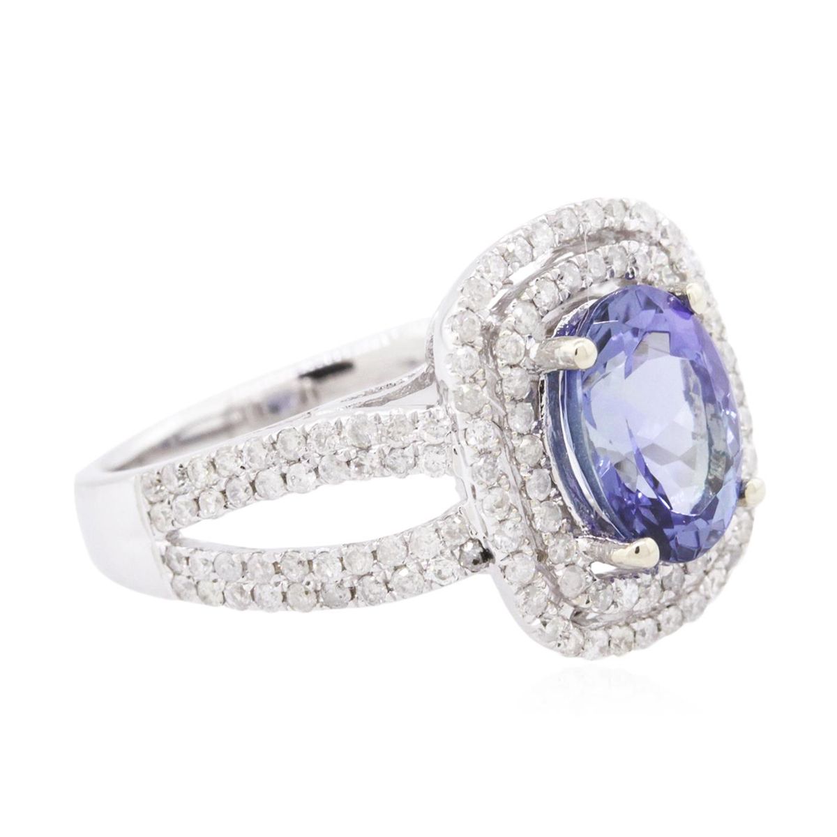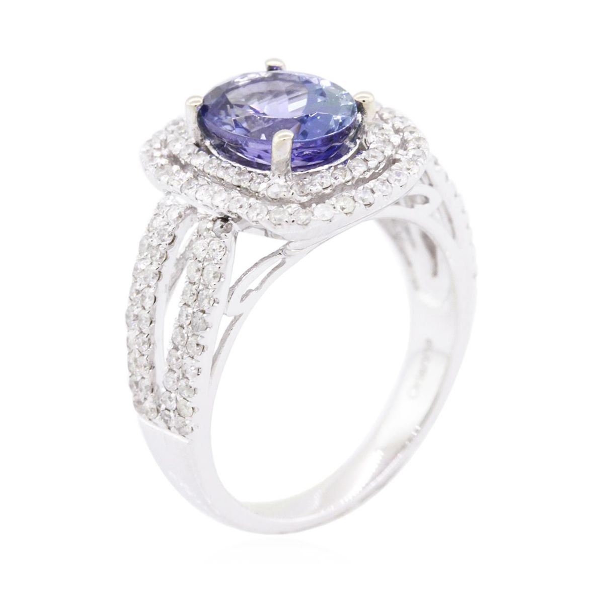 One electronically tested 14KT white gold ladies cast tanzanite and diamond ring with a bright polish finish. The featured tanzanite is set within two tiered diamond bezels supported by diamond set split shoulders, completed by a two and one-half millimeter wide band. Trademark is Orianne. Identified with markings of "14K". Condition is new, good workmanship. Containing: One prong set oval brilliant cut natural tanzanite, measuring 9.50 x 7.01 x 4.90mm, 6% bulge factor, approximate weight of 2.37ct., clarity is eye clean, type I, medium, very slightly grayish, bluish violet color, (GIA bV 5/3), cut is good. Transmitting light with no distortion, transparent. Graded in the setting. Tanzanite is a very rare gemstone that is only found in the country of Tanzania. Originally discovered in 1967. Tiffany & Company, named the stone Tanzanite. It is found in the Usumburu Mountains that border the Umba Valley of northern Tanzania. Tanzanite occurs in gray, brown, violet, blue, reddish-purple, & green. The gem is interesting because of its exceptional pleochroism. Rotated in different directions a tanzanite will exhibit multiple changes of color. Tanzanite has a low tolerance to ultrasonic cleaning, and should not be cleaned using this method. One Hundred Forty prong set round brilliant cut diamonds, measuring 1.20 - 1.10 x 0.69mm (depth est.) approximate total weight of 140 Stones = 0.87ct. Graded in the setting. Clarity: I-1 to I-3. Color: H - J. Total Weight of Colored Stones 2.37ct. Total Weight of Diamonds 0.87ct. Total Weight of Ring 5.95 grams. AIG Appraised at $8,340.00.
