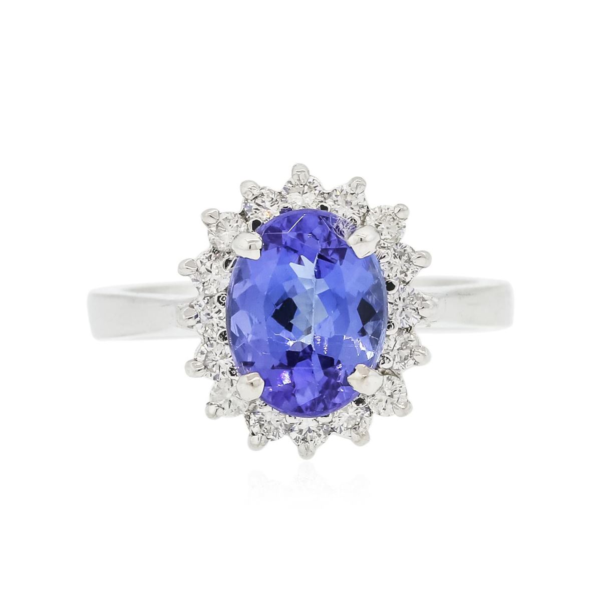 One electronically tested 14KT white gold ladies cast tanzanite and diamond ring with a bright polish finish. The featured tanzanite is set within a diamond bezel, completed by a two and one-half millimeter wide band. Identified with markings of "14K". Condition is new, good workmanship. Containing: One prong set oval mixed cut natural tanzanite, measuring 9.25 x 7.50 x 4.75mm, 6% bulge factor, approximate weight of 2.37ct., clarity is eye clean, type I, medium dark, very slightly grayish, bluish violet color, (GIA bV 6/3), cut is good. Transmitting light with no distortion, transparent. Graded in the setting. Tanzanite is a very rare gemstone that is only found in the country of Tanzania. Originally discovered in 1967. Tiffany & Company, named the stone Tanzanite. It is found in the Usumburu Mountains that border the Umba Valley of northern Tanzania. Tanzanite occurs in gray, brown, violet, blue, reddish-purple, & green. The gem is interesting because of its exceptional pleochroism. Rotated in different directions a tanzanite will exhibit multiple changes of color. Tanzanite has a low tolerance to ultrasonic cleaning, and should not be cleaned using this method. Sixteen prong set round brilliant cut diamonds, measuring 2.10 - 2.00 x 1.23mm (depth est.) approximate total weight of 16 Stones = 0.60ct. Graded in the setting. Clarity: SI-2 to I-1. Color: H - J. Total Weight of Colored Stones 2.37ct. Total Weight of Diamonds 0.60ct. Total Weight of Ring 5.13 grams. AIG Appraised at $7,730.00.