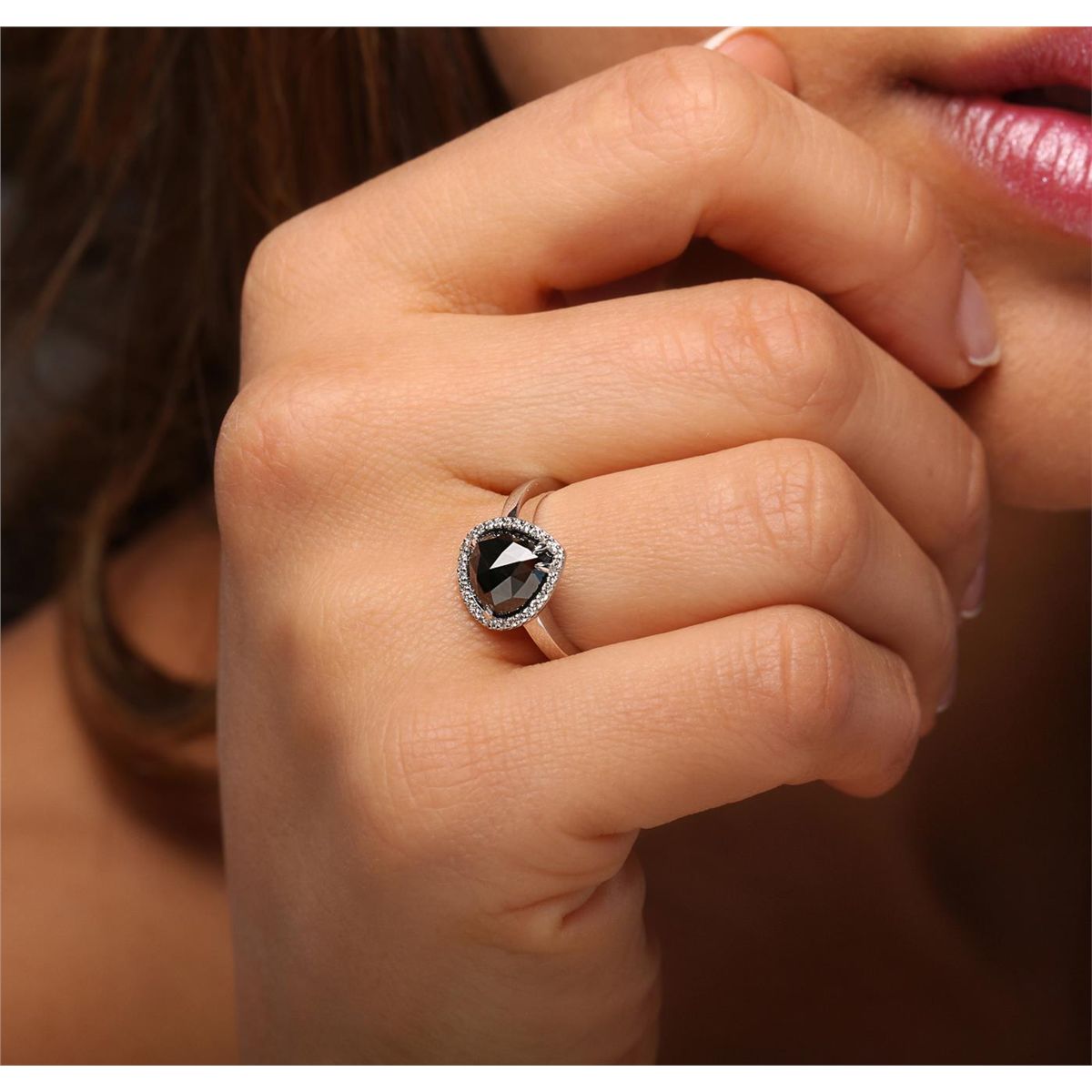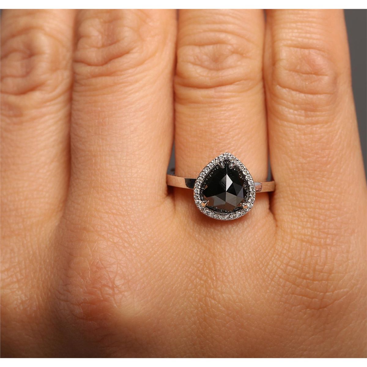 One 14KT white gold ring containing one natural pear rose cut fancy black diamond, enhanced for color, with a total weight of 2.25ct. The ring also contains side stones graded H-I-J color, SI1-SI3 clarity with a total weight of 0.12ct. Total weight of the ring is 3.20 grams. EGL Appraised at $2,790.00.
